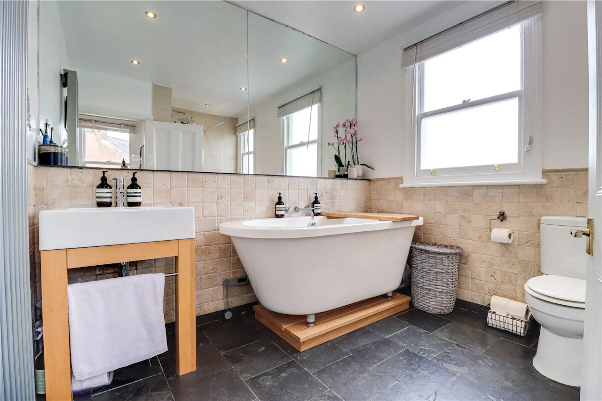 Accessed via a private ground floor entrance, the property offers generously proportioned accommodation comprising a stunning dual-aspect living room, a separate, well-appointed kitchen, and two spacious double bedrooms. These are complemented by a luxurious bathroom featuring a freestanding bath and a separate walk-in shower.