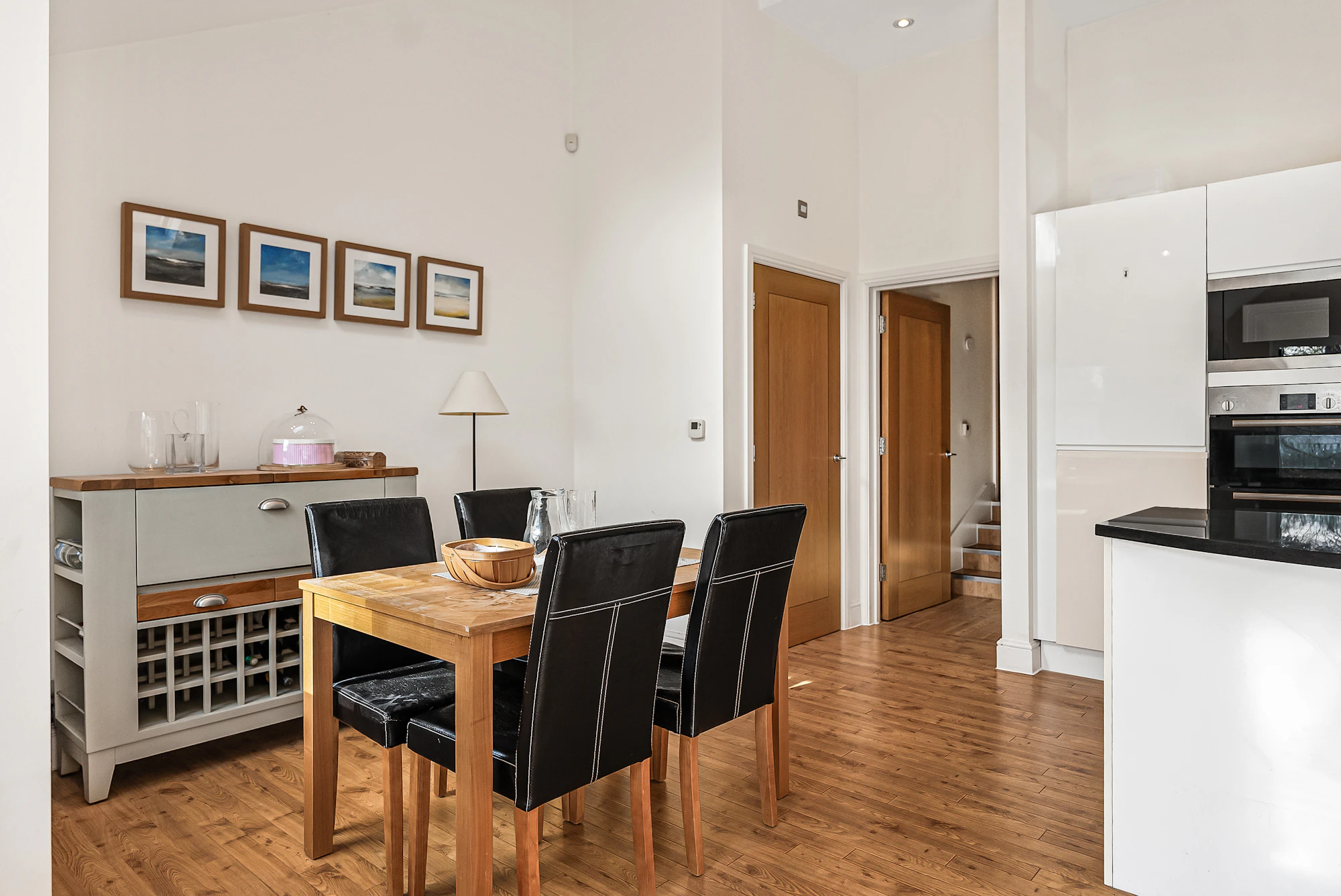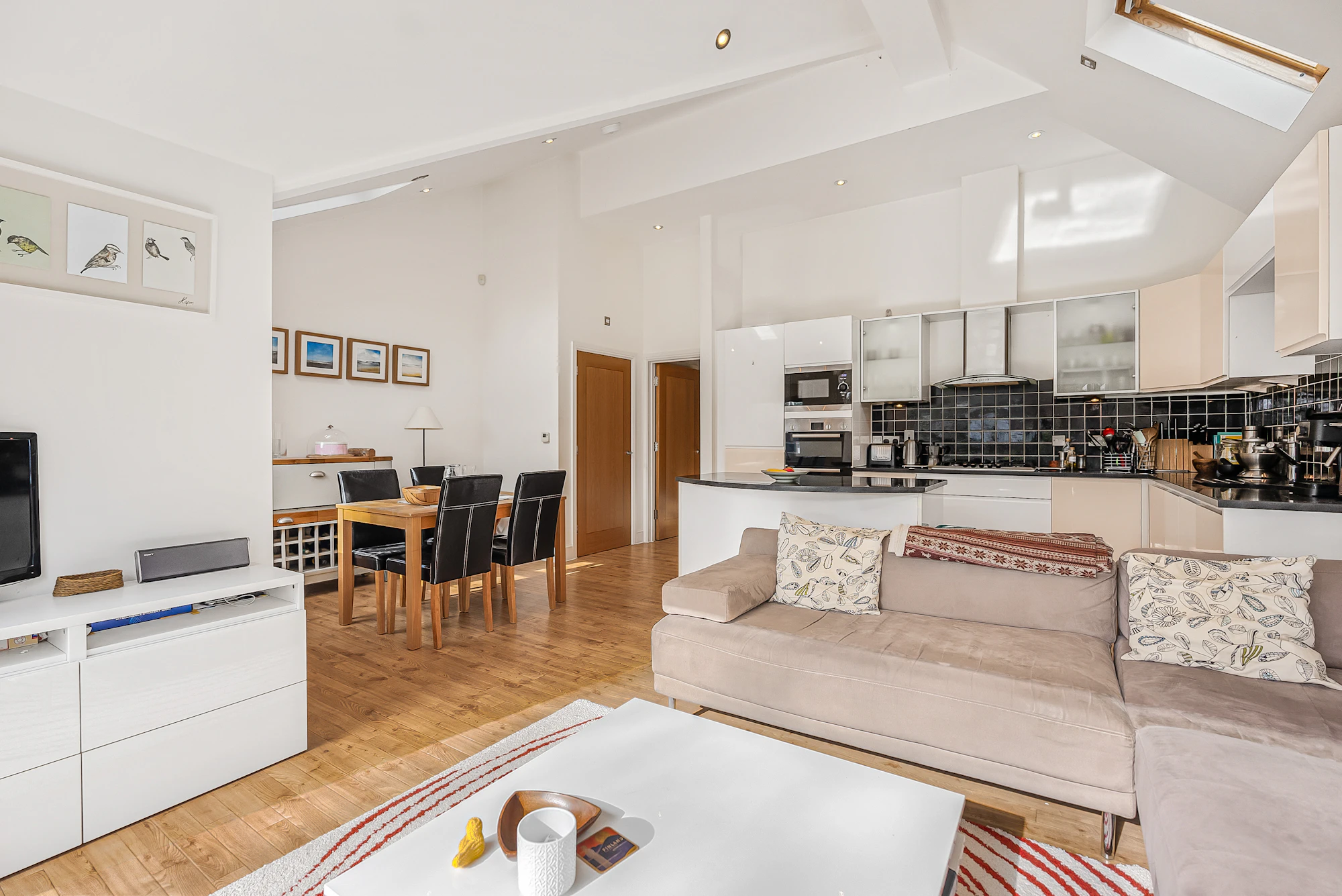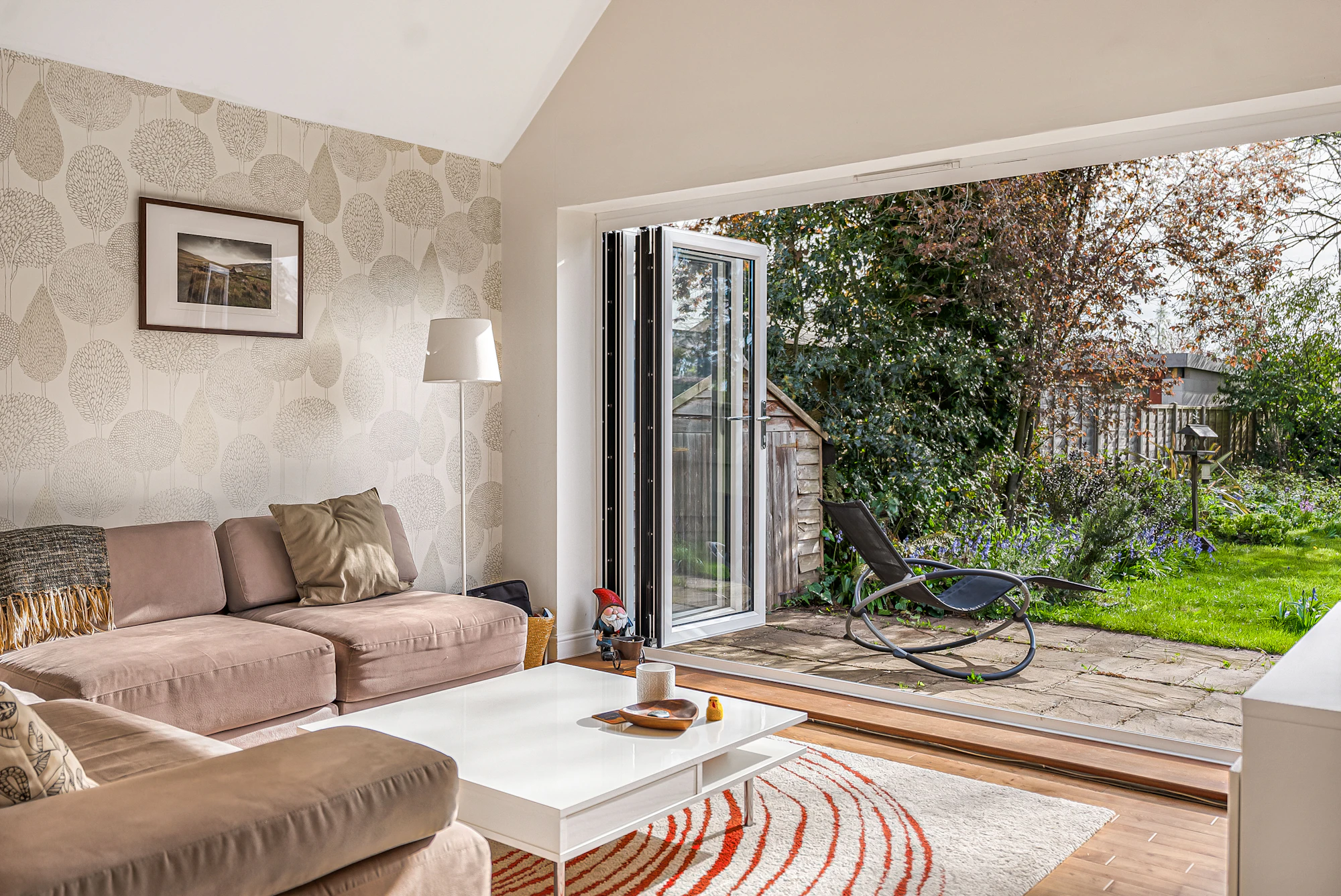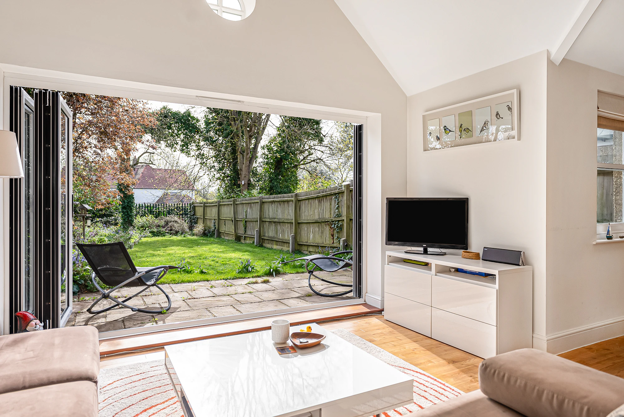 A few steps down from the hallway is a stunning open-plan living space at the rear of the house. This thoughtfully designed area incorporates a well-appointed kitchen with a rooflight above, planned to provide ample storage and incorporating a number of integrated appliances. There is ample space for informal dining, as well as a relaxed seating area that enjoys lovely views over the garden through bi-fold doors, perfect for indoor-outdoor living.