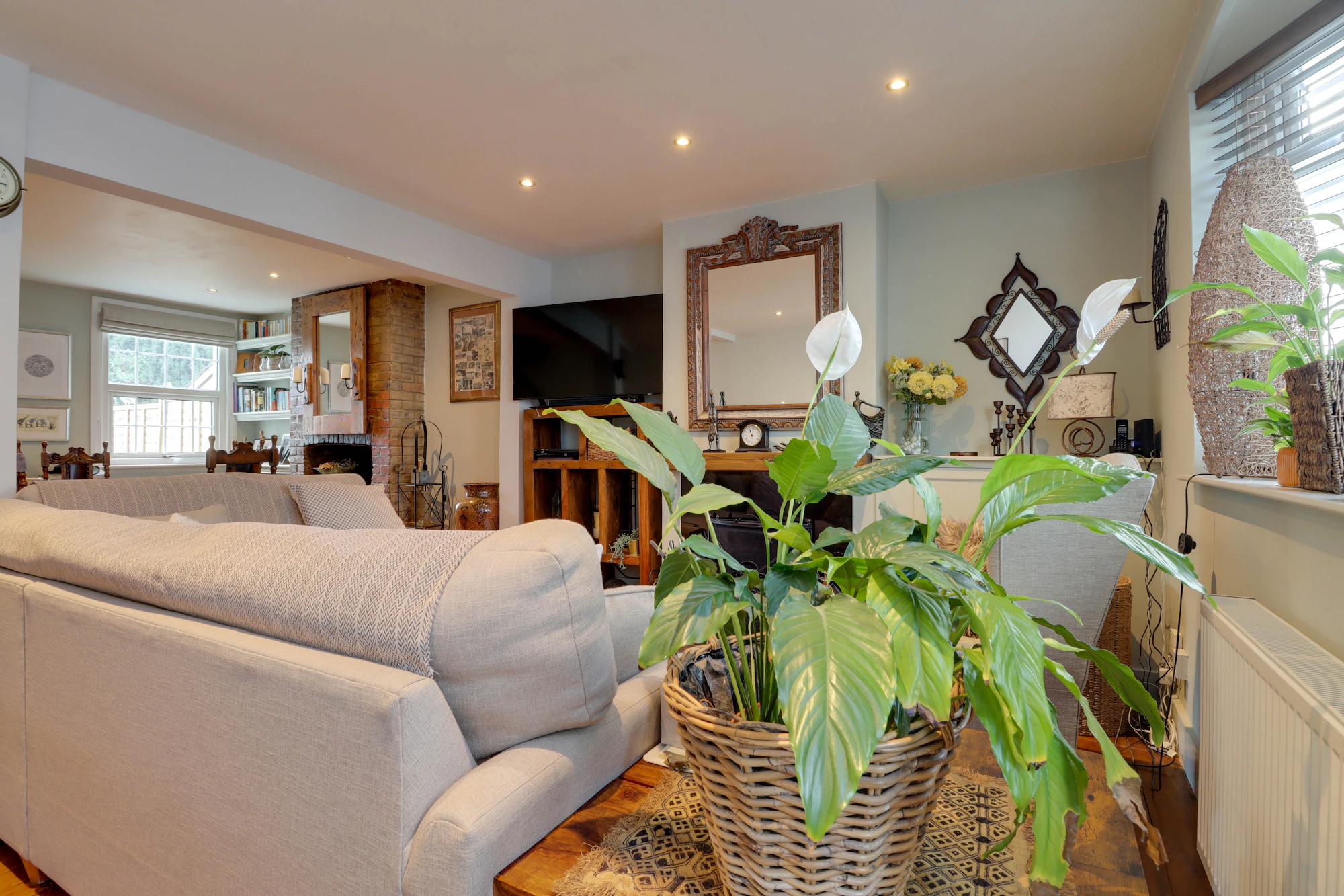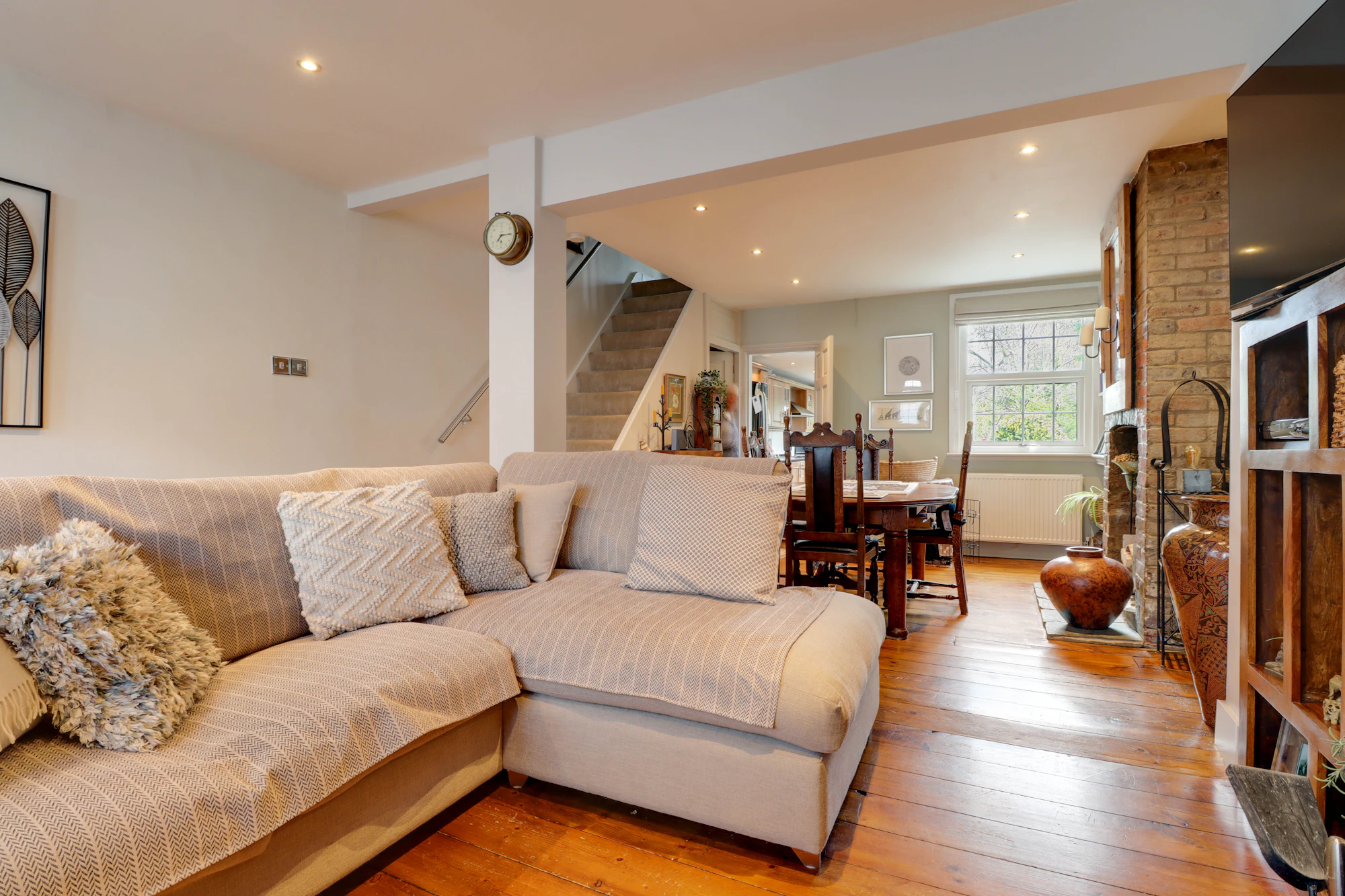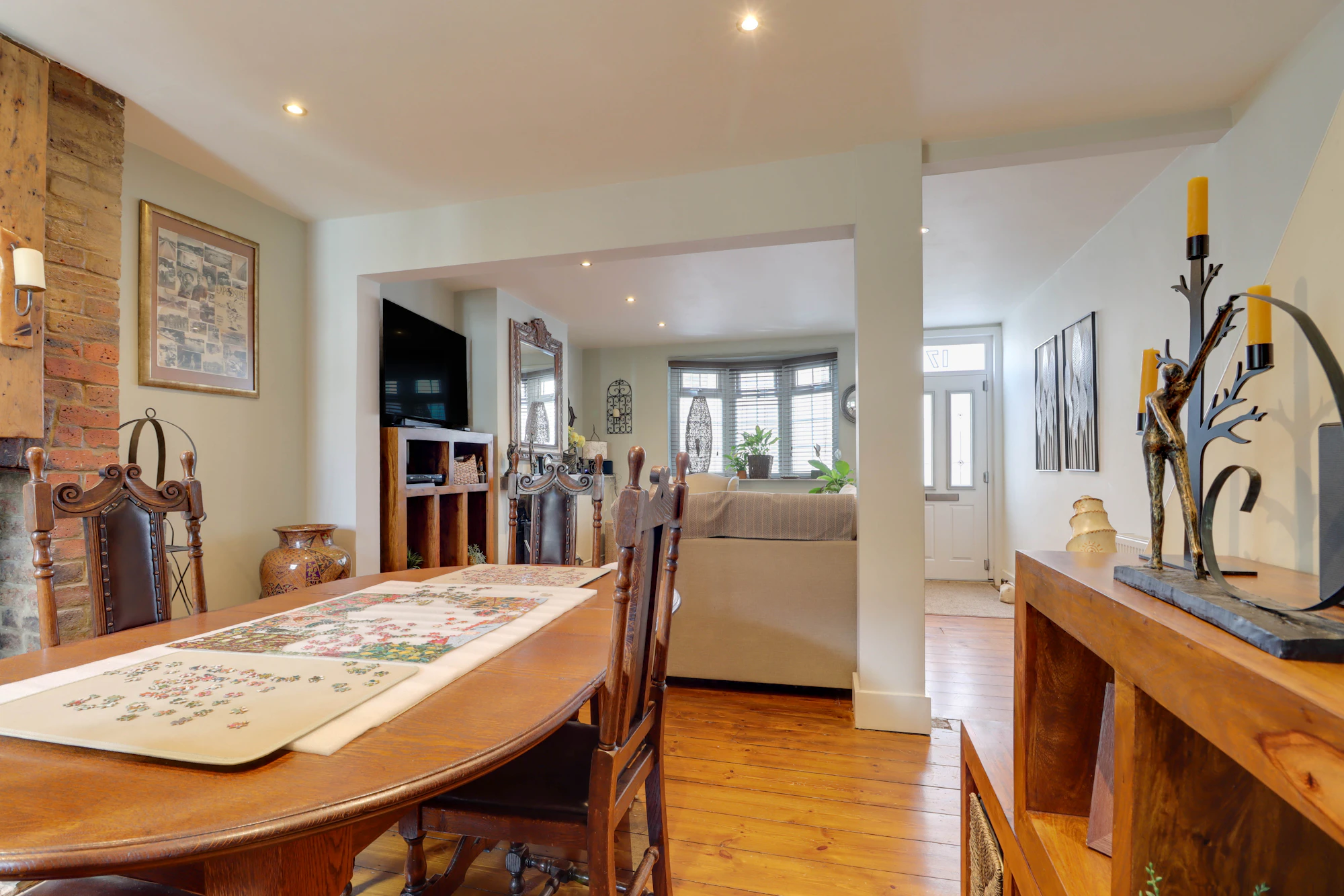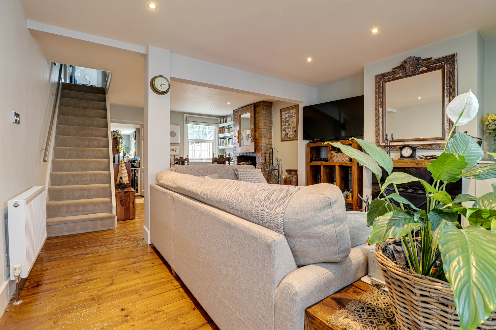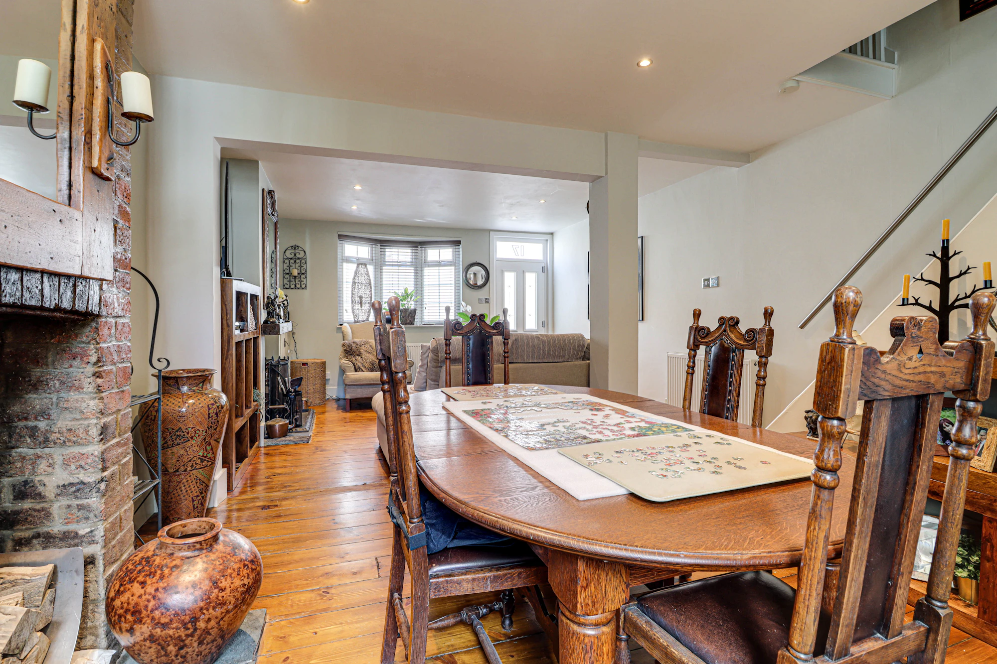 The ground floor opens into a spacious open-plan reception room, enhanced by timber flooring and a working open fireplace and comfortably accommodating both living and dining furniture. To the rear, a bright, extended kitchen provides a well-appointed range of fitted storage cupboards along with ample space for appliances, all bathed in natural light.