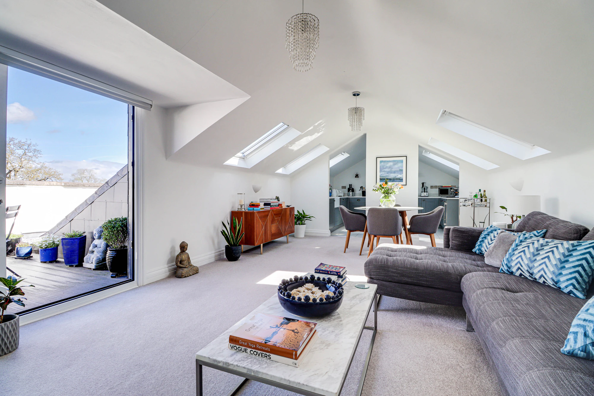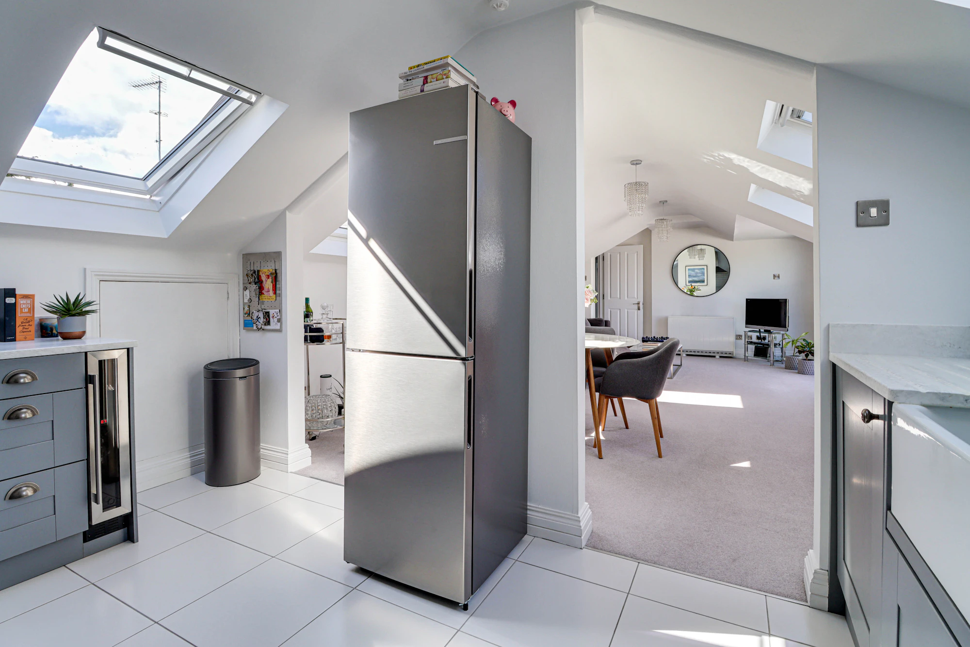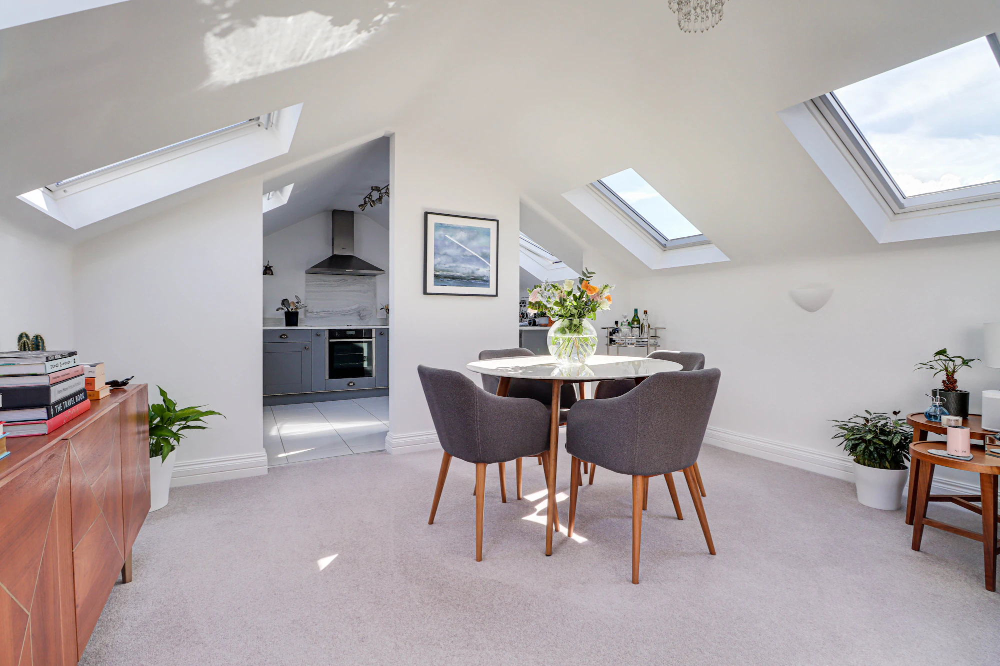 The property features a generous open-plan living and dining area, enhanced by vaulted ceilings and multiple skylights that flood the space with natural light, creating an airy and inviting atmosphere. The adjoining kitchen is well-appointed with ample storage and worktop space, making it ideal for both everyday living and entertaining.