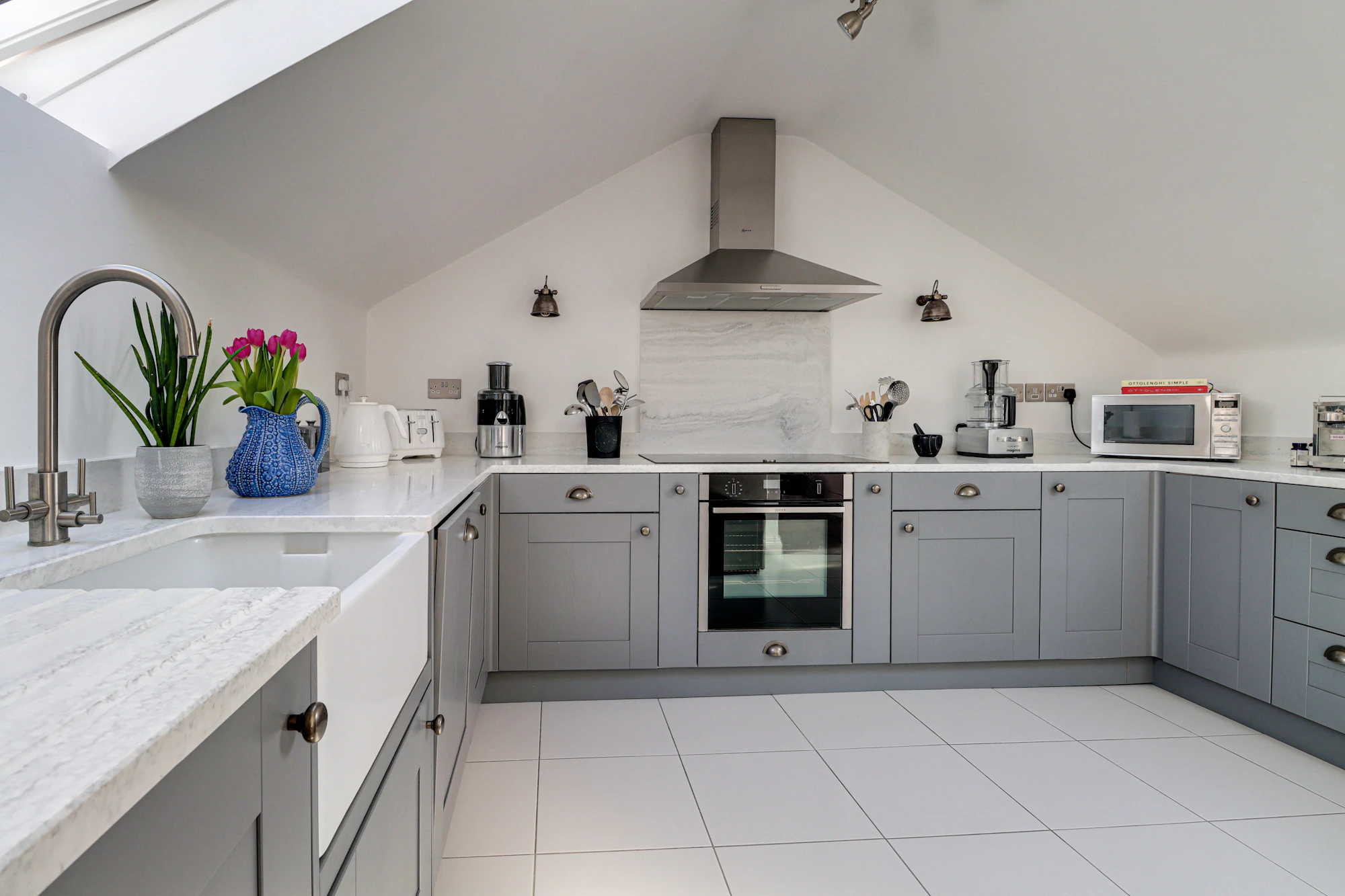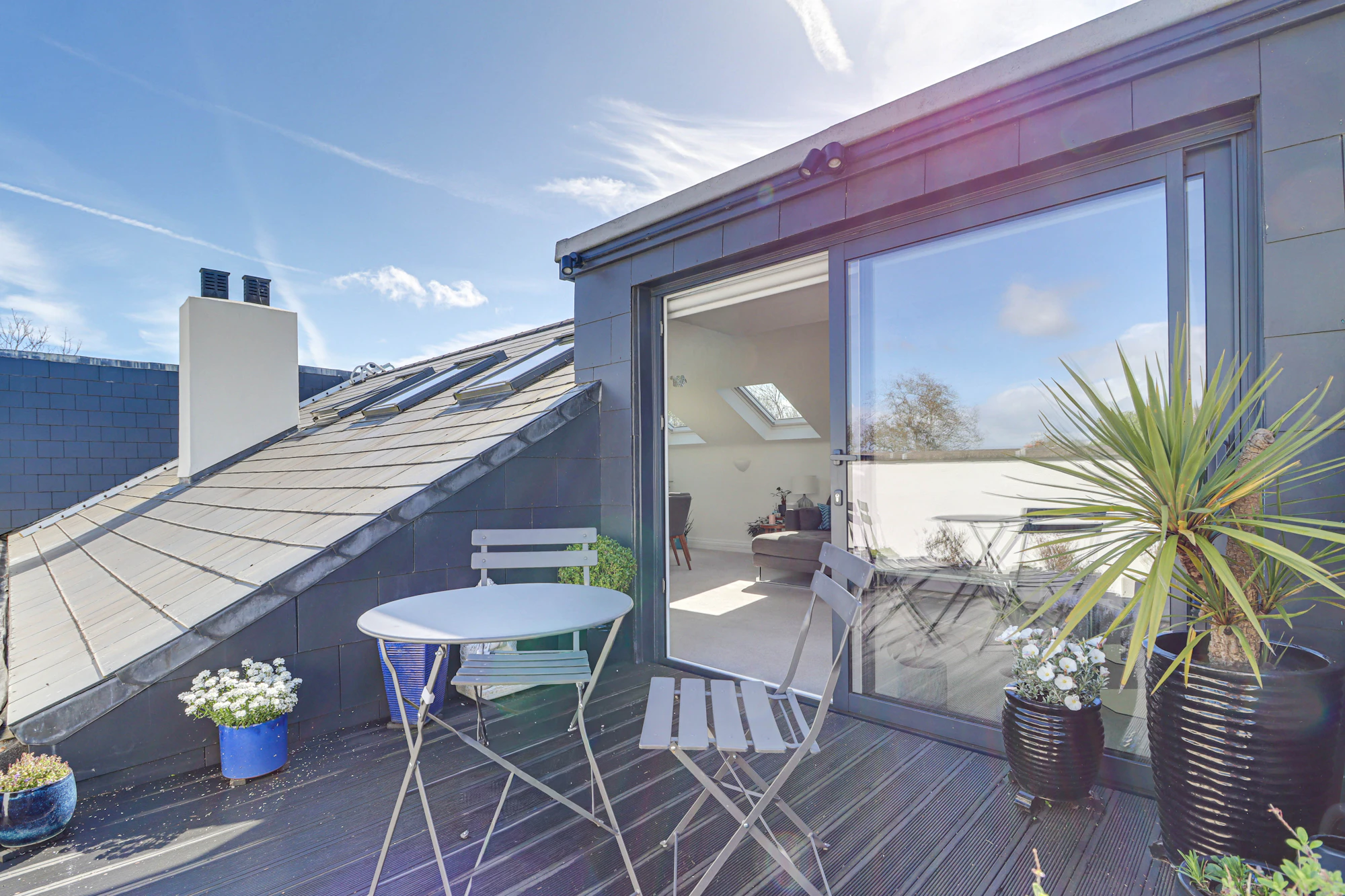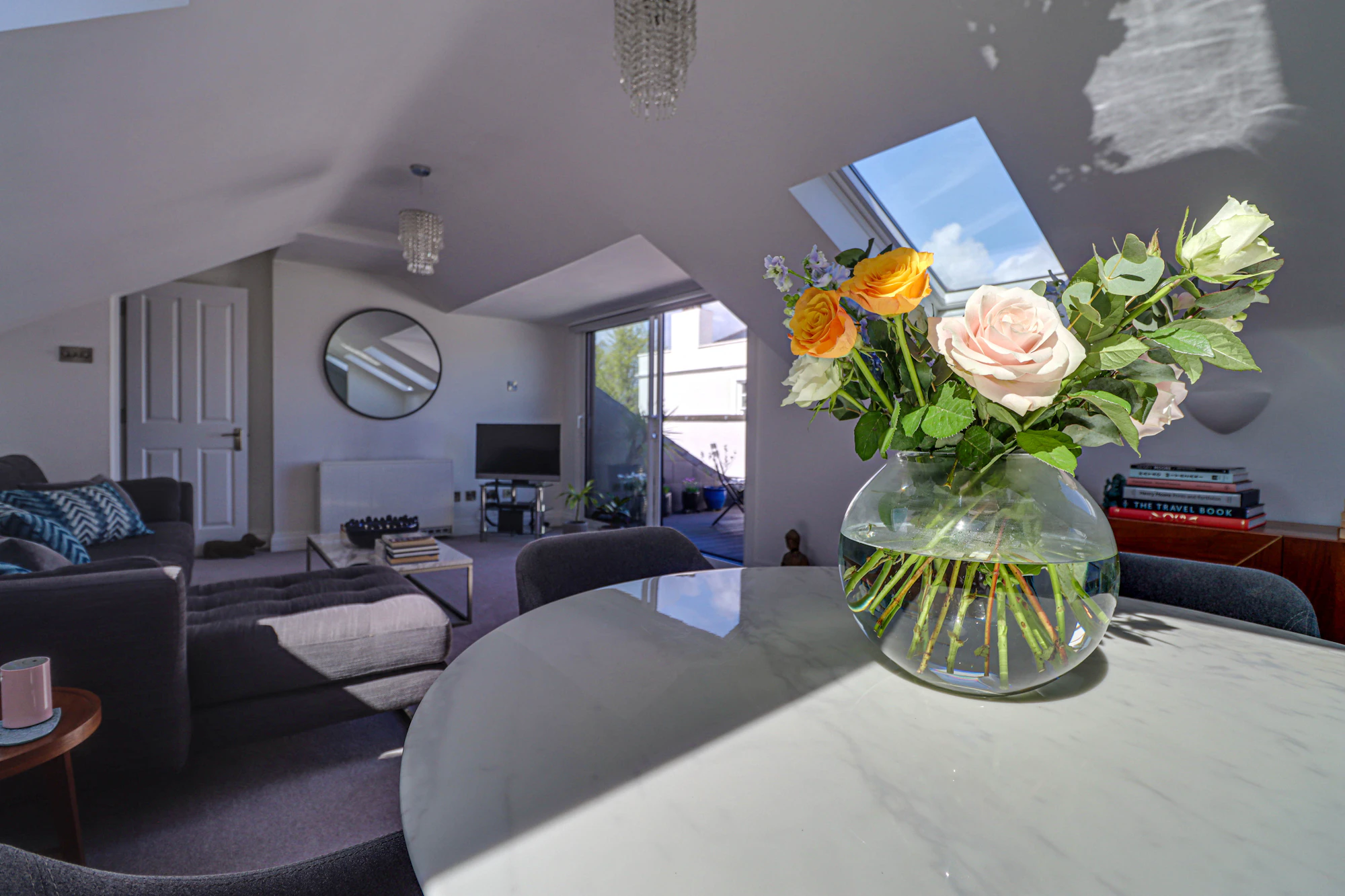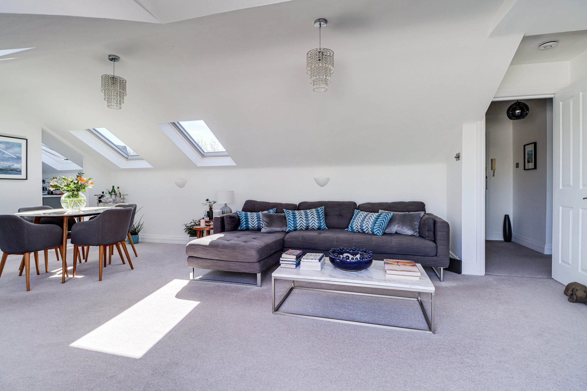 The property features a generous open-plan living and dining area, enhanced by vaulted ceilings and multiple skylights that flood the space with natural light, creating an airy and inviting atmosphere. The adjoining kitchen is well-appointed with ample storage and worktop space, making it ideal for both everyday living and entertaining.
