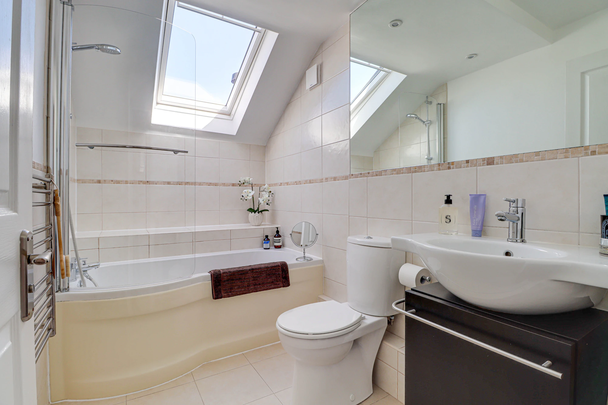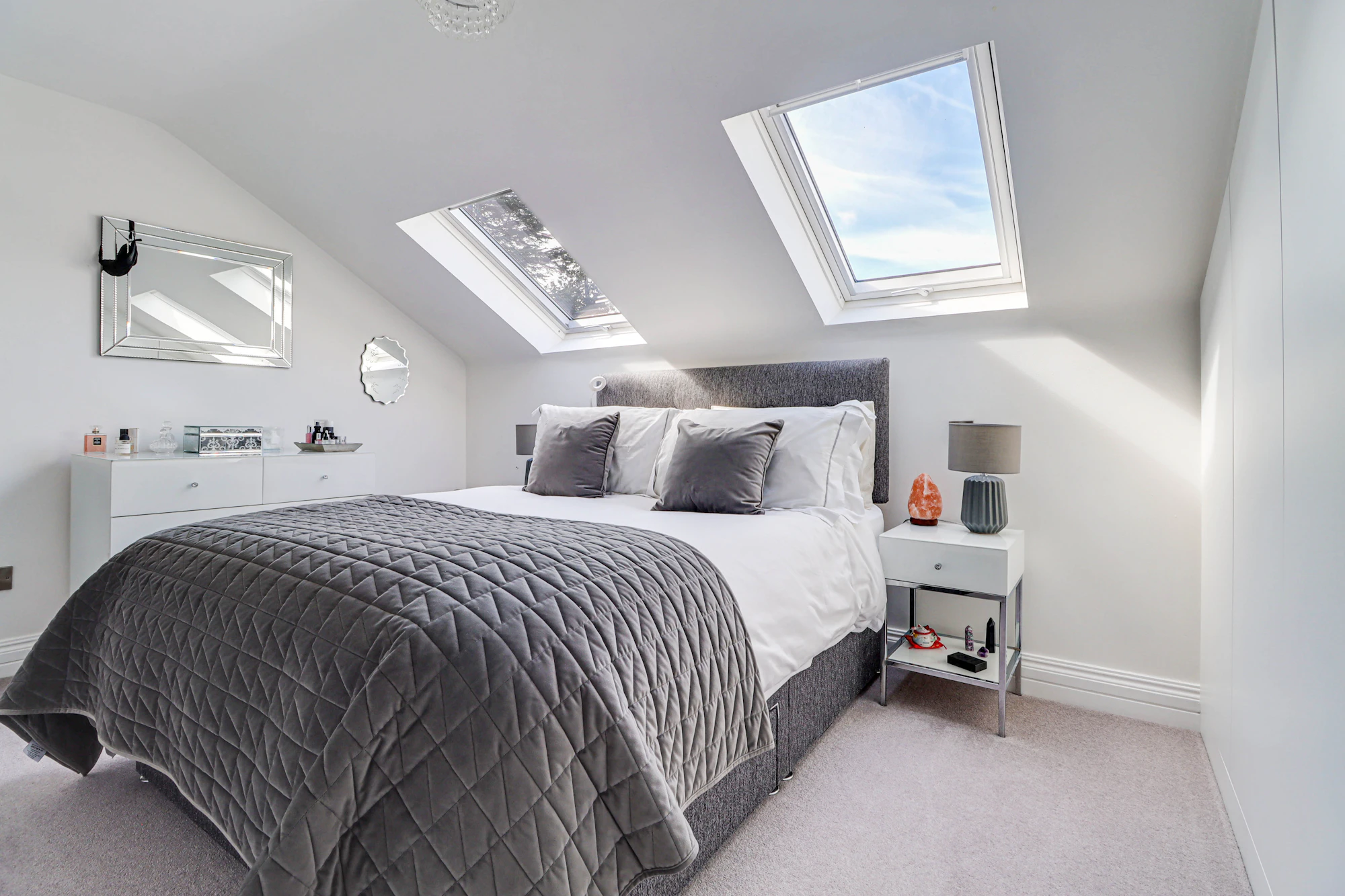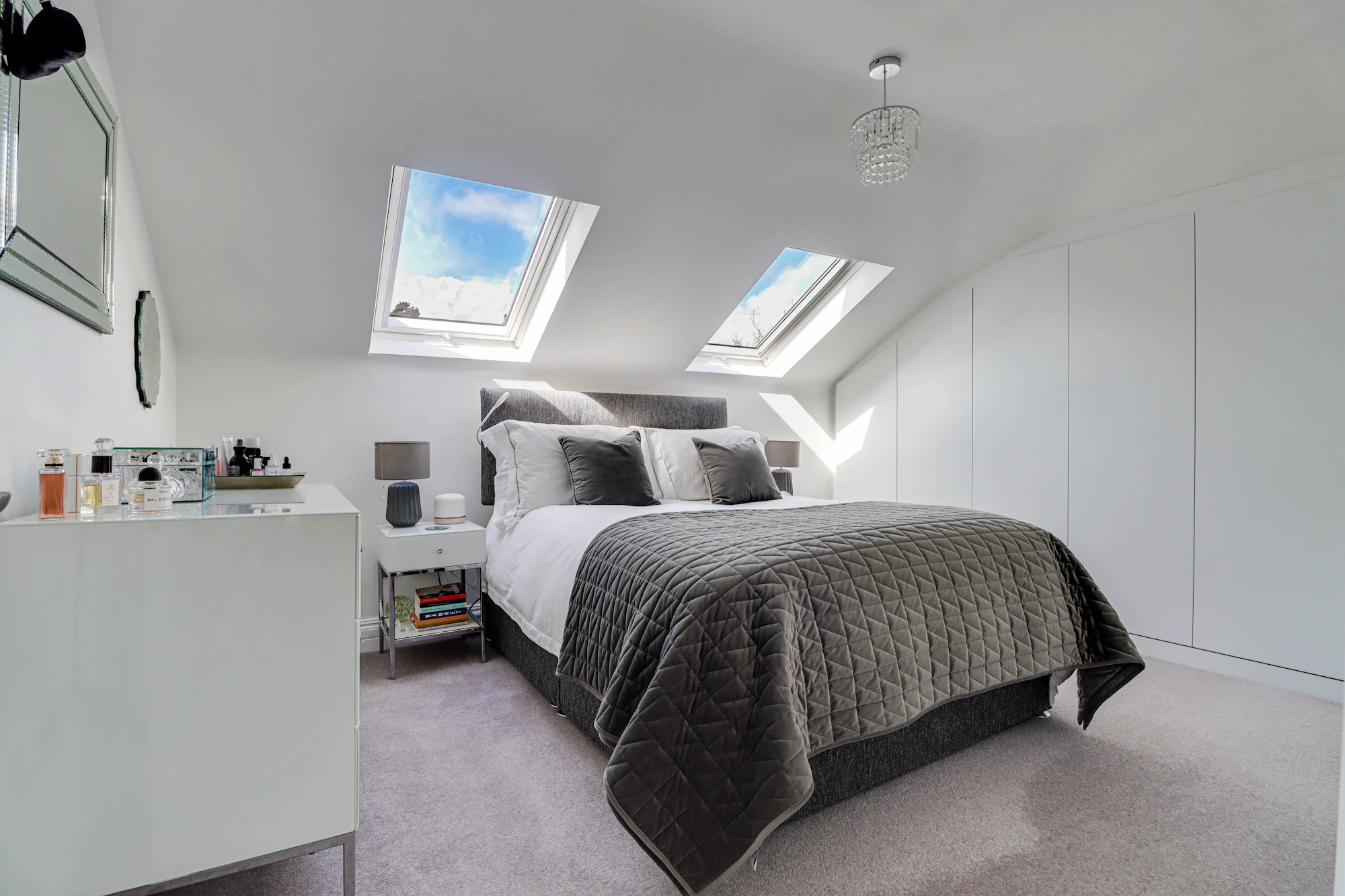 There are two well-proportioned bedrooms, including a spacious principal bedroom with built-in storage, alongside a second bedroom that would serve perfectly as a guest room or home office. A contemporary bathroom and additional storage areas, including substantial eaves storage, add to the practicality of the home.