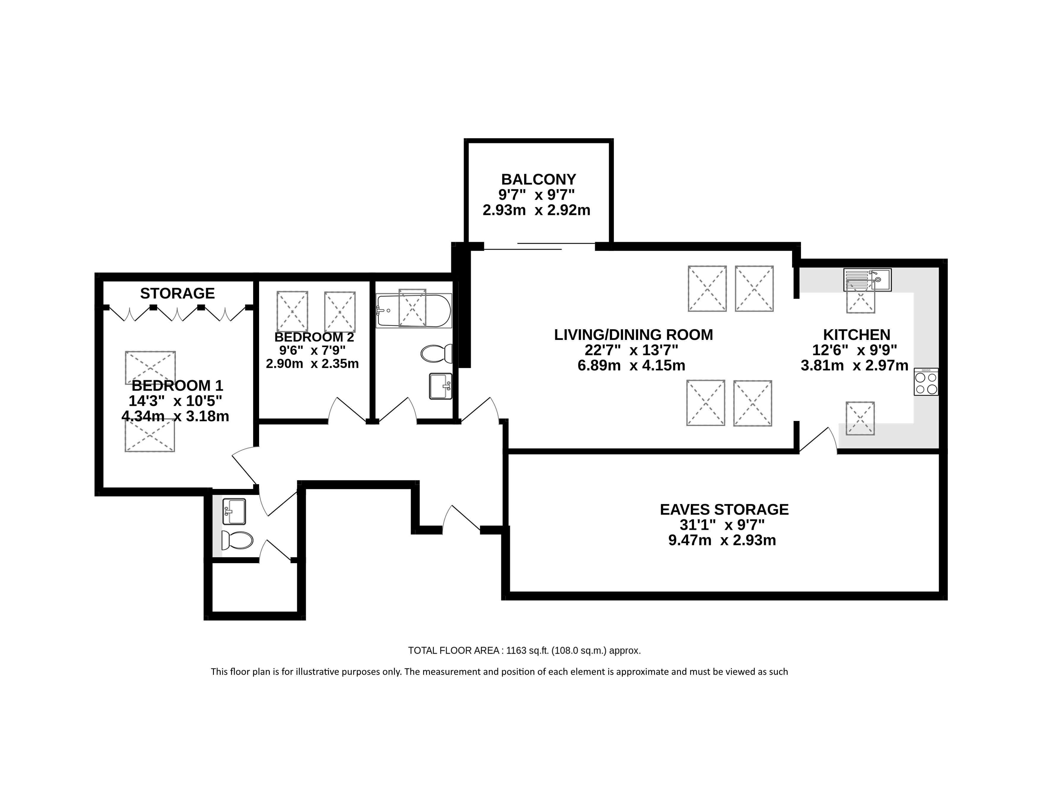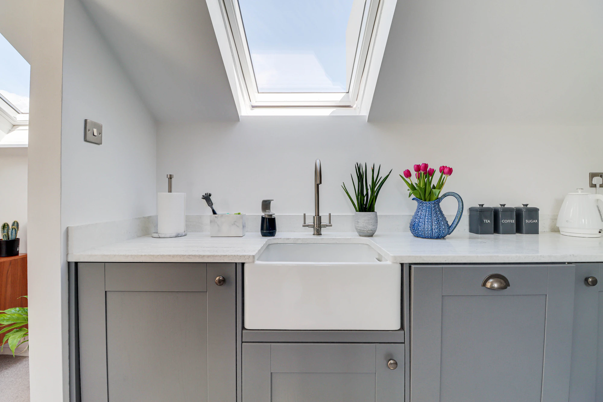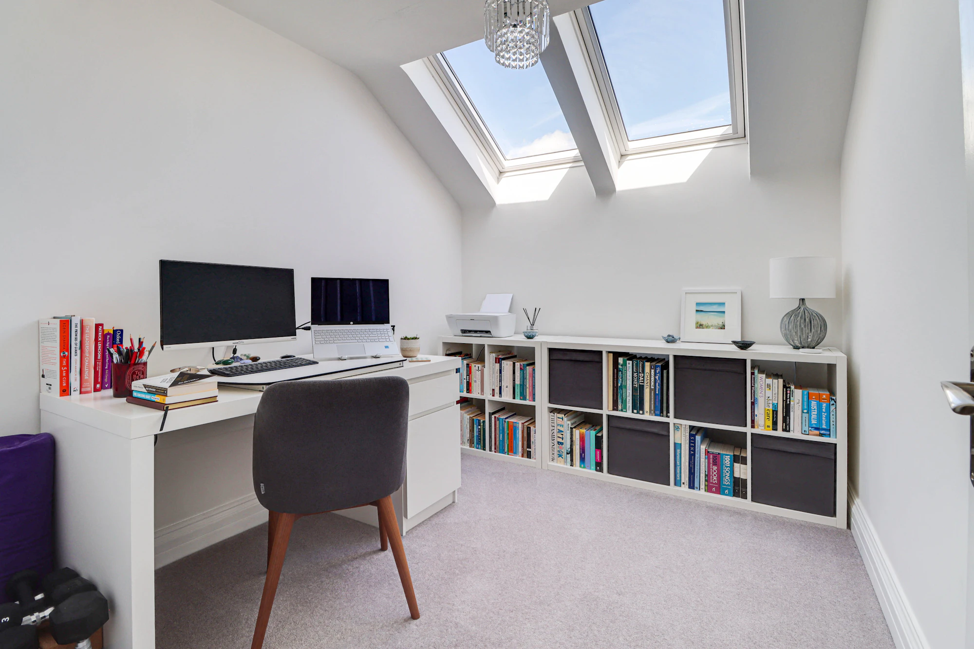 There are two well-proportioned bedrooms, including a spacious principal bedroom with built-in storage, alongside a second bedroom that would serve perfectly as a guest room or home office. A contemporary bathroom and additional storage areas, including substantial eaves storage, add to the practicality of the home.