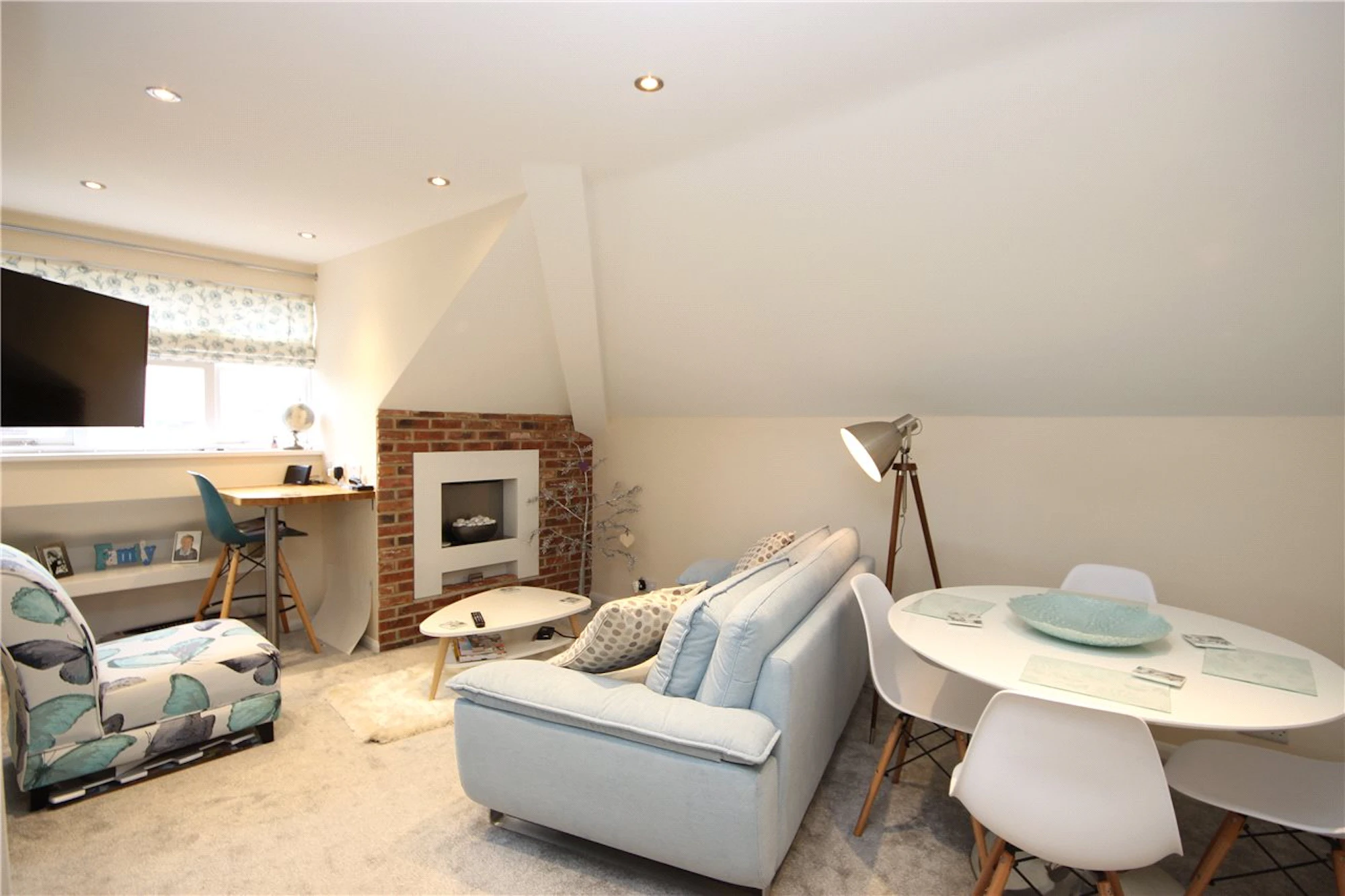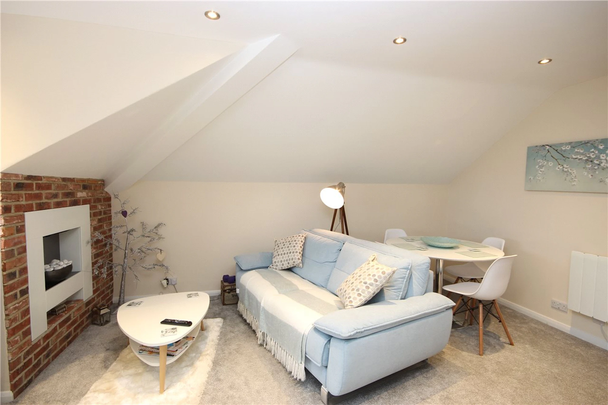 A feature fireplace with exposed brick surround provides a lovely focal point of the room.