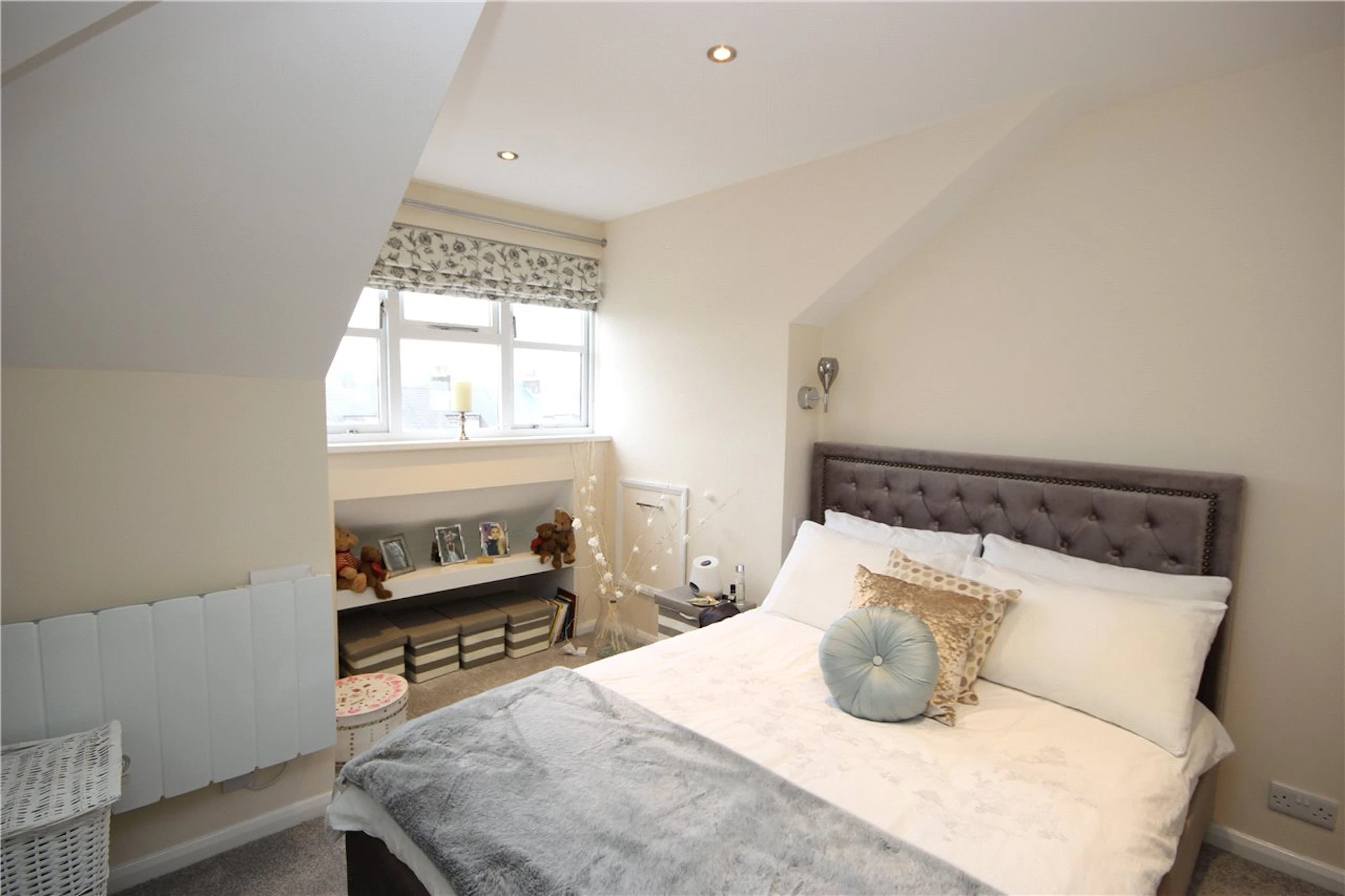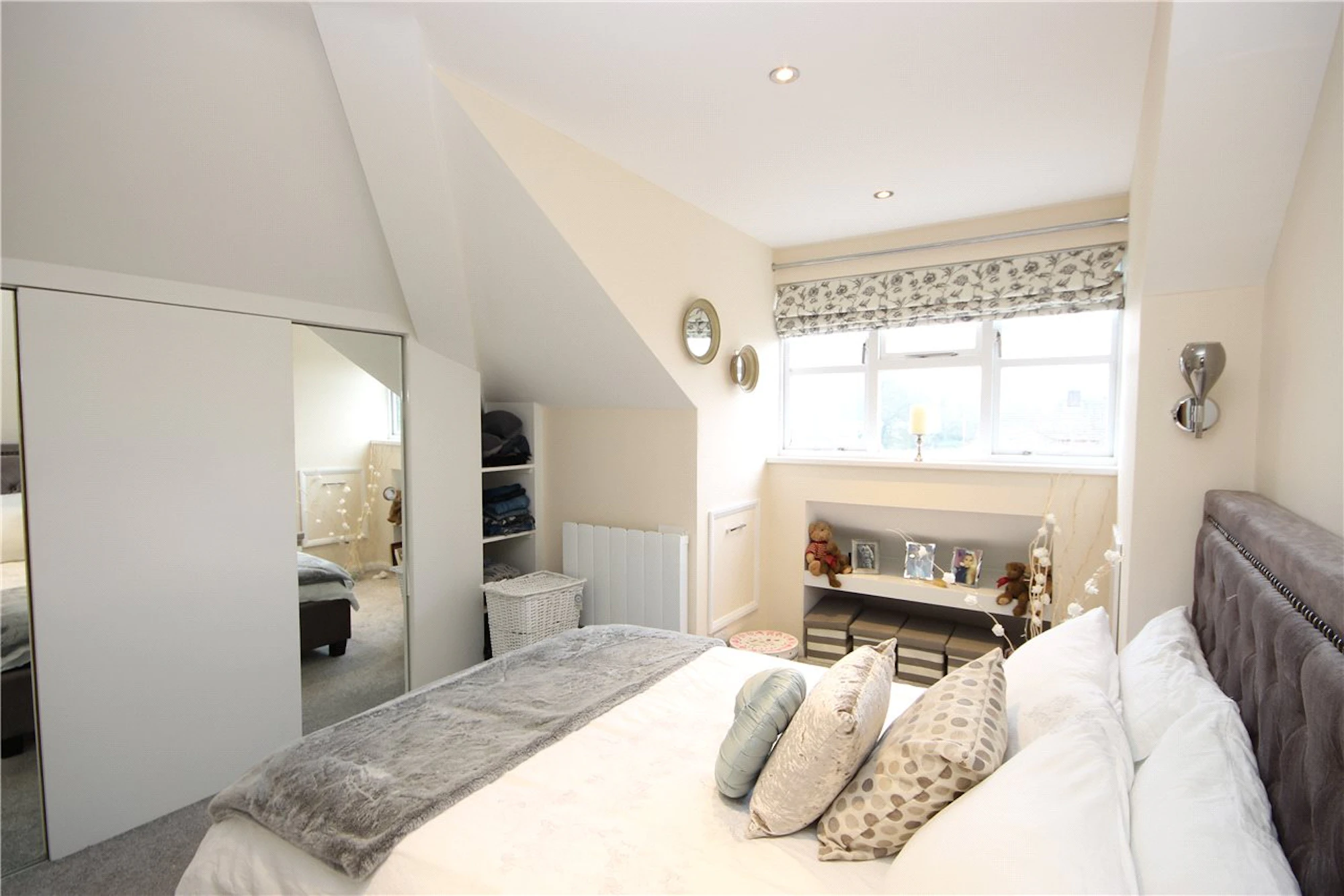 The master bedroom has fitted wardrobes and shelving in every nook of the room providing clever storage solutions.