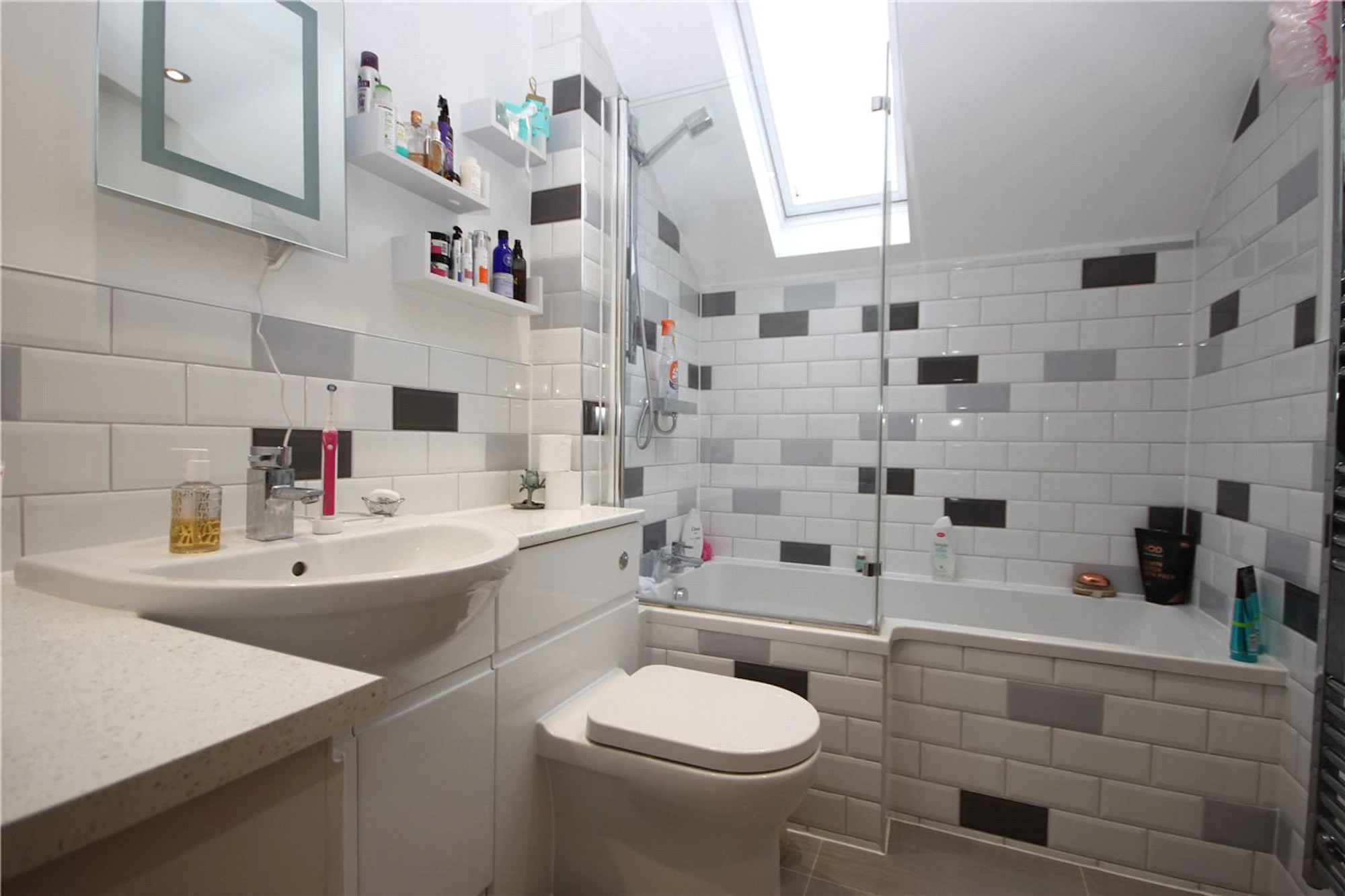 There is a stylish bathroom suite with contemporary grey brick tiling and shower over bath.