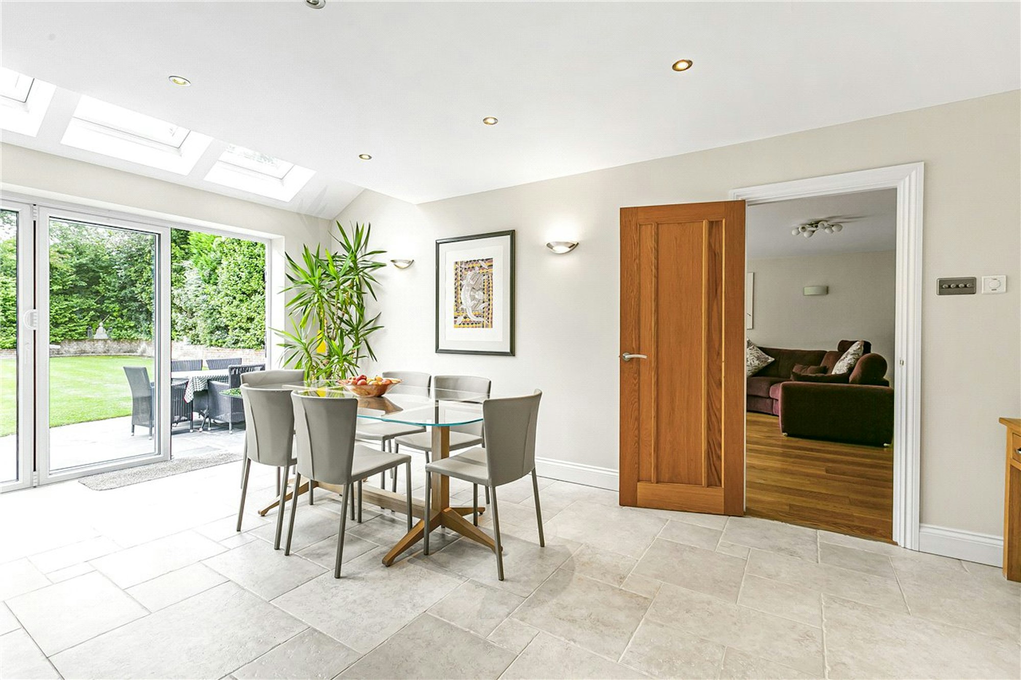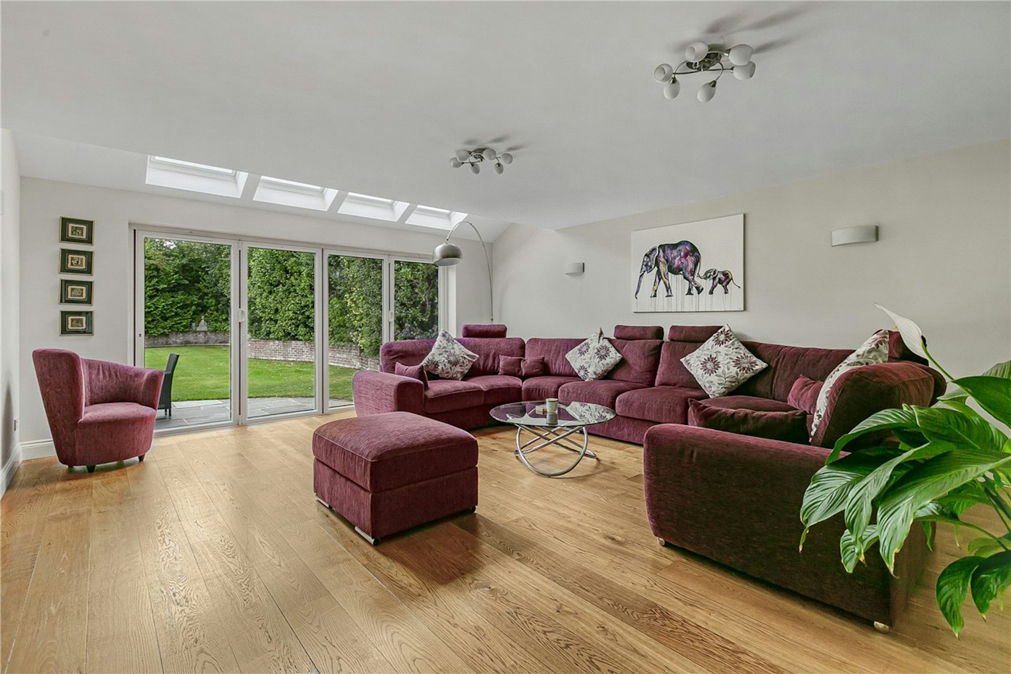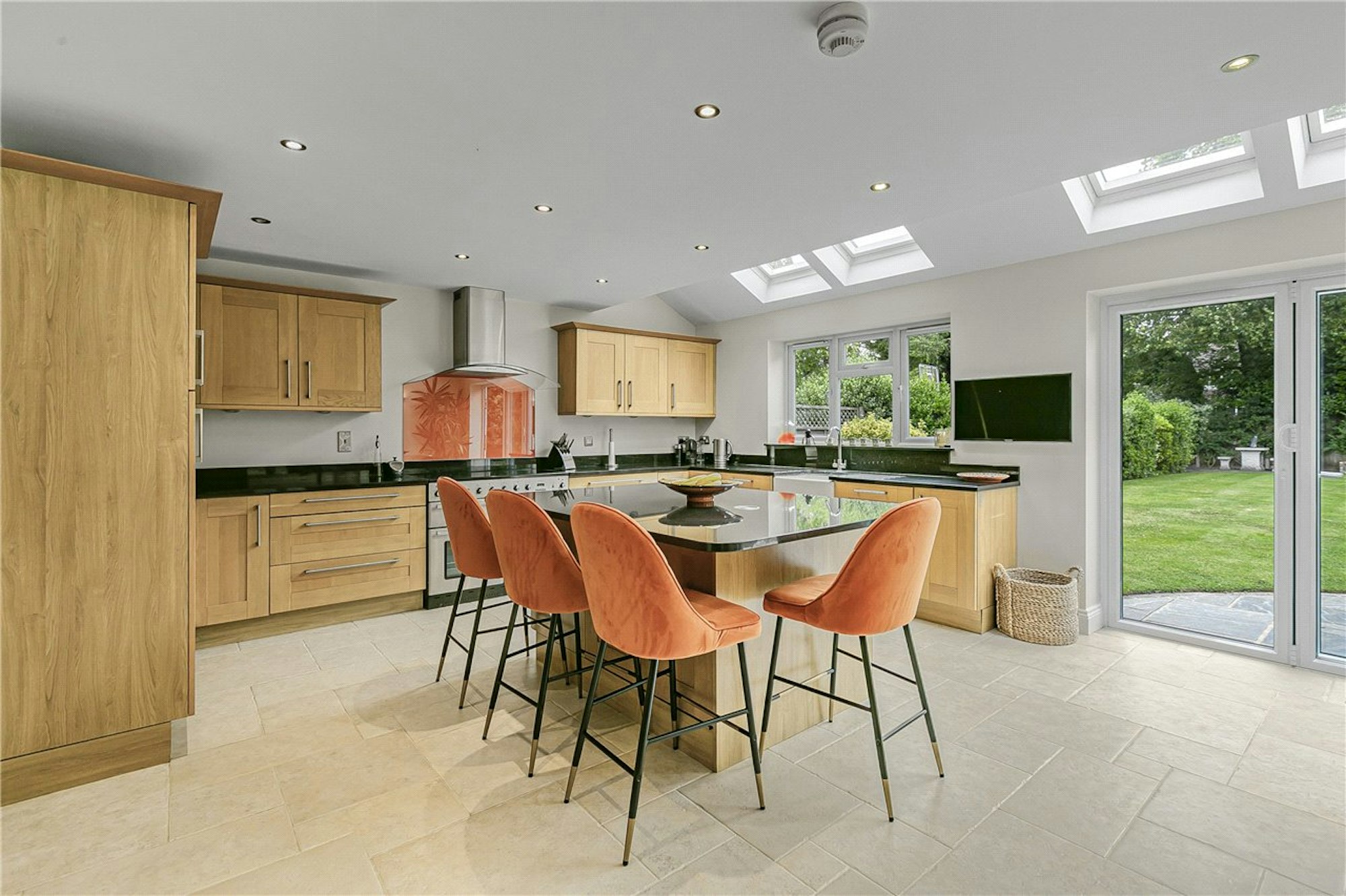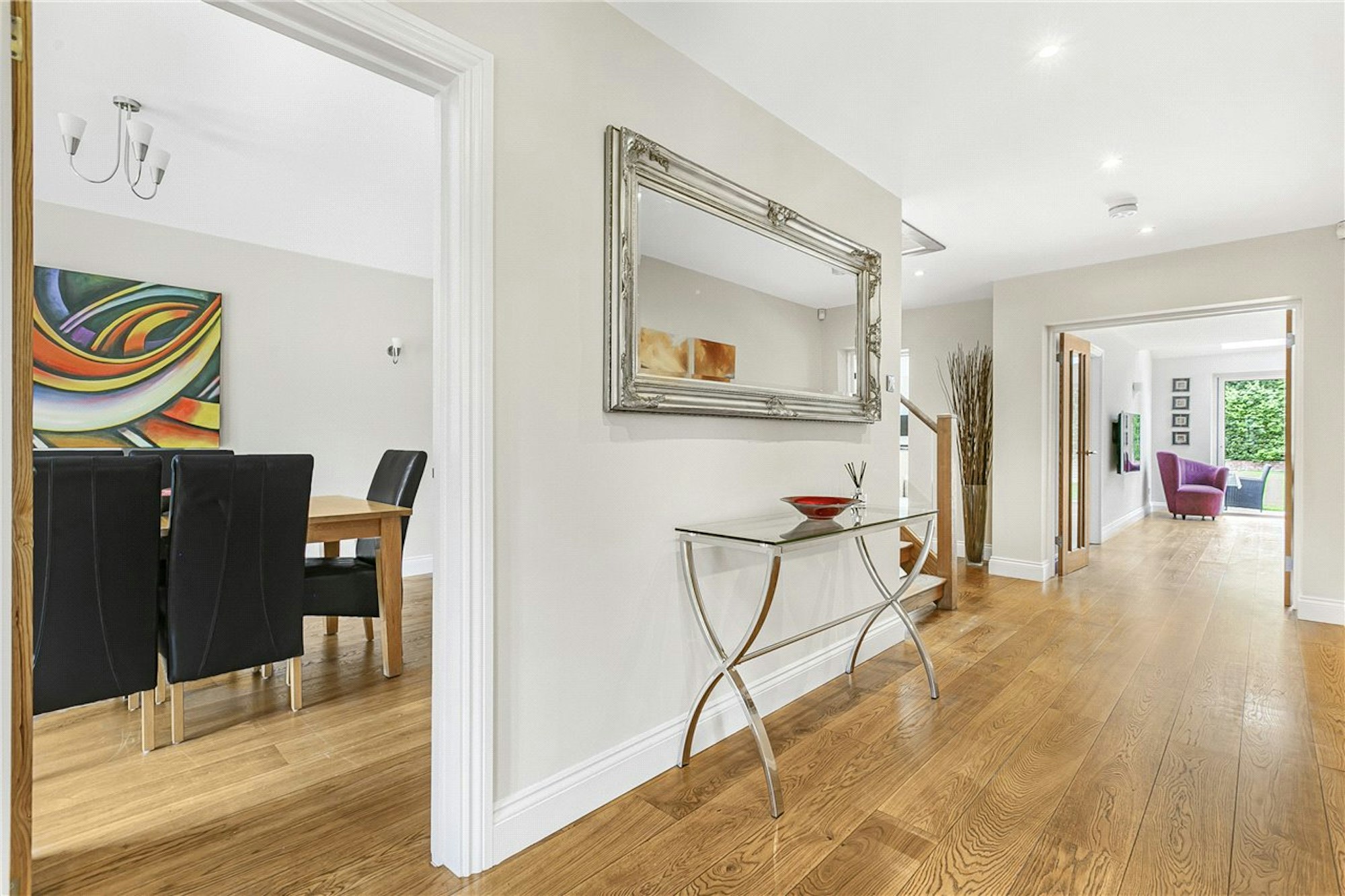 Set back from the road, the property is approached by a bloc paved driveway which provides off street parking for several vehicles, and the front door opens into an impressive entrance hall with timber flooring. There are two large, separate reception rooms at the front of the house, both bright spaces with large Georgian style windows with low sills. An extension to the rear and side of the house has allowed the creation of a further impressive living room to the rear, with bi fold doors to the garden and a series of rooflights above, and there is a stunning kitchen/dining room adjacent, beautifully designed to provide excellent storage and incorporate integrated appliances, and with an island for more informal dining. A door from the kitchen leads to a utility room, and there is access from the hall both to a WC and to the garage.
