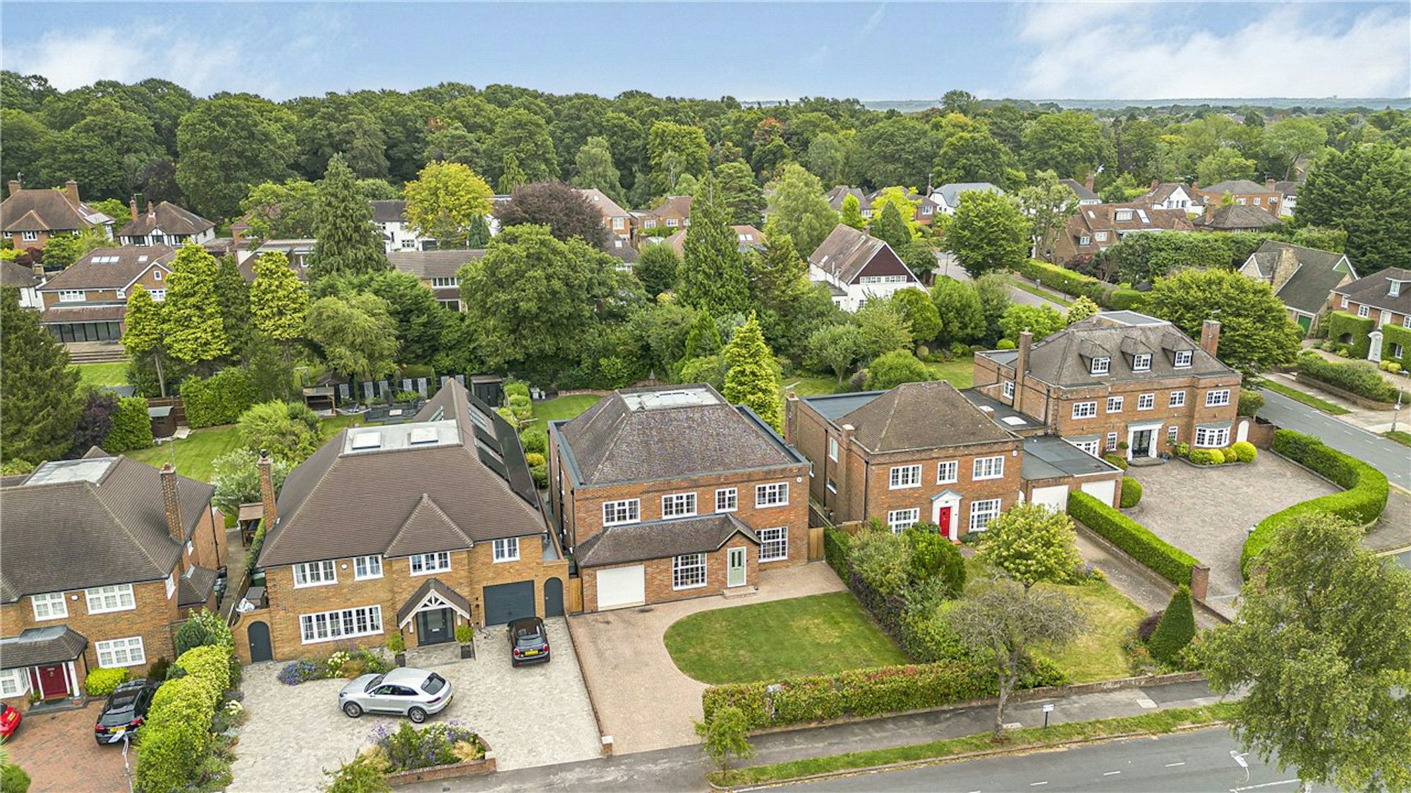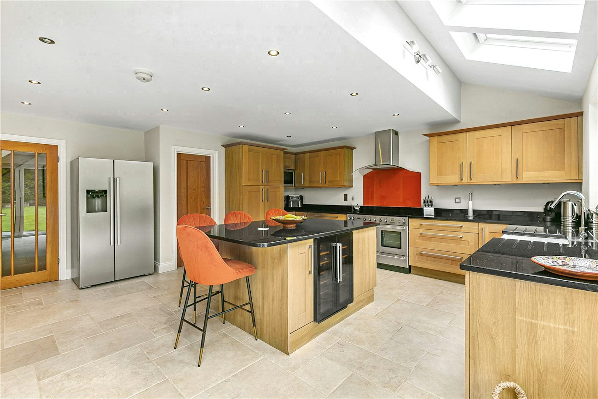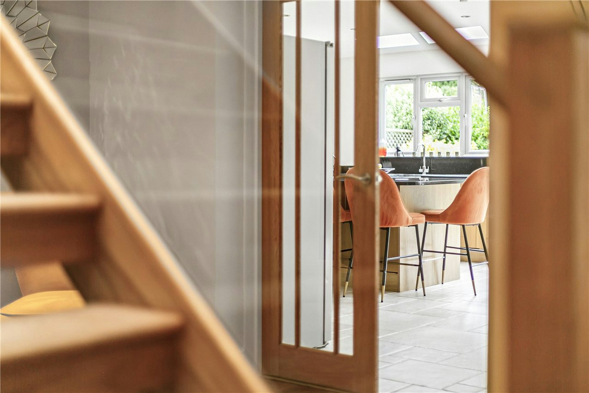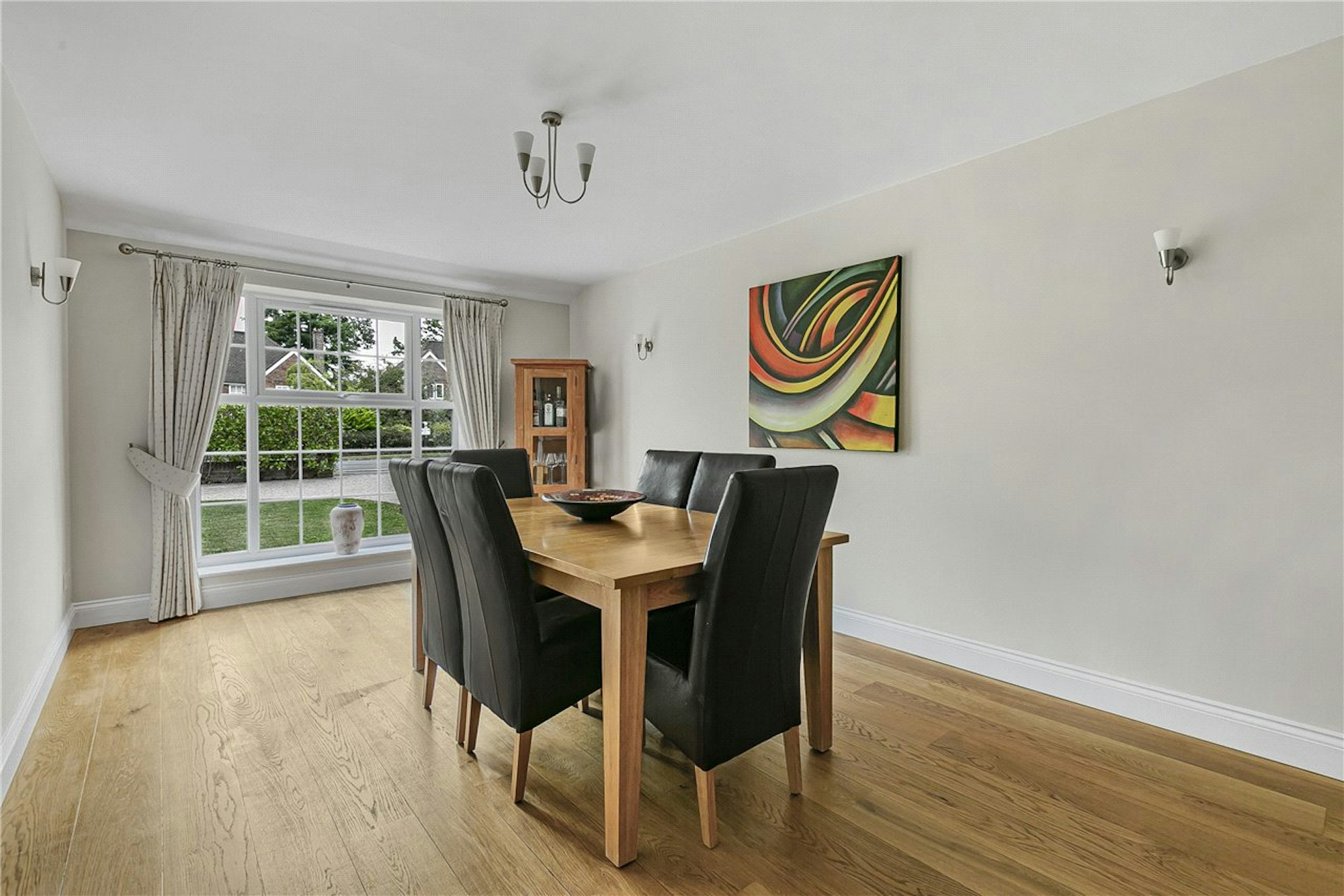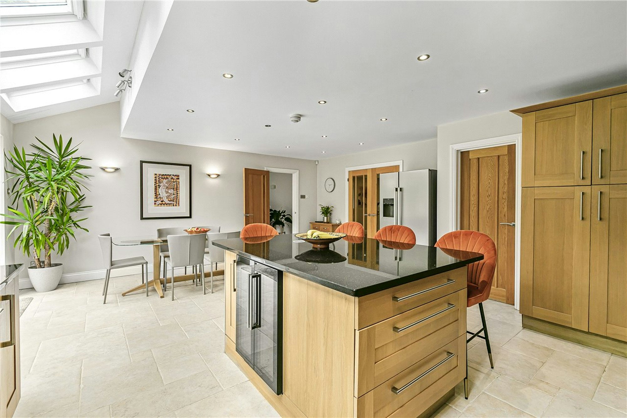 Set back from the road, the property is approached by a bloc paved driveway which provides off street parking for several vehicles, and the front door opens into an impressive entrance hall with timber flooring. There are two large, separate reception rooms at the front of the house, both bright spaces with large Georgian style windows with low sills. An extension to the rear and side of the house has allowed the creation of a further impressive living room to the rear, with bi fold doors to the garden and a series of rooflights above, and there is a stunning kitchen/dining room adjacent, beautifully designed to provide excellent storage and incorporate integrated appliances, and with an island for more informal dining. A door from the kitchen leads to a utility room, and there is access from the hall both to a WC and to the garage.