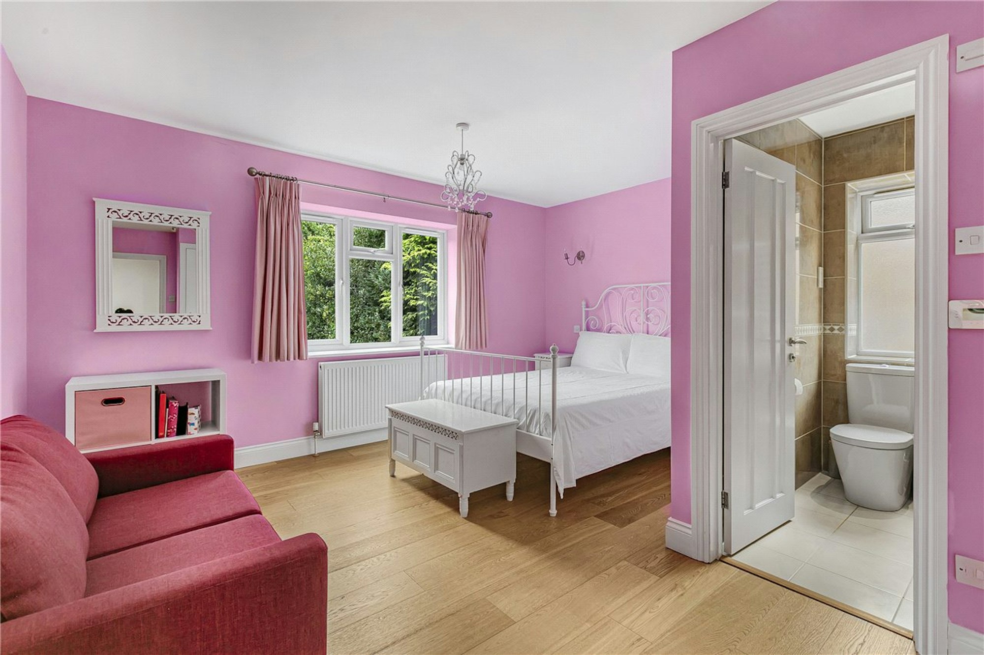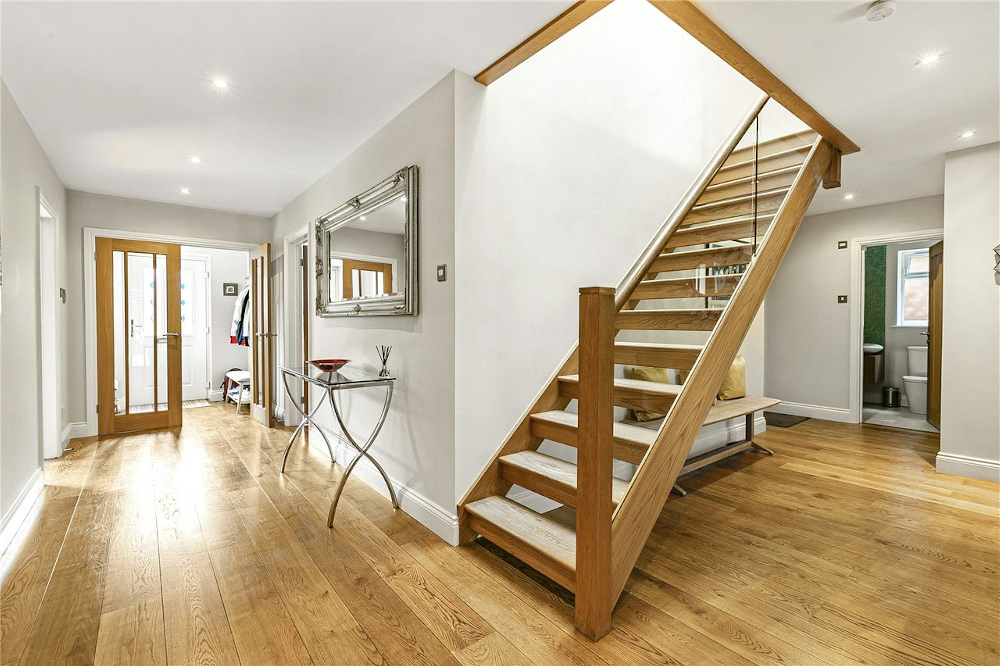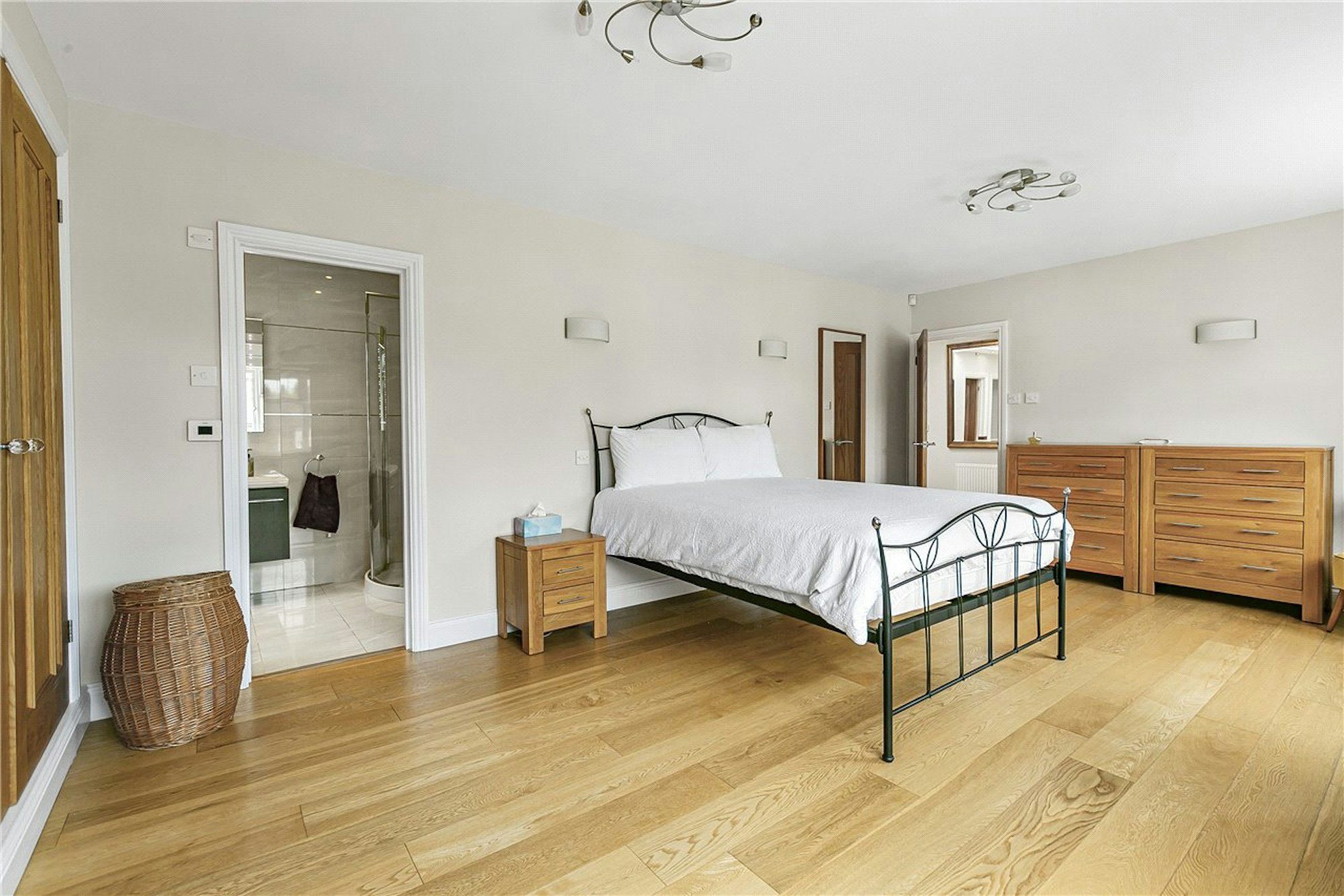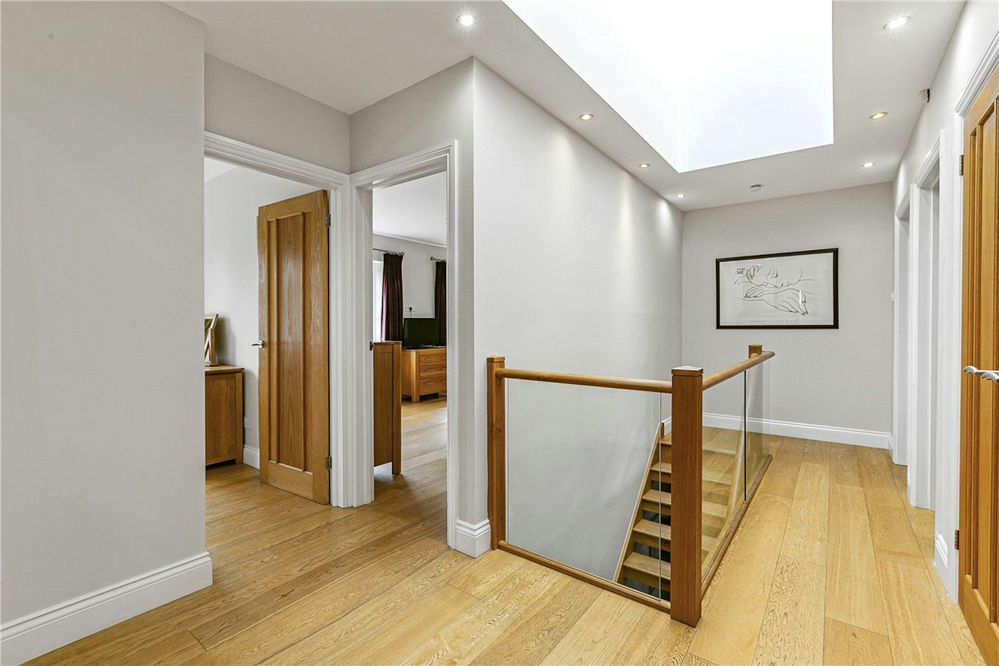 The bespoke open tread timber staircase with glass balustrade is a particularly lovely feature with a large lantern rooflight above bringing plenty of natural light into the heart of the house. It leads to the spacious first floor where the high level of finish continues and there are five double bedrooms, four of which fitted storage, and three of which have the benefit of an en-suite shower or bathroom, all beautifully finished. There is also a generously proportioned family bathroom with free standing bath and separate shower, accessed from the landing.
