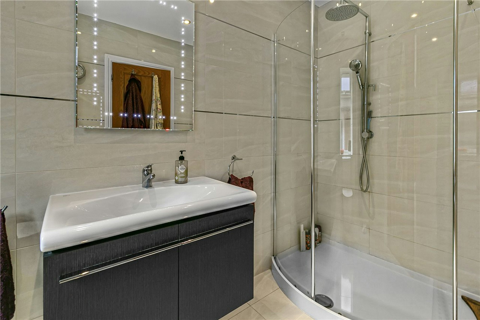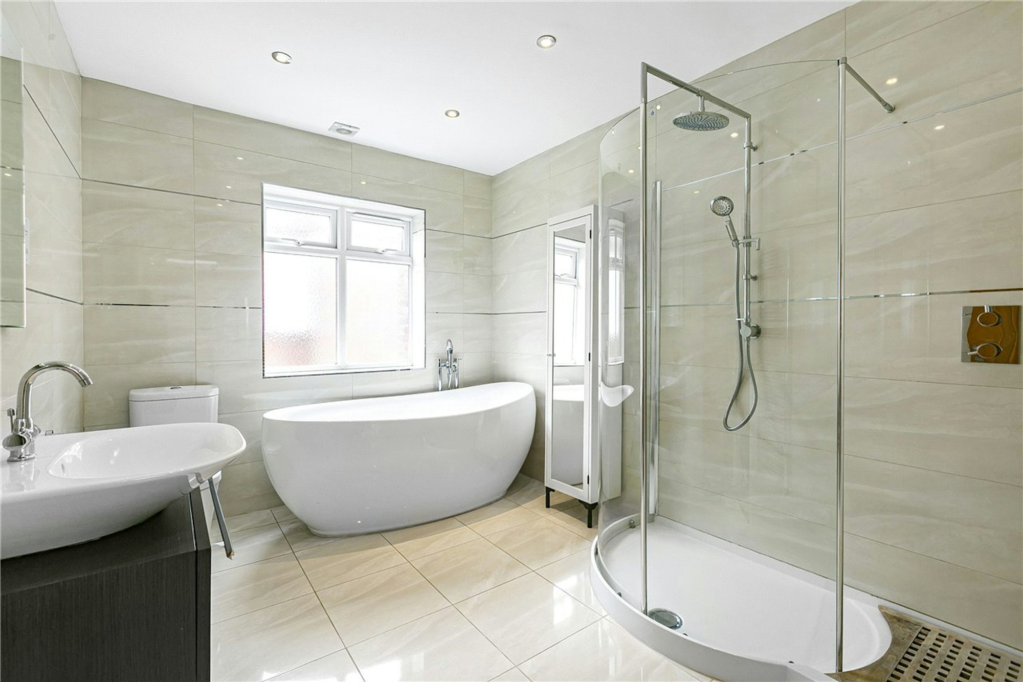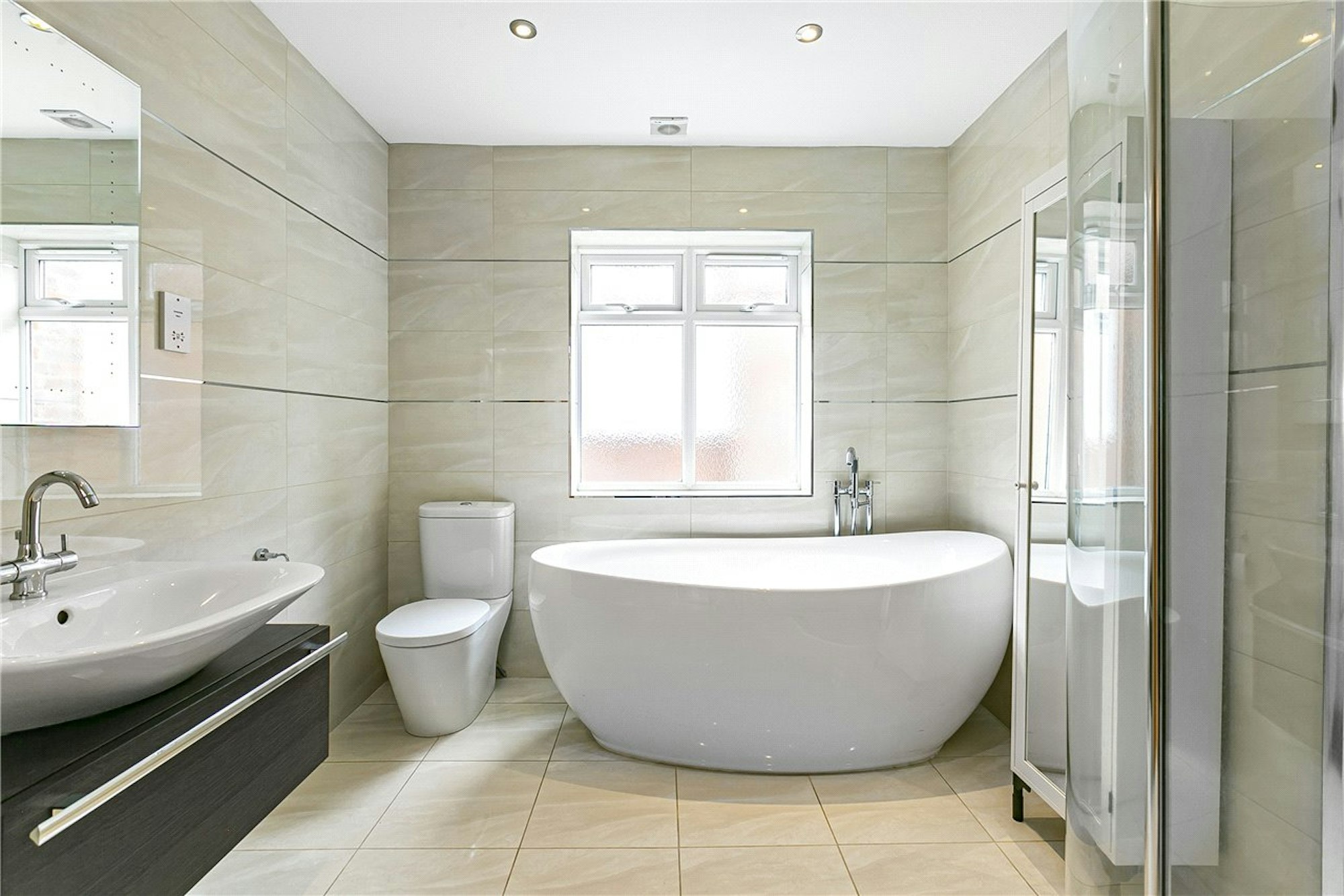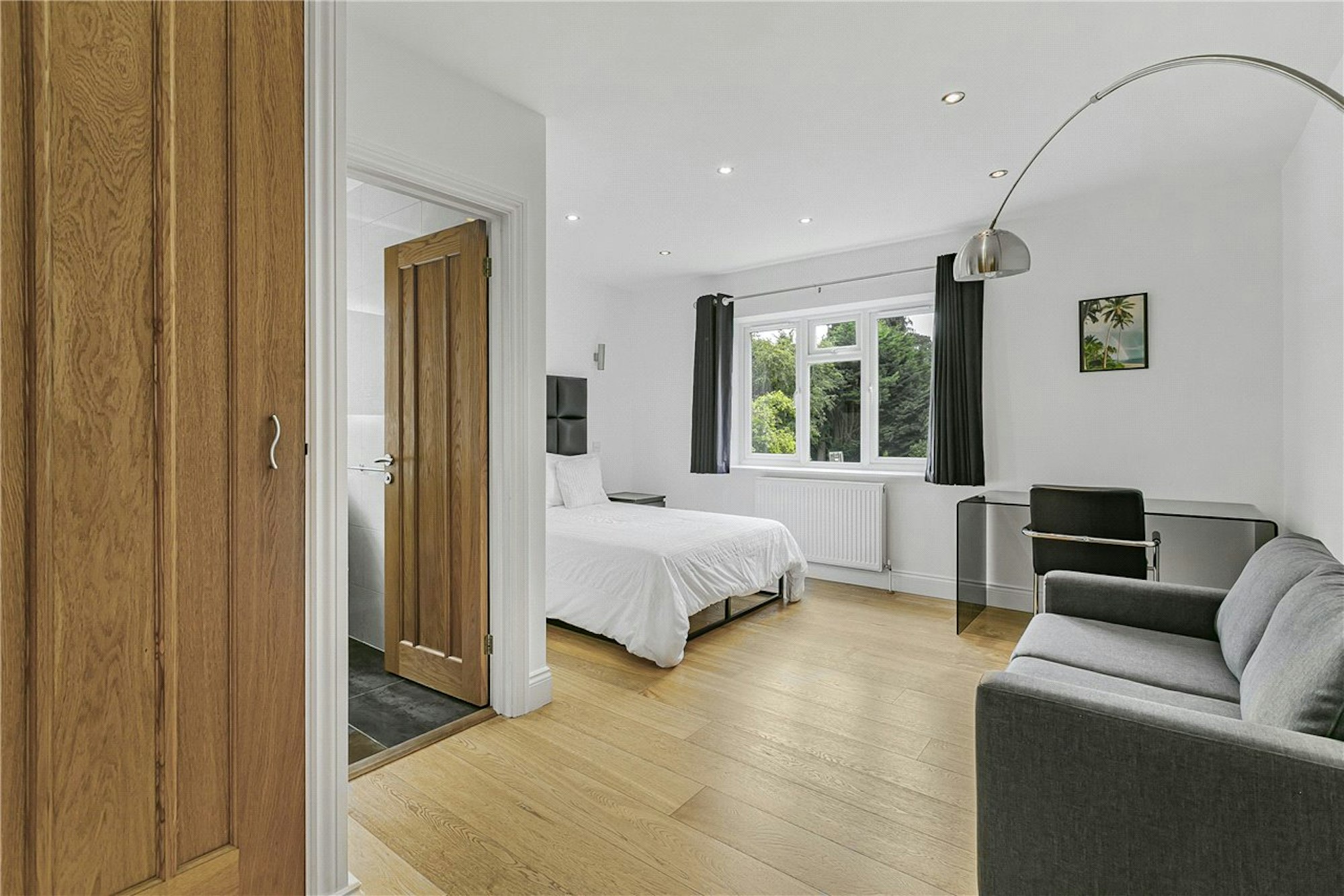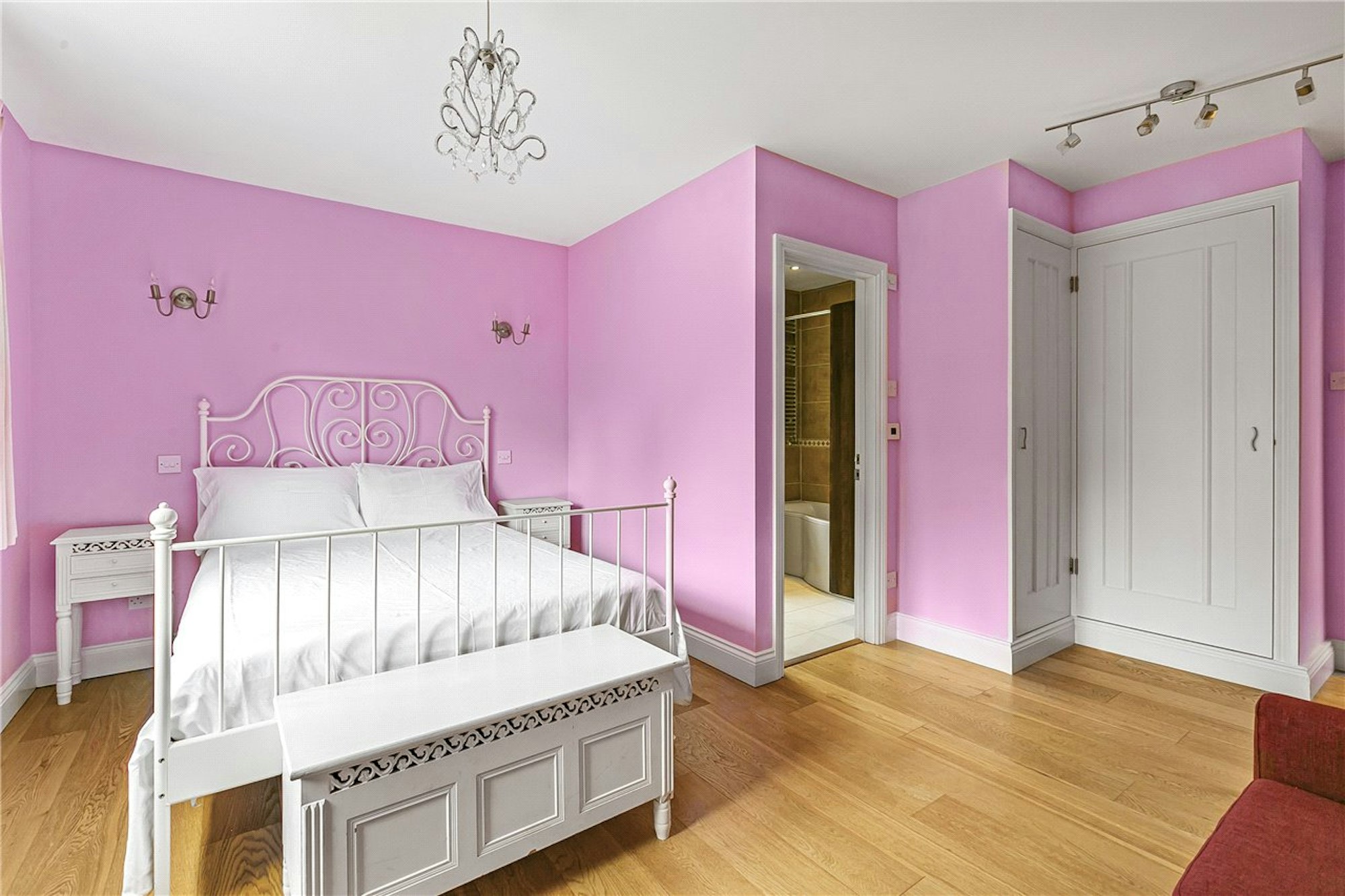 The bespoke open tread timber staircase with glass balustrade is a particularly lovely feature with a large lantern rooflight above bringing plenty of natural light into the heart of the house. It leads to the spacious first floor where the high level of finish continues and there are five double bedrooms, four of which fitted storage, and three of which have the benefit of an en-suite shower or bathroom, all beautifully finished. There is also a generously proportioned family bathroom with free standing bath and separate shower, accessed from the landing.