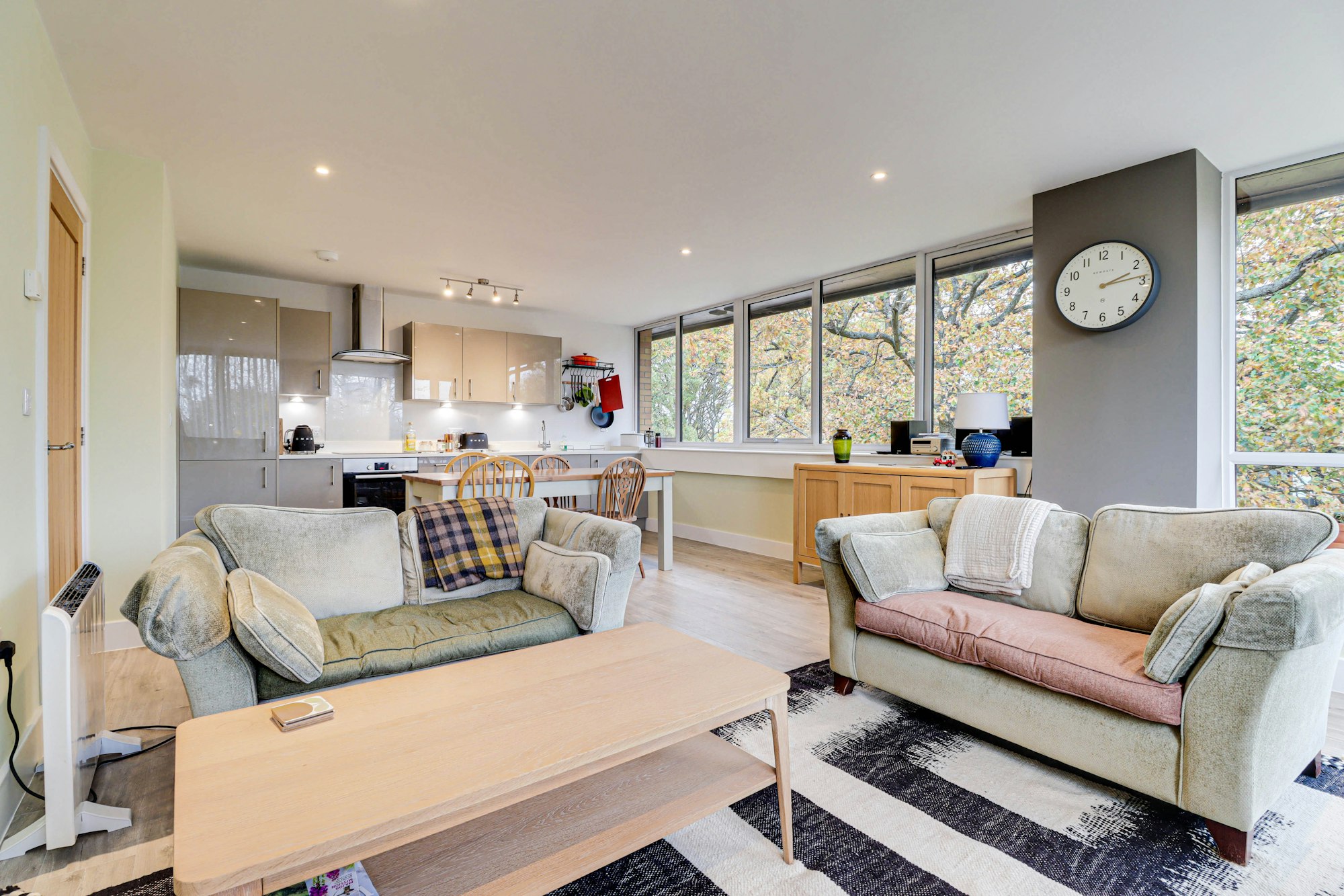 Upon entering, you are greeted by the spacious and welcoming entrance hall with wood flooring and a useful airing cupboard. The dual aspect living/dining room/kitchen is a generous size, measuring approximately 26' x 14', with ample space for two sofas, a large dining table, and a desk for office/workspace. The kitchen has a range of wall and base high gloss units with integrated appliances to include; fridge/freezer, dishwasher, washing machine, oven and hob.