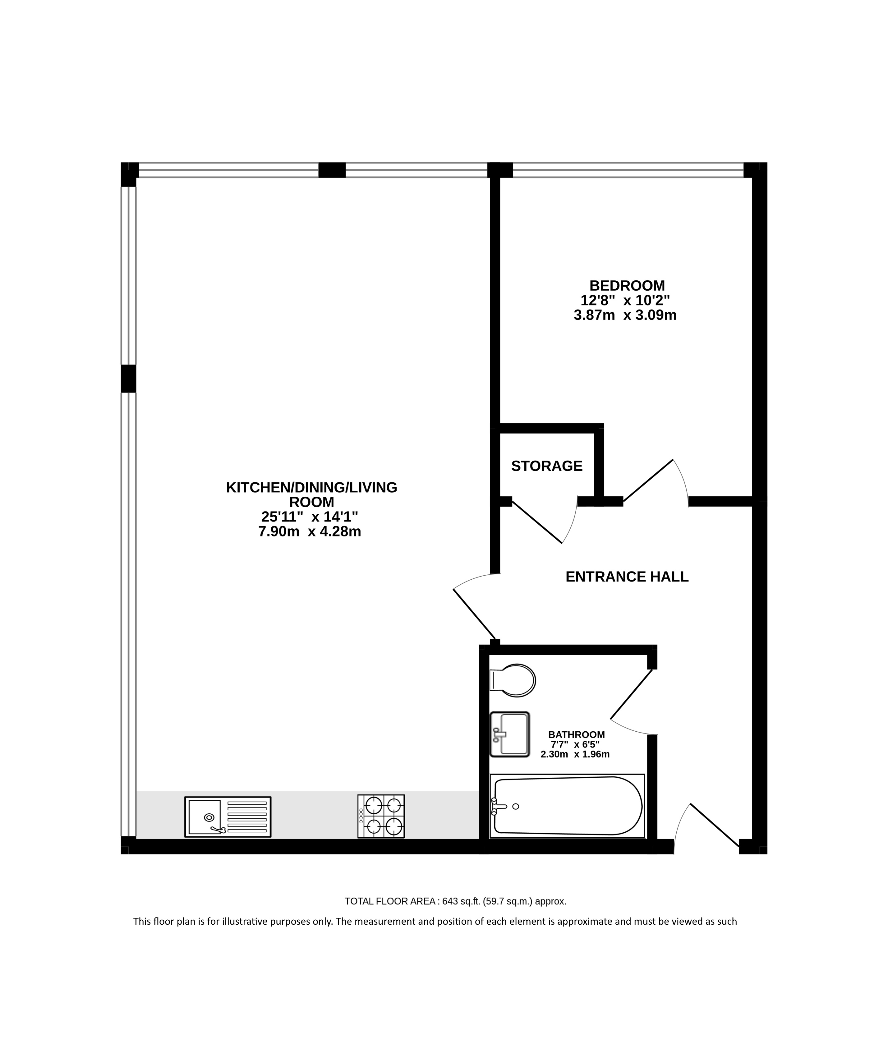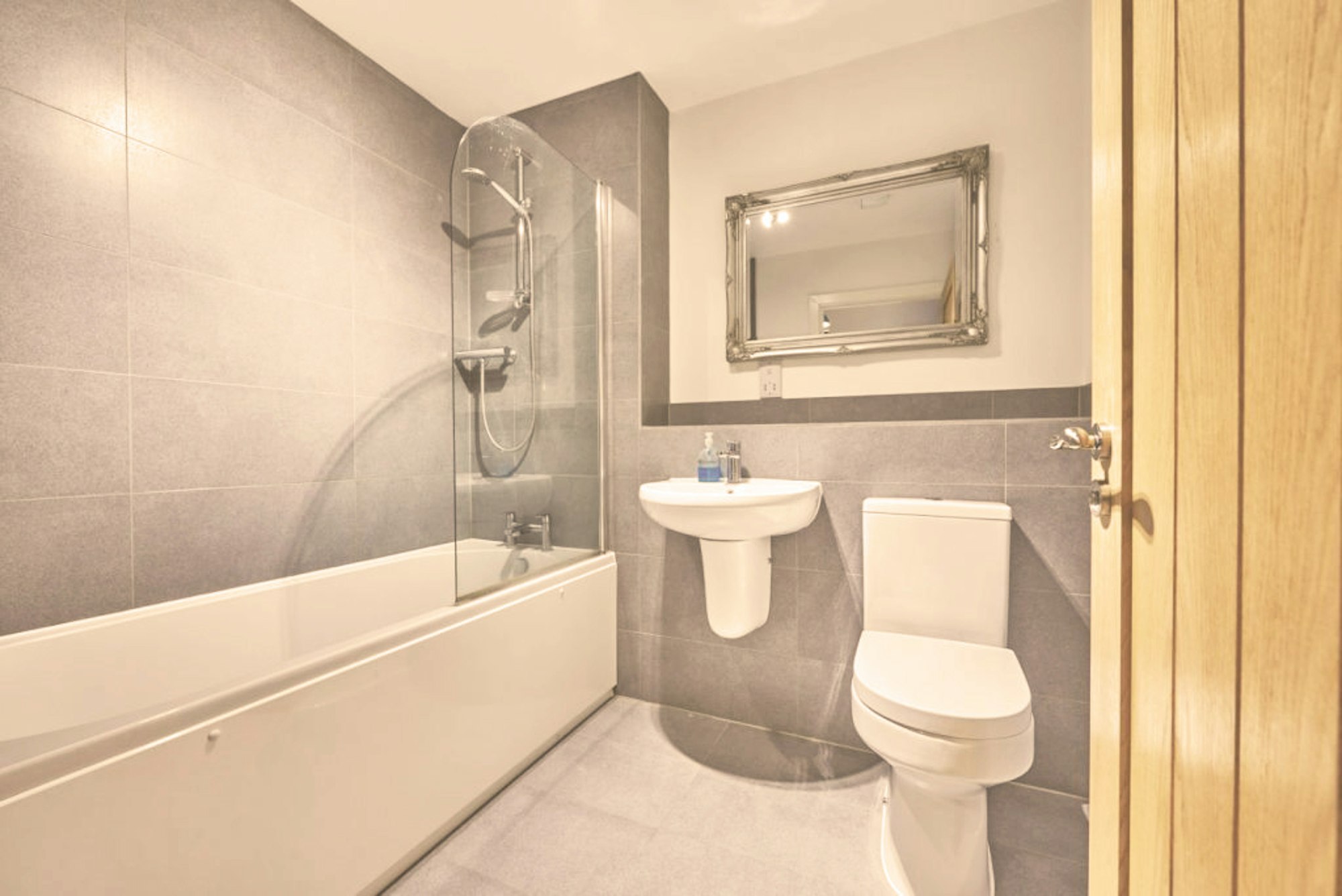 Also leading off the entrance hall is the lovely bright double bedroom and the smart white bathroom suite with grey tiling and shower attachment over the bath.