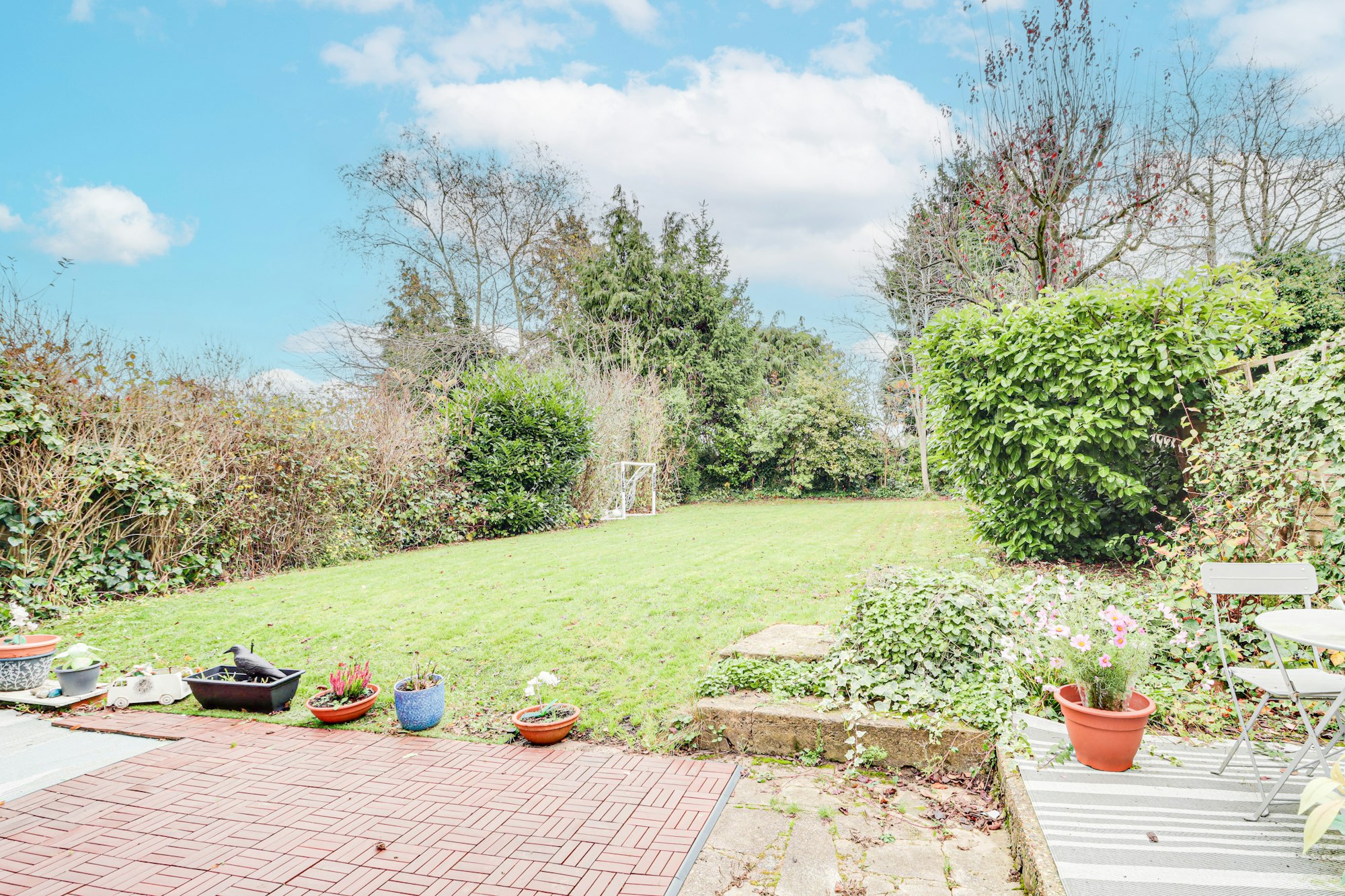 The property has a large secluded rear garden with patio area and a detached garage, ideal for storage.