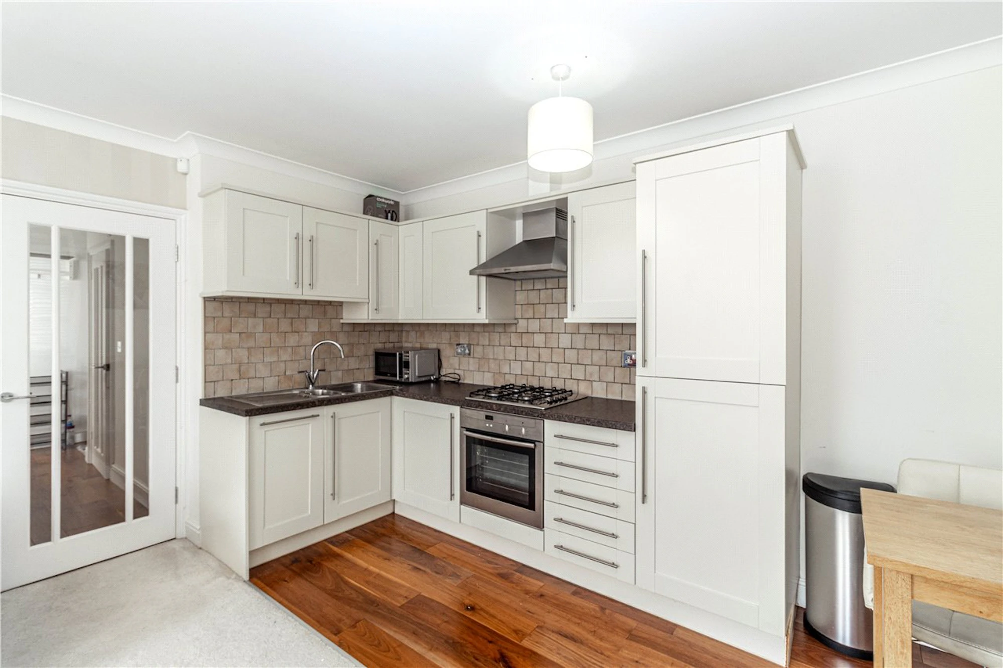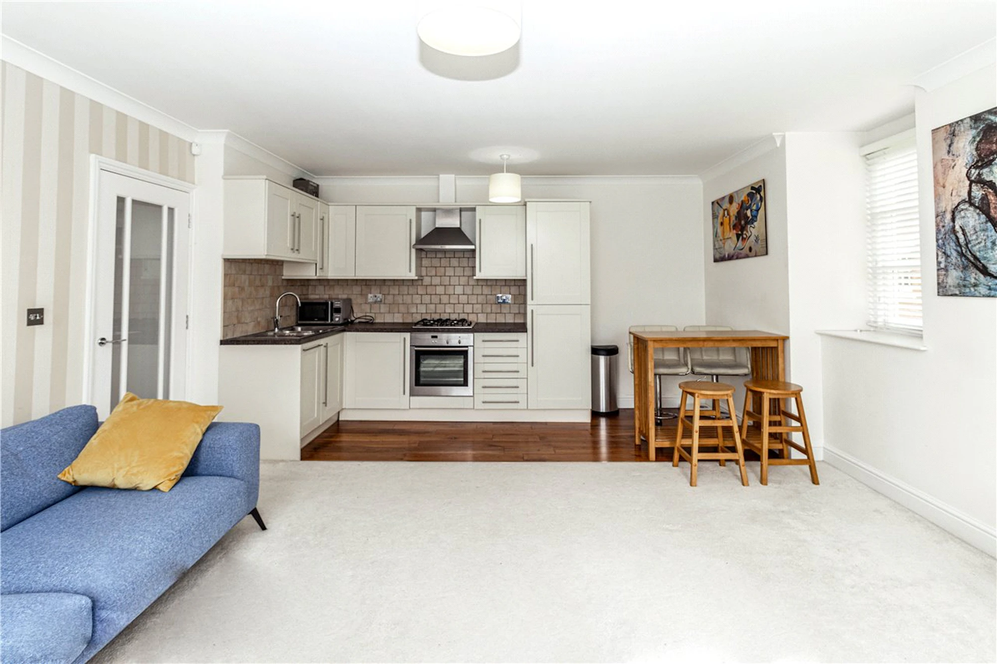 The kitchen offers a wealth of high gloss fitted units and feels nicely separated from the living area with a good range of integrated appliances, complementing work surfaces and tiling.