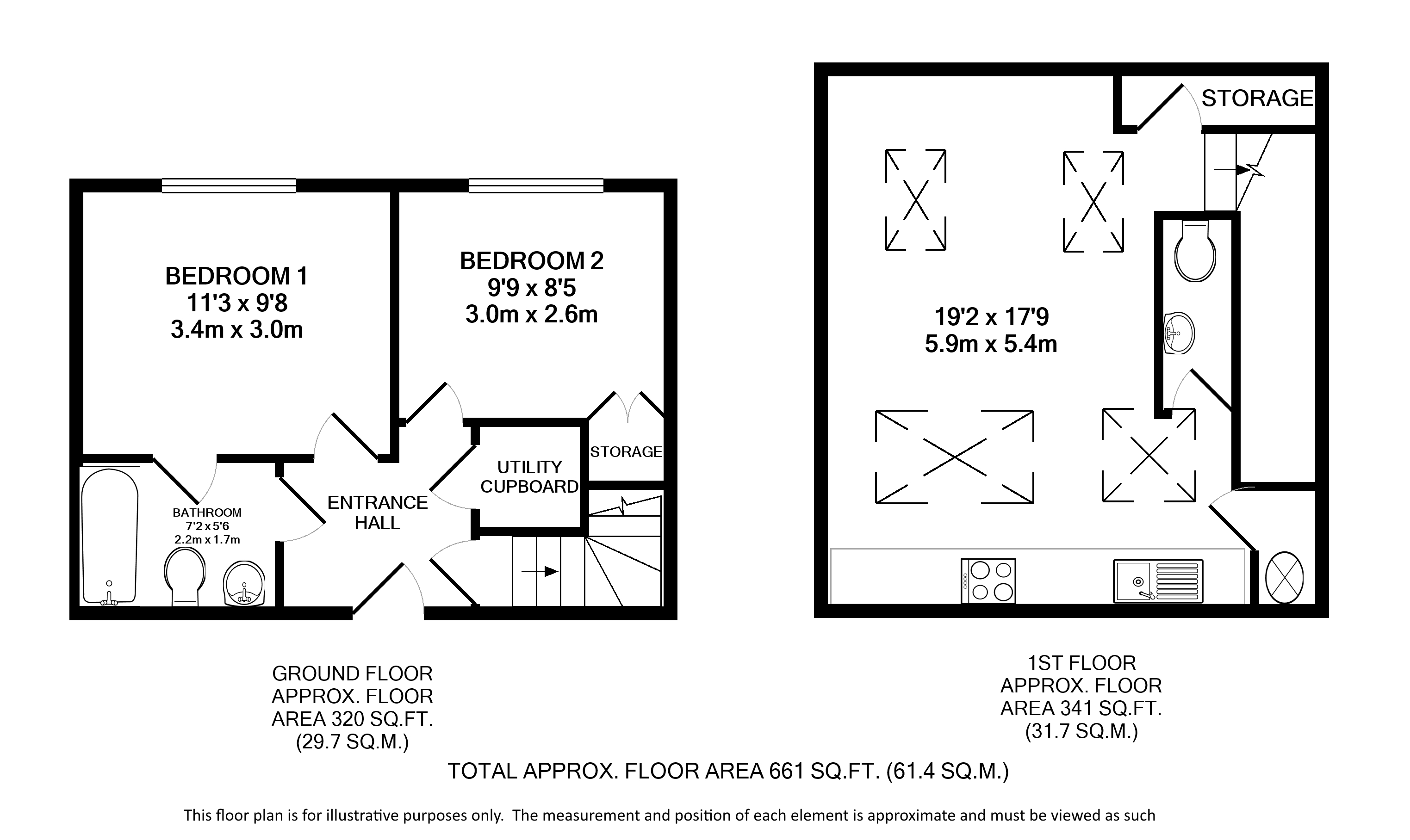 The ground floor offers a large entrance hall, two spacious double bedrooms and a smart white Jack-and-Jill bathroom suite with shower attachment.