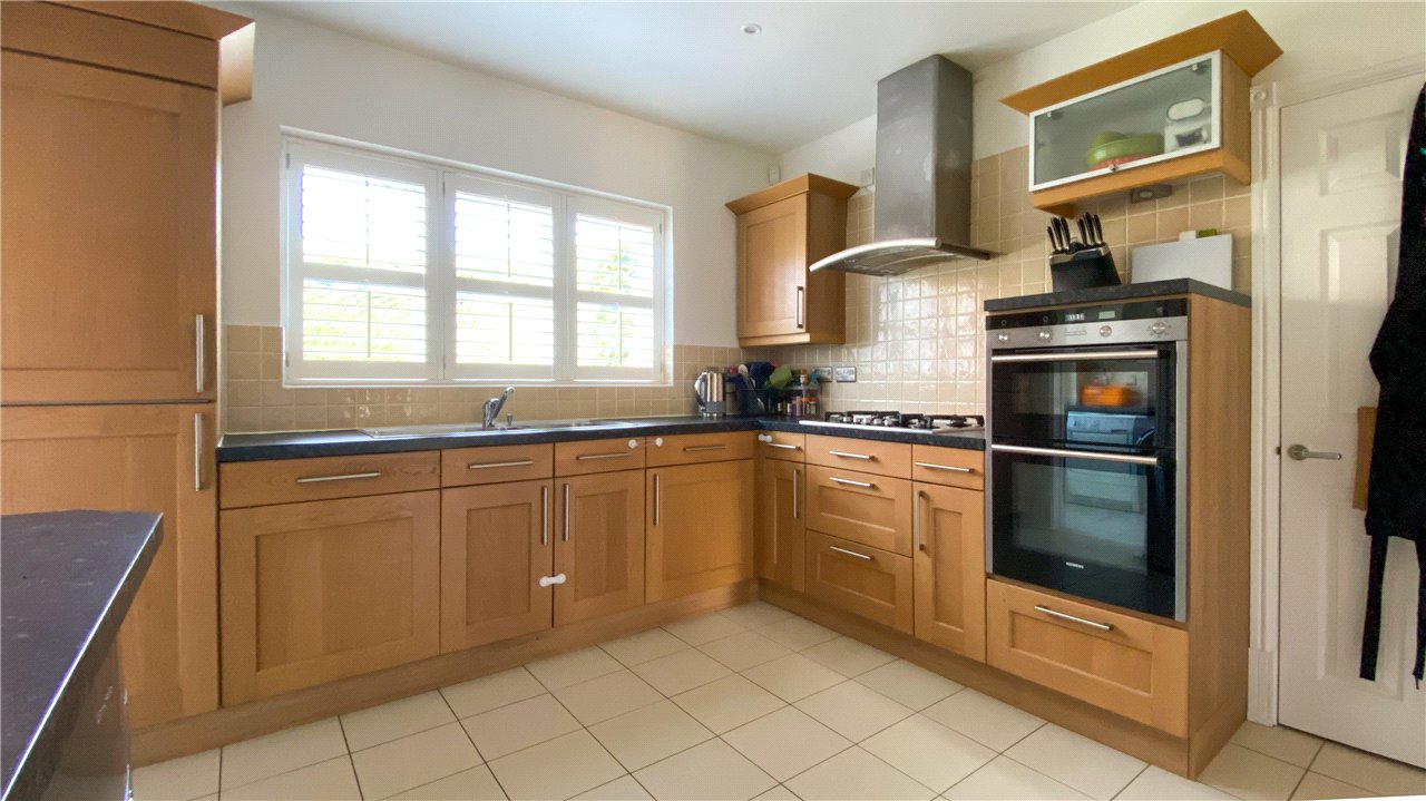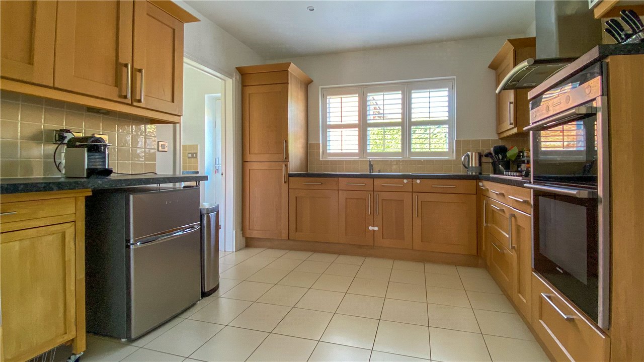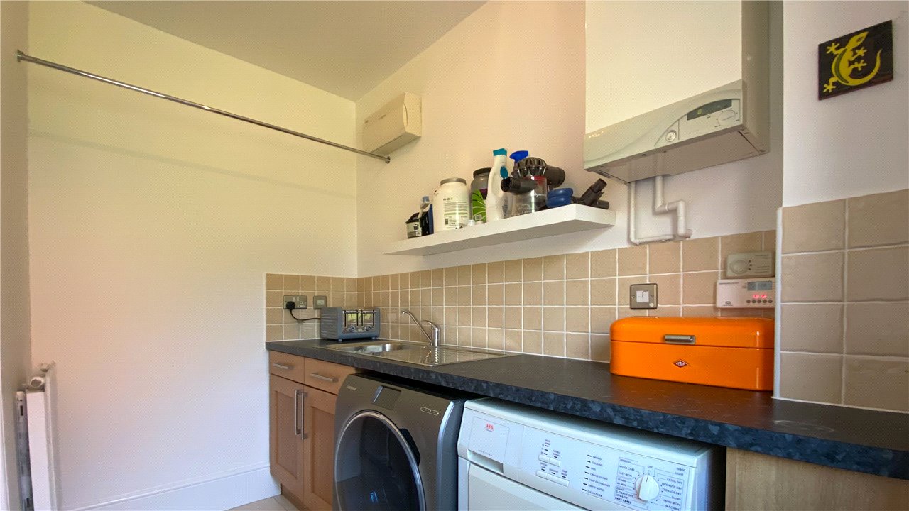 A stylish fitted kitchen with integrated appliances leads through to a separate utility room.
