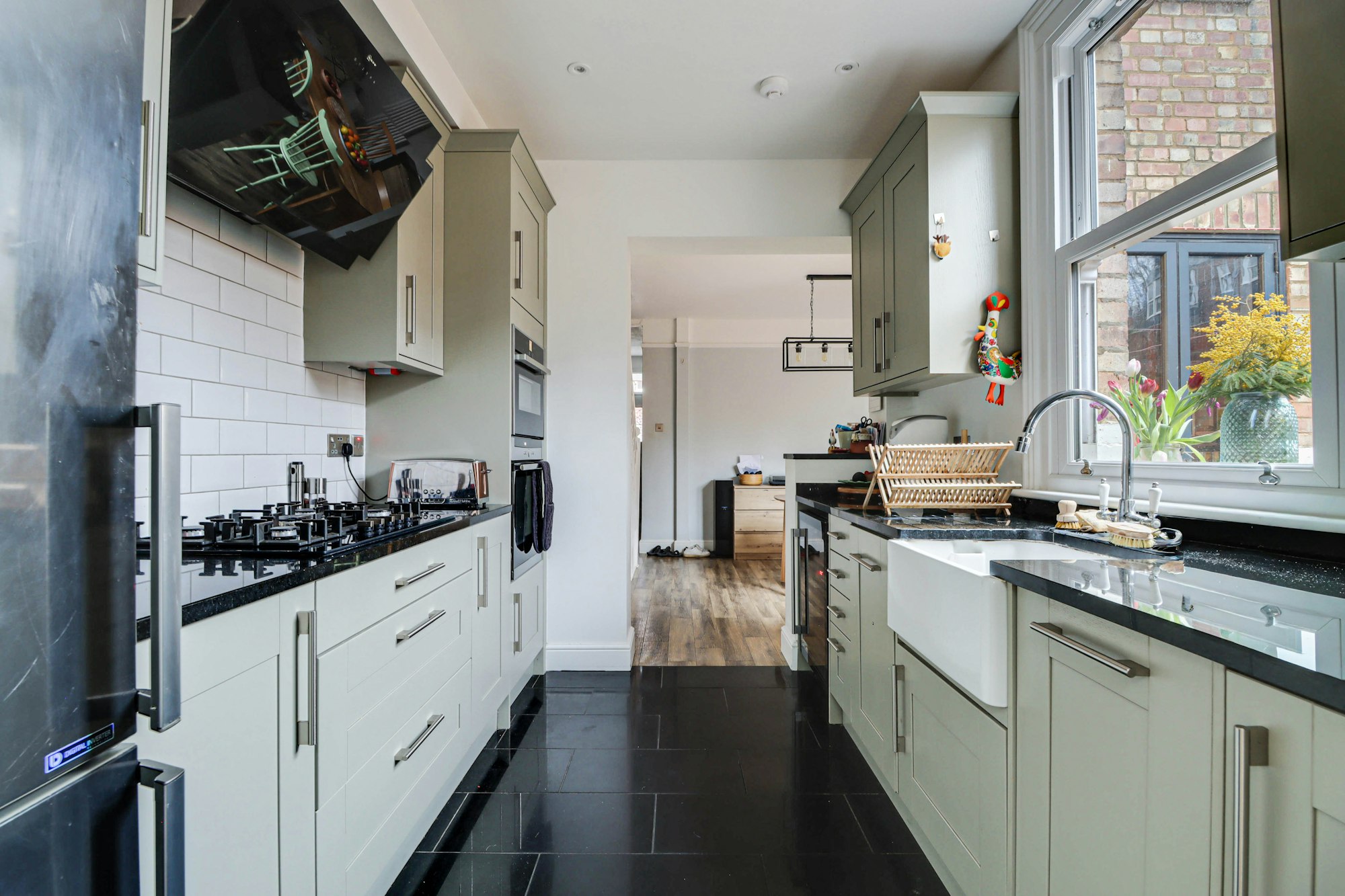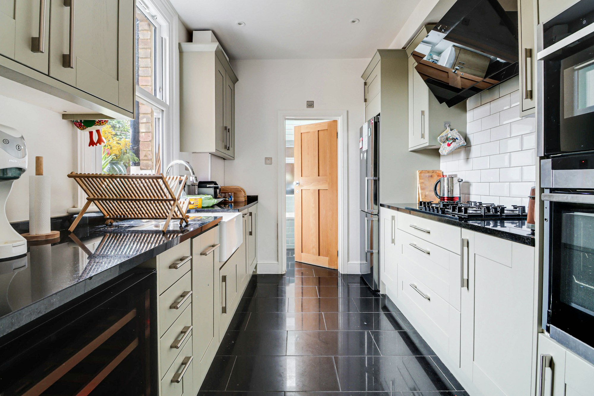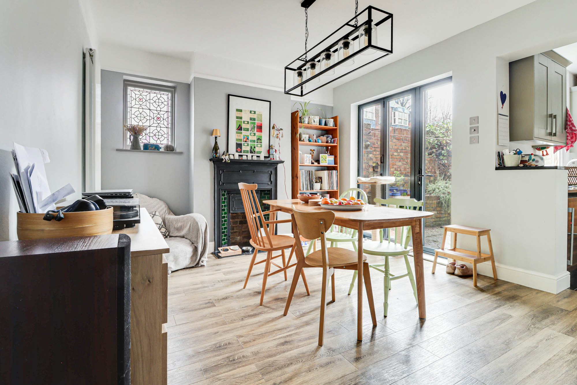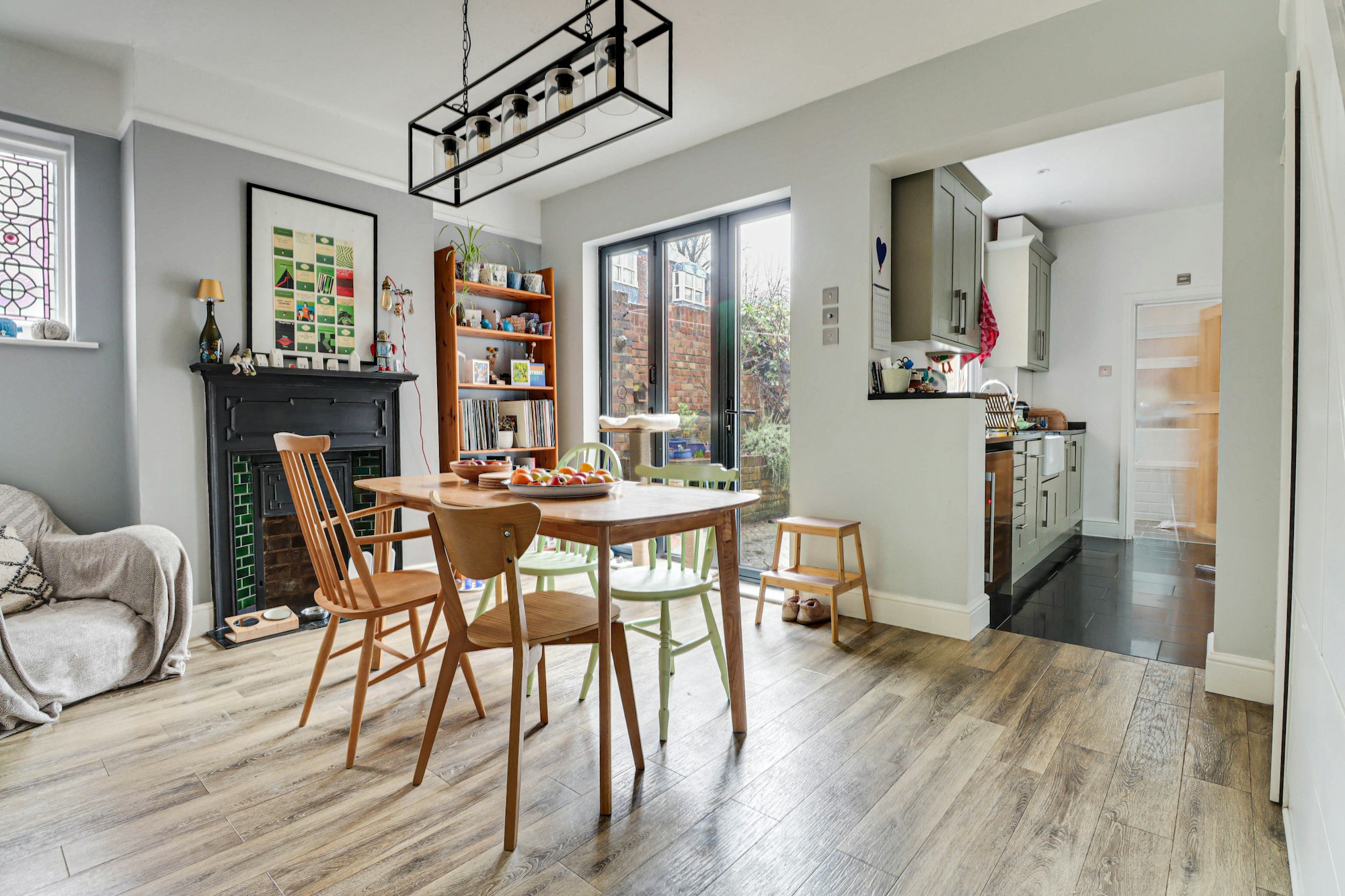 To the rear of the property is the dining room, boasting a period fireplace, characterful stained- glass window and double doors leading to the garden. The dining room flows seamlessly through to the stylish shaker kitchen. With an abundance of storage, the kitchen appliances include a 5-ring gas hob, double oven, wine fridge, fridge/freezer, dishwasher and finished with granite works tops, bevelled tiled splash backs and butler sink.