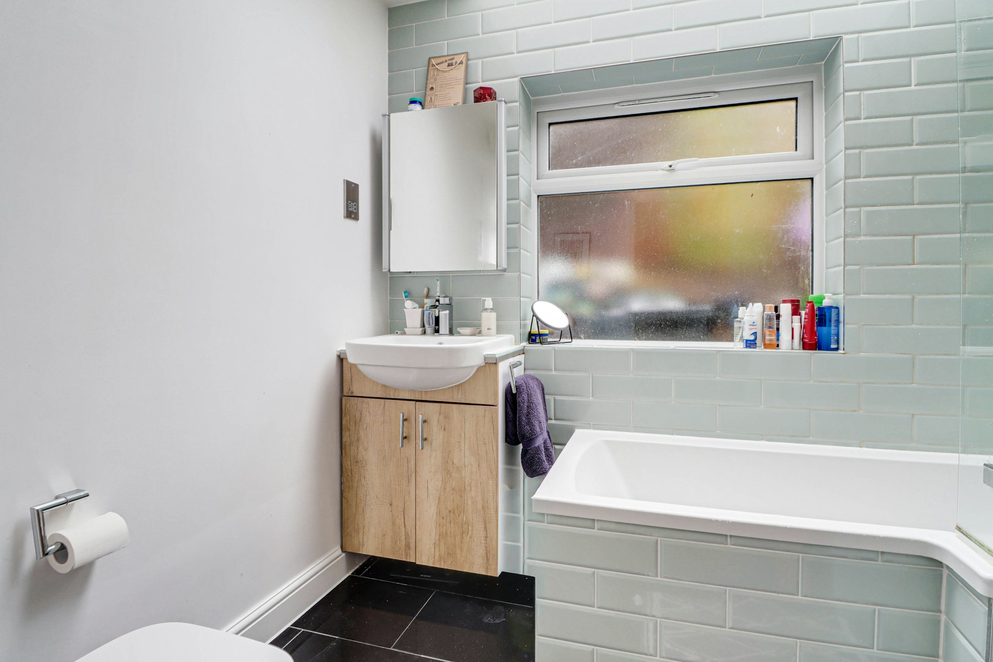 Beyond the kitchen is the contemporary family bathroom, filled with light from overhead and double aspect windows. It has a P-shaped bathtub with shower over and finished with stylish bevelled tiles, mirrored vanity unit and sink, and large black granite floor tiles.
