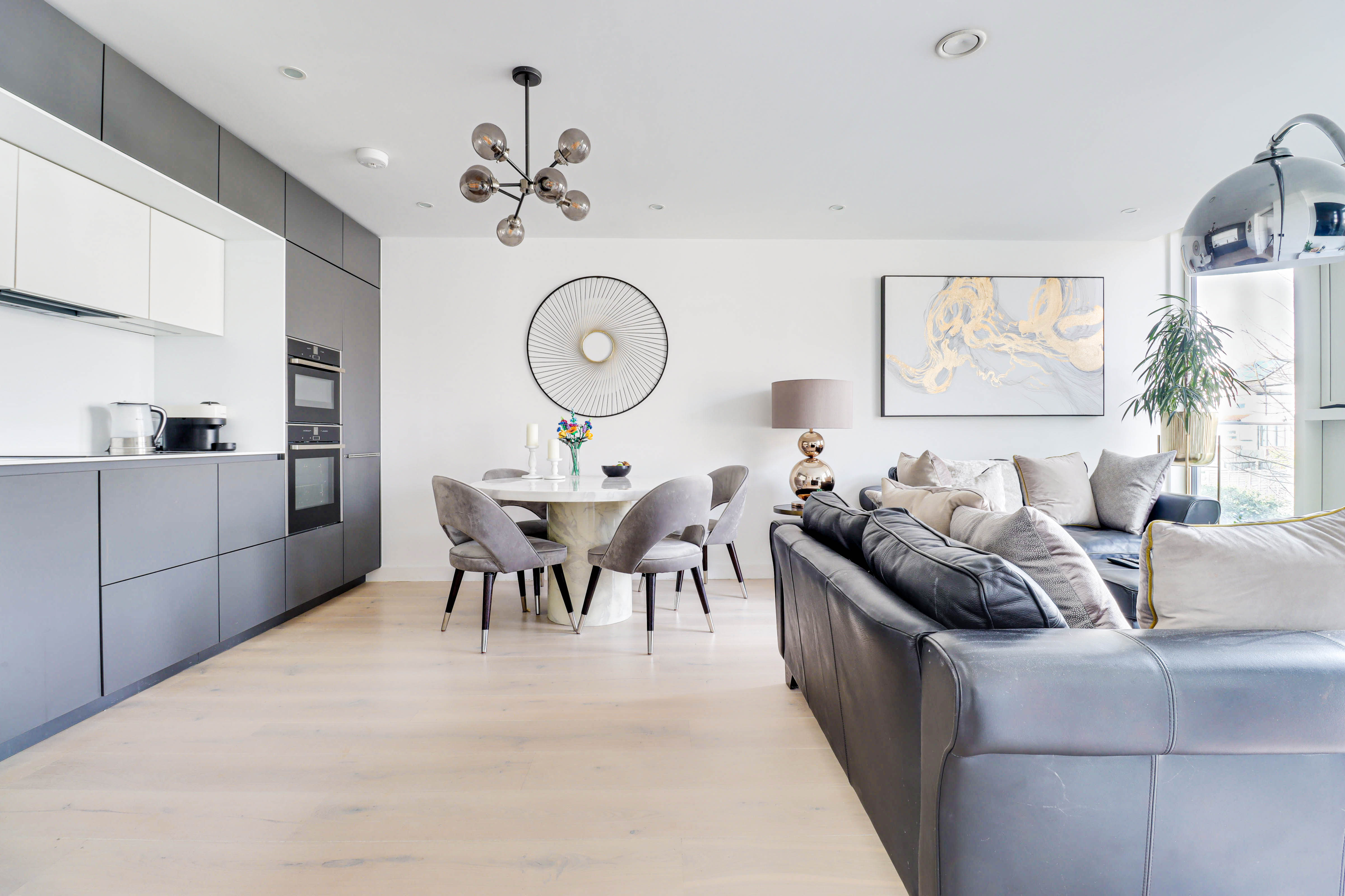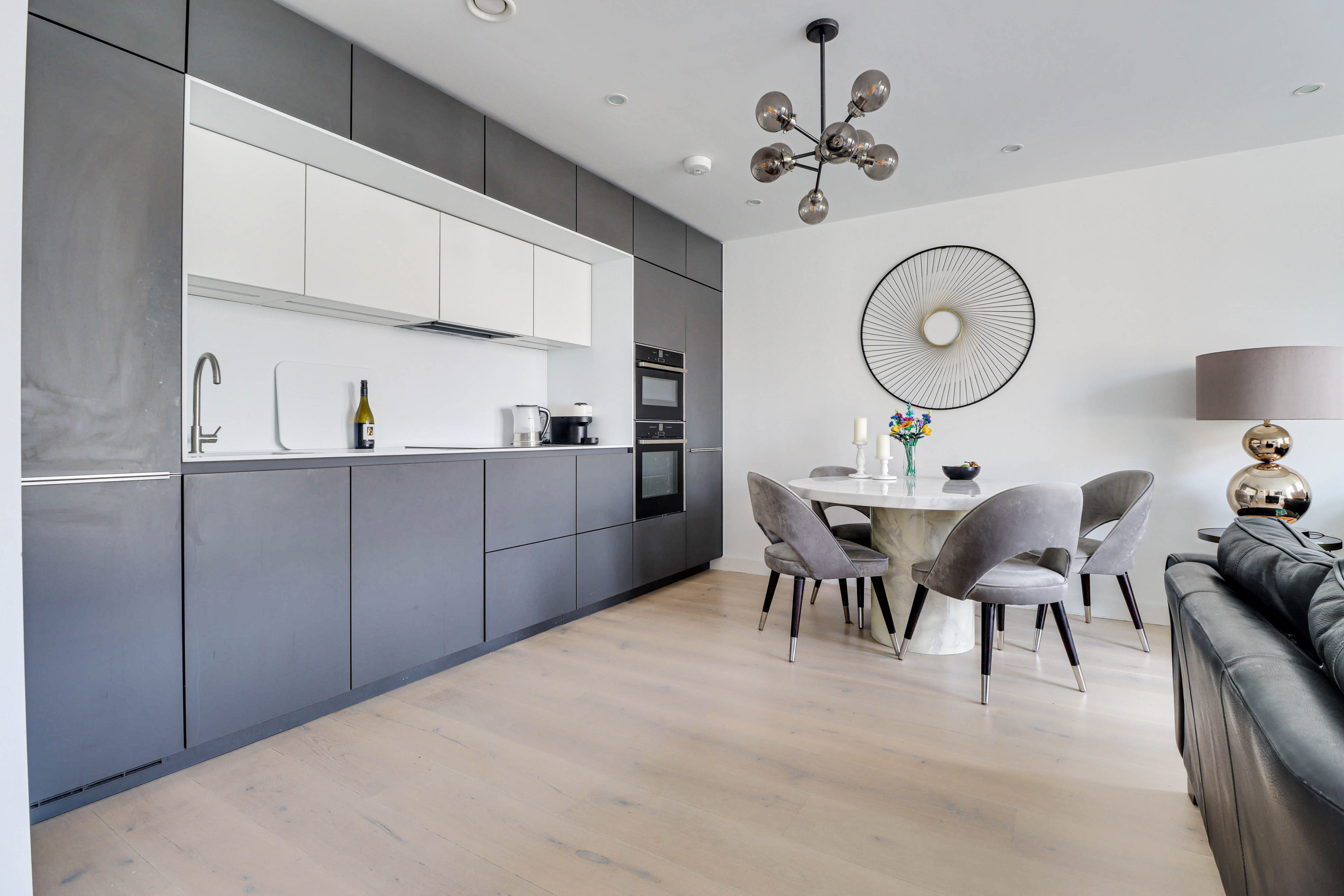 The apartment offers a high quality finish throughout and features include; underfloor heating to all rooms, full height windows and doors which flood the apartment with natural light, a Poggenpohl kitchen with integrated NEFF appliances, utility room, small balconies off the living room and both bedrooms, secure underground parking and concierge service.