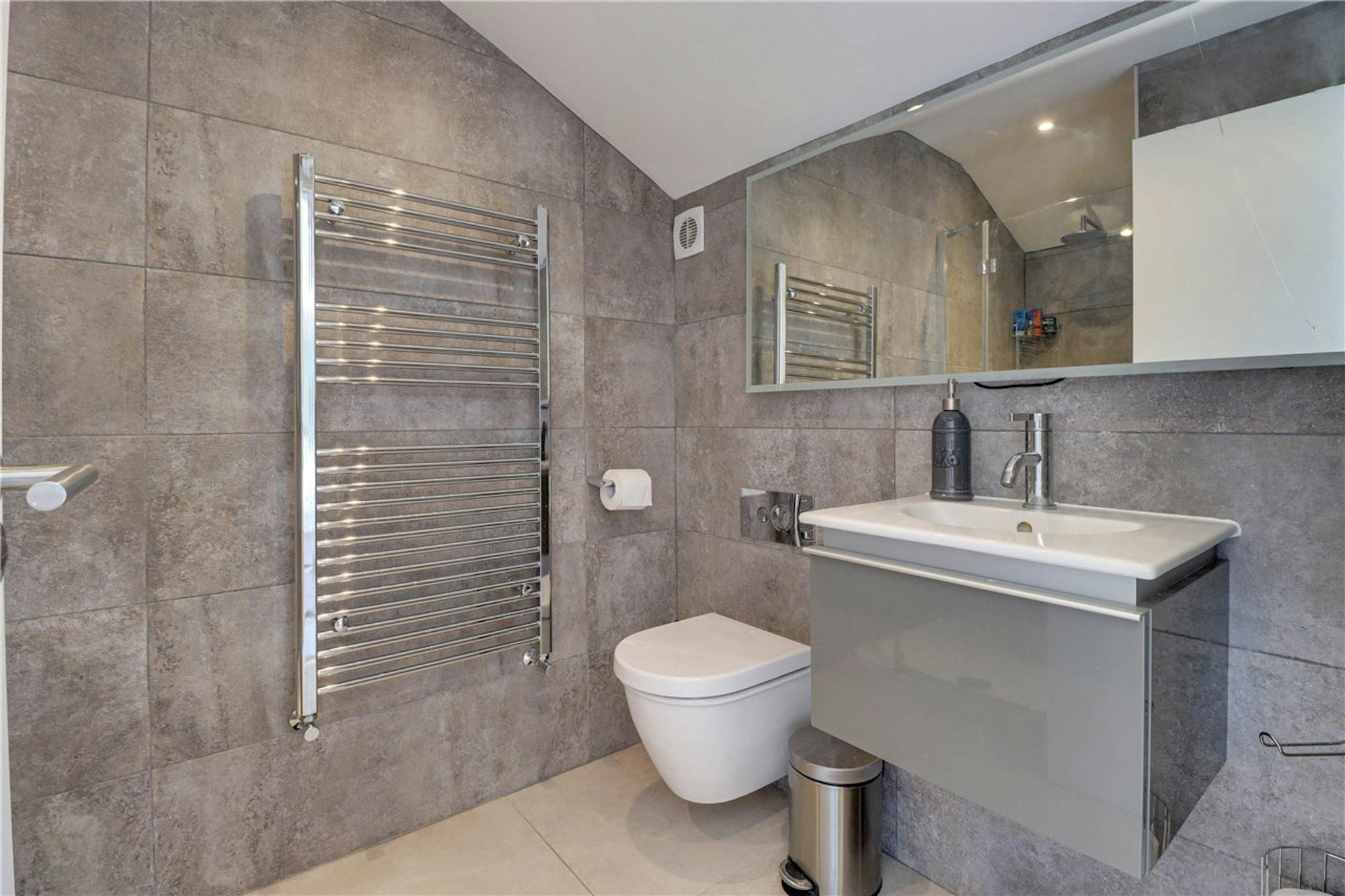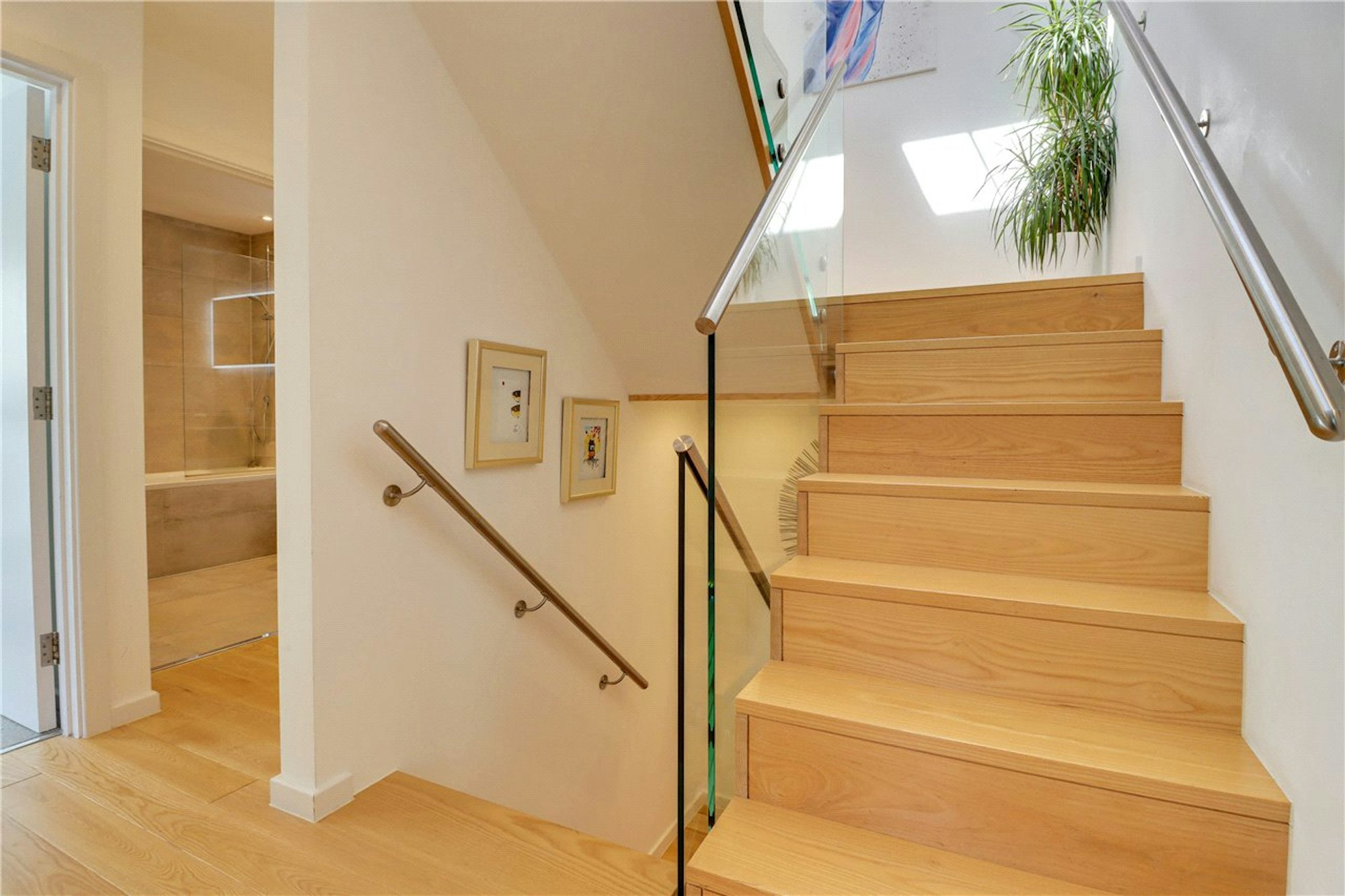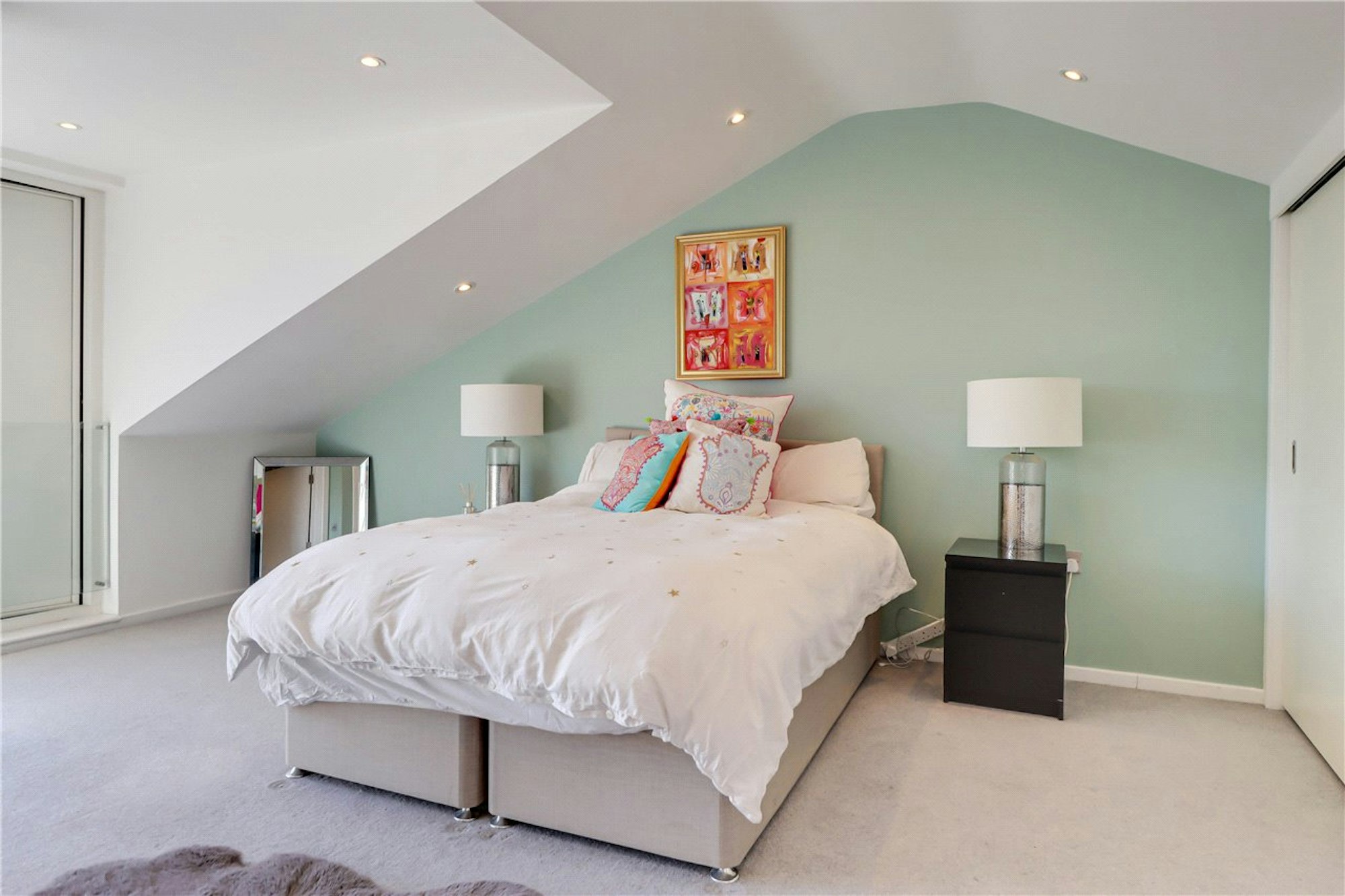 The principal bedroom occupies the second floor and has rooftop views over St Albans through the large full height windows. There is excellent provision for storage, with large wardrobes across the full width of the room and a fully tiled en-suite shower room.