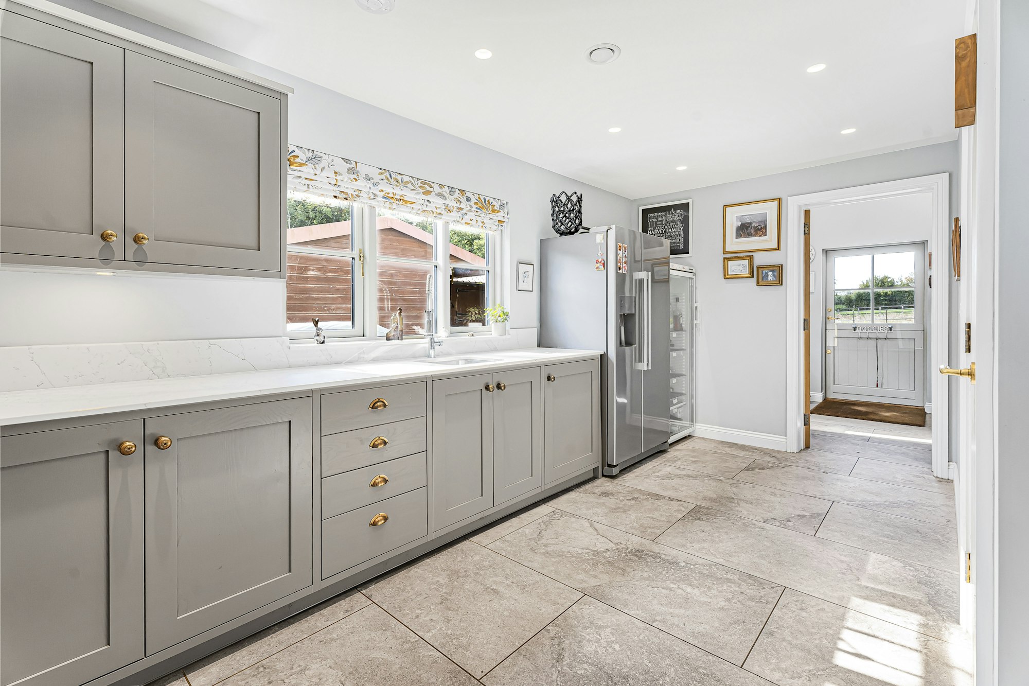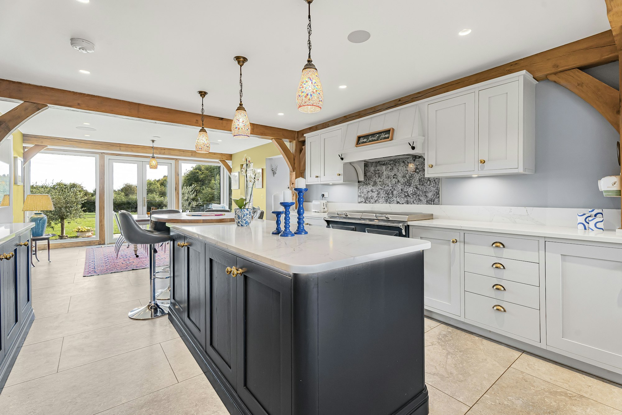 The accommodation is generous over two storeys with Oak framed entrance porch leading to a spacious entrance hall with natural wood doors leading to the stunning double aspect through kitchen/family room with fully fitted hand built units, Everhot range and central breakfast island, open plan to the delightful family/dining area with triple aspect outlook over the rear gardens and paddocks with French doors to the Natural limestone patio. There is a large utility room similarly thoughtfully fitted as well as adjoining boot room with vaulted ceiling. The living room, is double aspect and has a modern Inglenook fireplace with multi-fuel burner and doorway to a large study overlooking the rear garden. On the first floor the landing leads to the principal bedroom with feature vaulted ceiling and doors to Juliette balcony suite which incorporates a fitted dressing room and ensuite shower room. There are three further bedrooms and a luxury family bathroom.