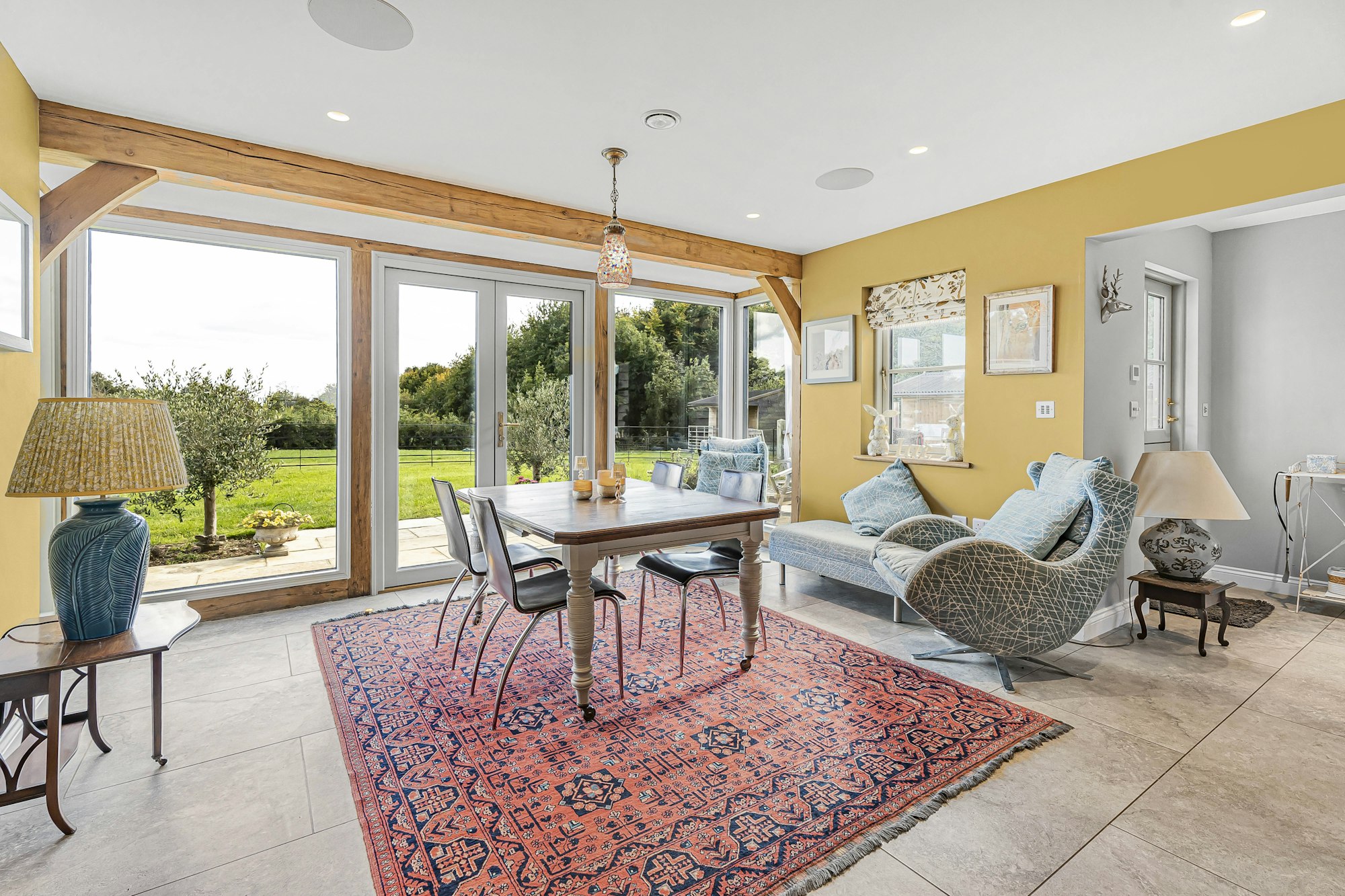 A modern family home combining traditional character with the latest technology and materials to create this beautiful property with oak frame detailing and exceptional energy performance, set in a quiet rural landscape. Supplied by Border Oak providers of bespoke oak framed buildings featured on Grand Designs, this home specifically designed for the current owners incorporates triple glazing, air source heat pump, ventilation and heat recovery system and a high degree of insulation making this home very economical and fully prepared for modern living.