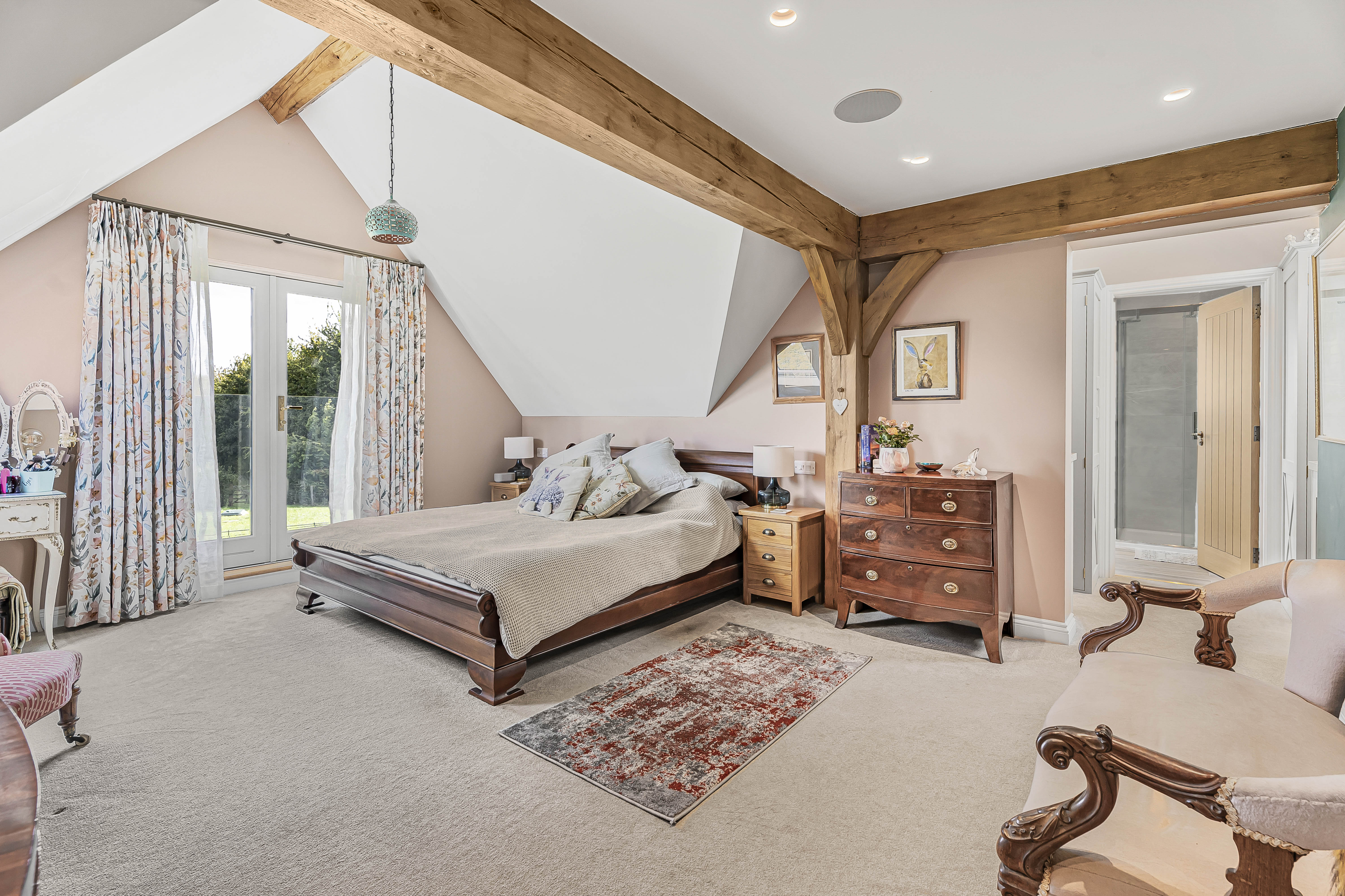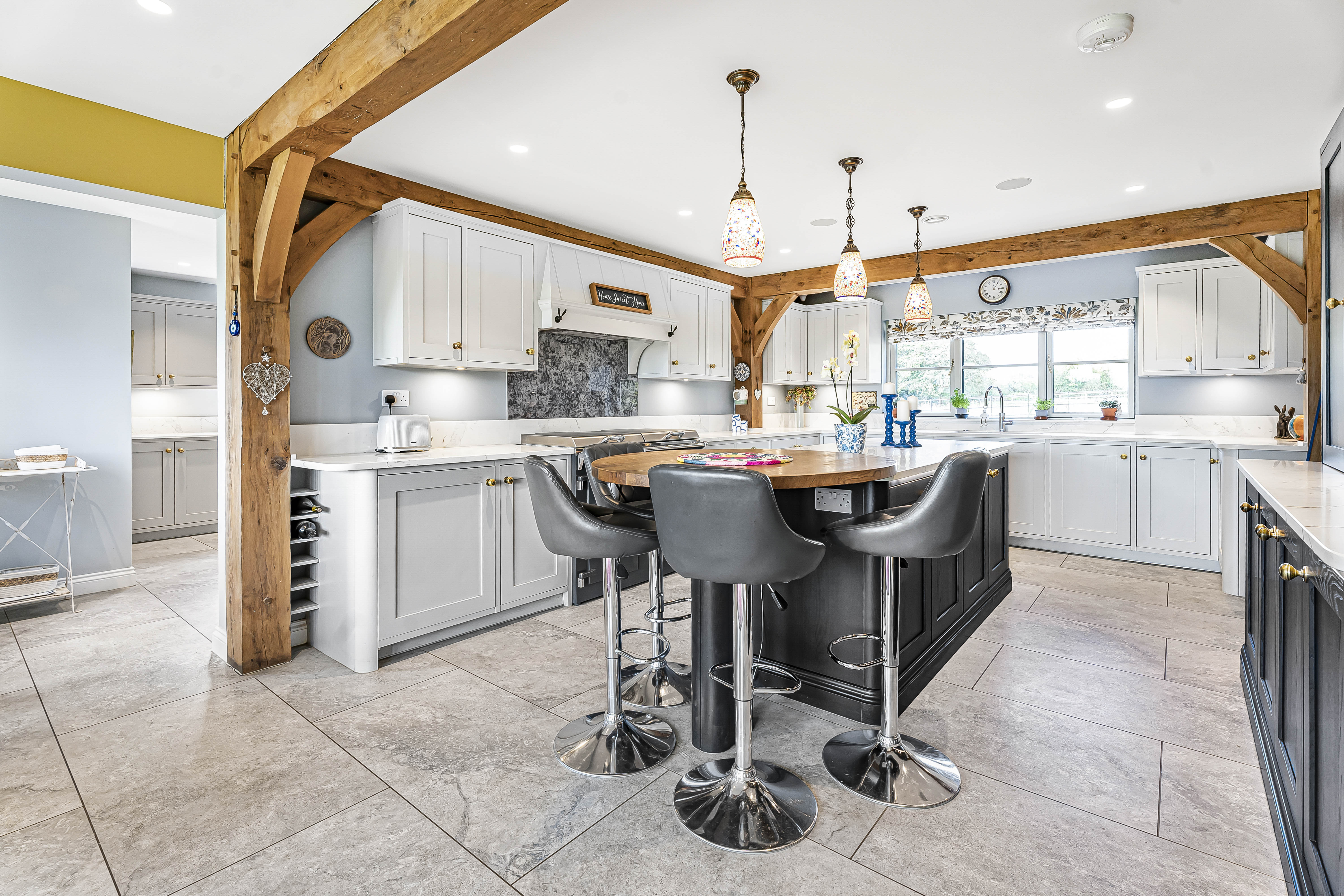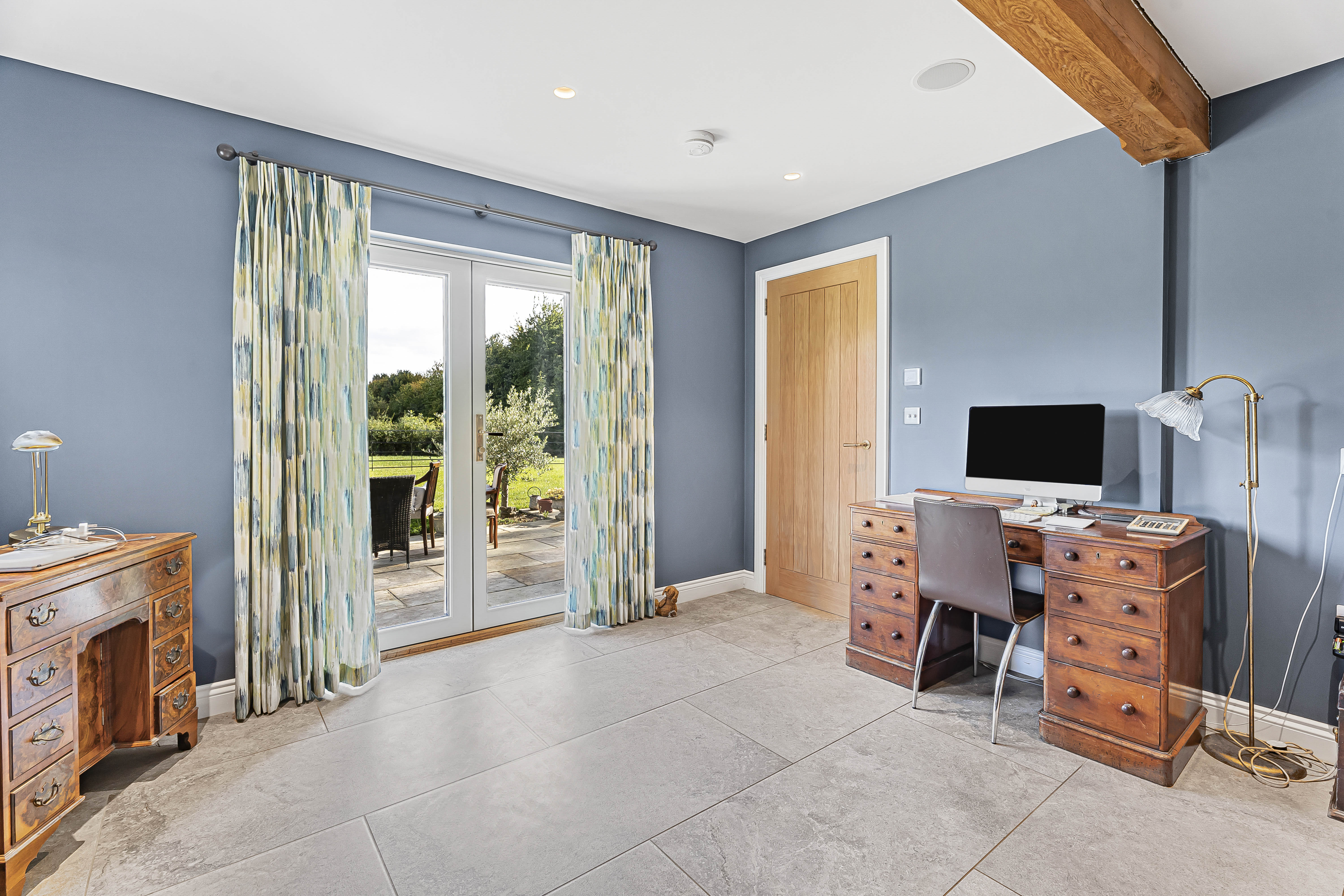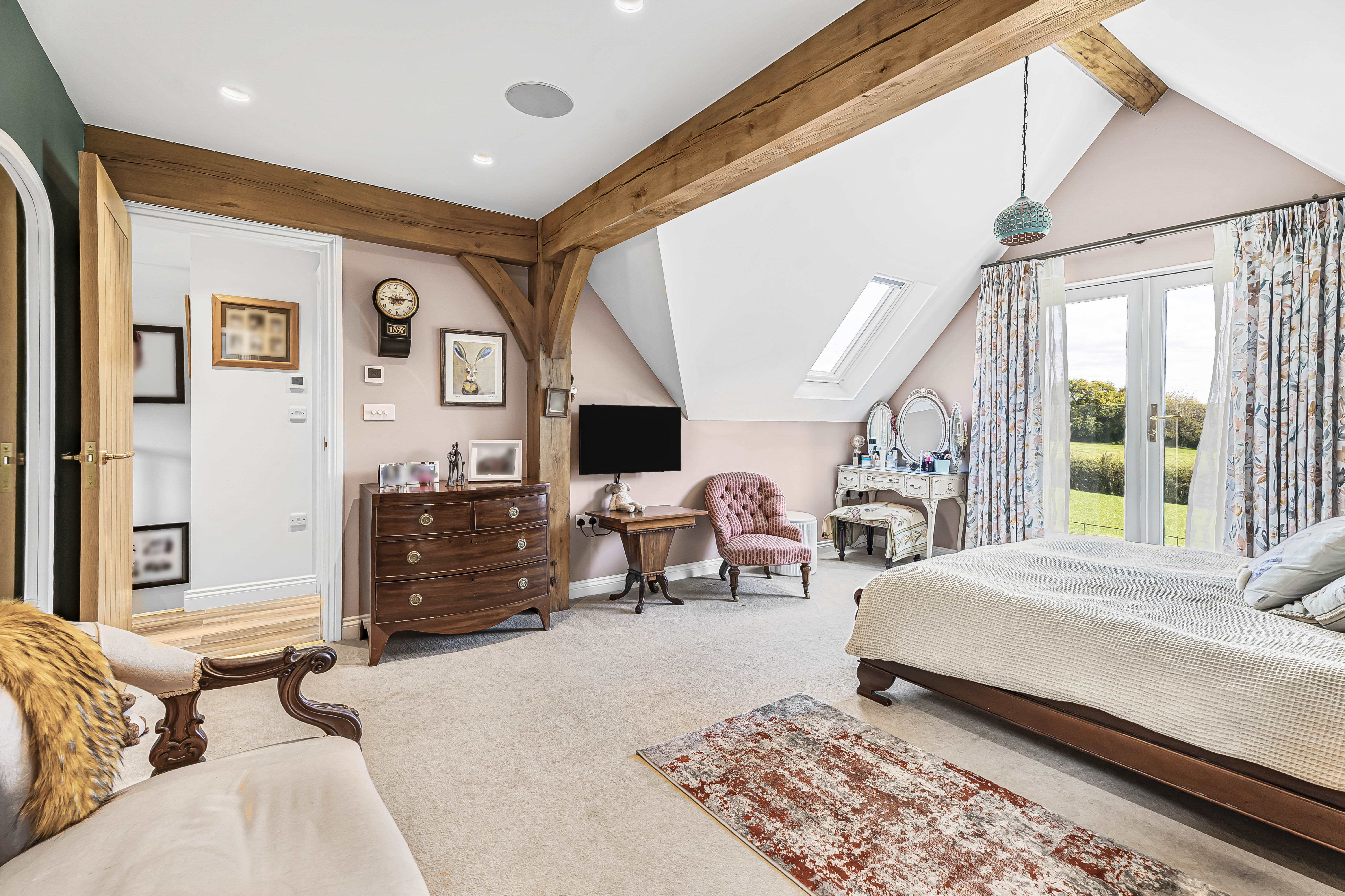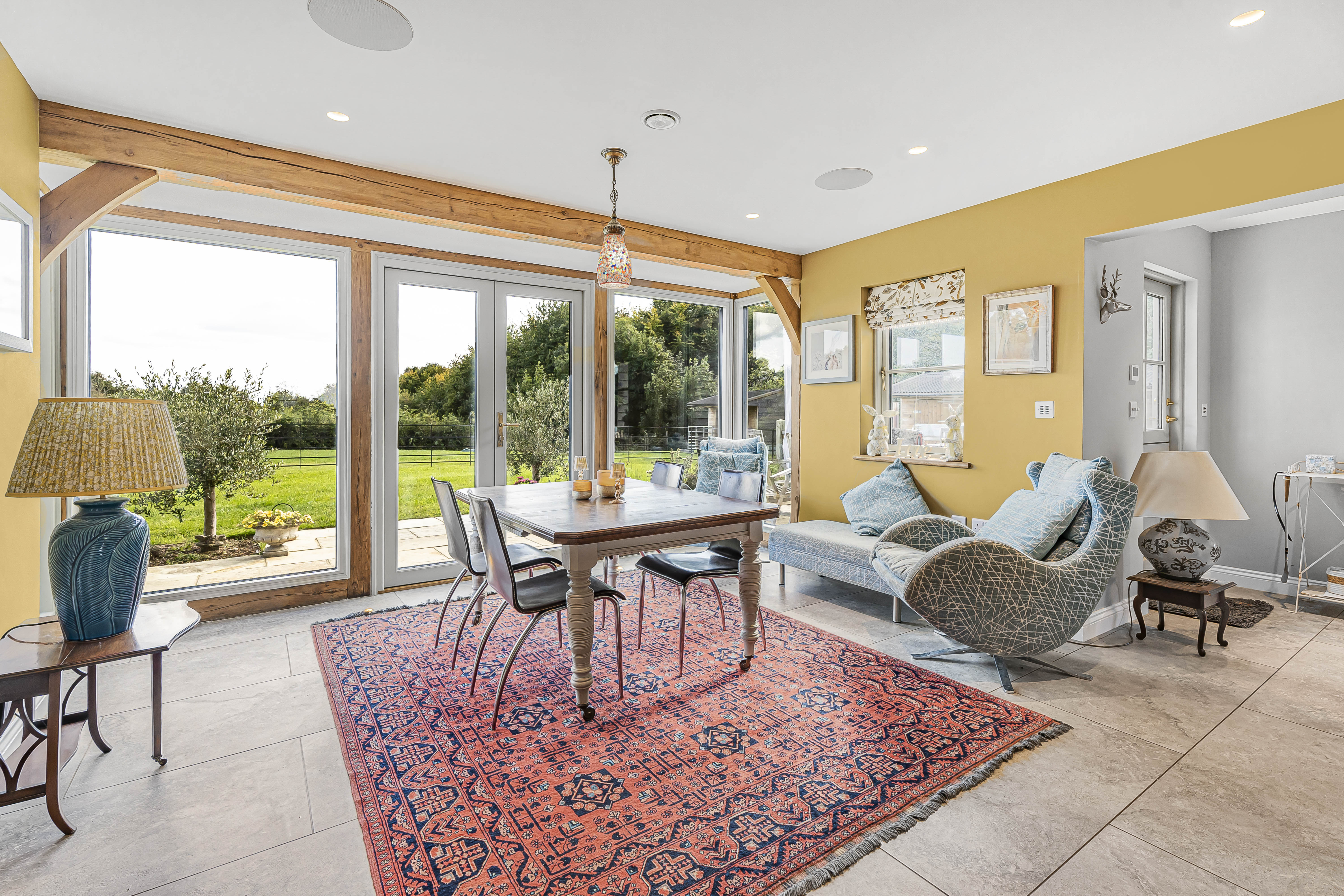 The accommodation is generous over two storeys with Oak framed entrance porch leading to a spacious entrance hall with natural wood doors leading to the stunning double aspect through kitchen/family room with fully fitted hand built units, Everhot range and central breakfast island, open plan to the delightful family/dining area with triple aspect outlook over the rear gardens and paddocks with French doors to the Natural limestone patio. There is a large utility room similarly thoughtfully fitted as well as adjoining boot room with vaulted ceiling. The living room, is double aspect and has a modern Inglenook fireplace with multi-fuel burner and doorway to a large study overlooking the rear garden. On the first floor the landing leads to the principal bedroom with feature vaulted ceiling and doors to Juliette balcony suite which incorporates a fitted dressing room and ensuite shower room. There are three further bedrooms and a luxury family bathroom.
