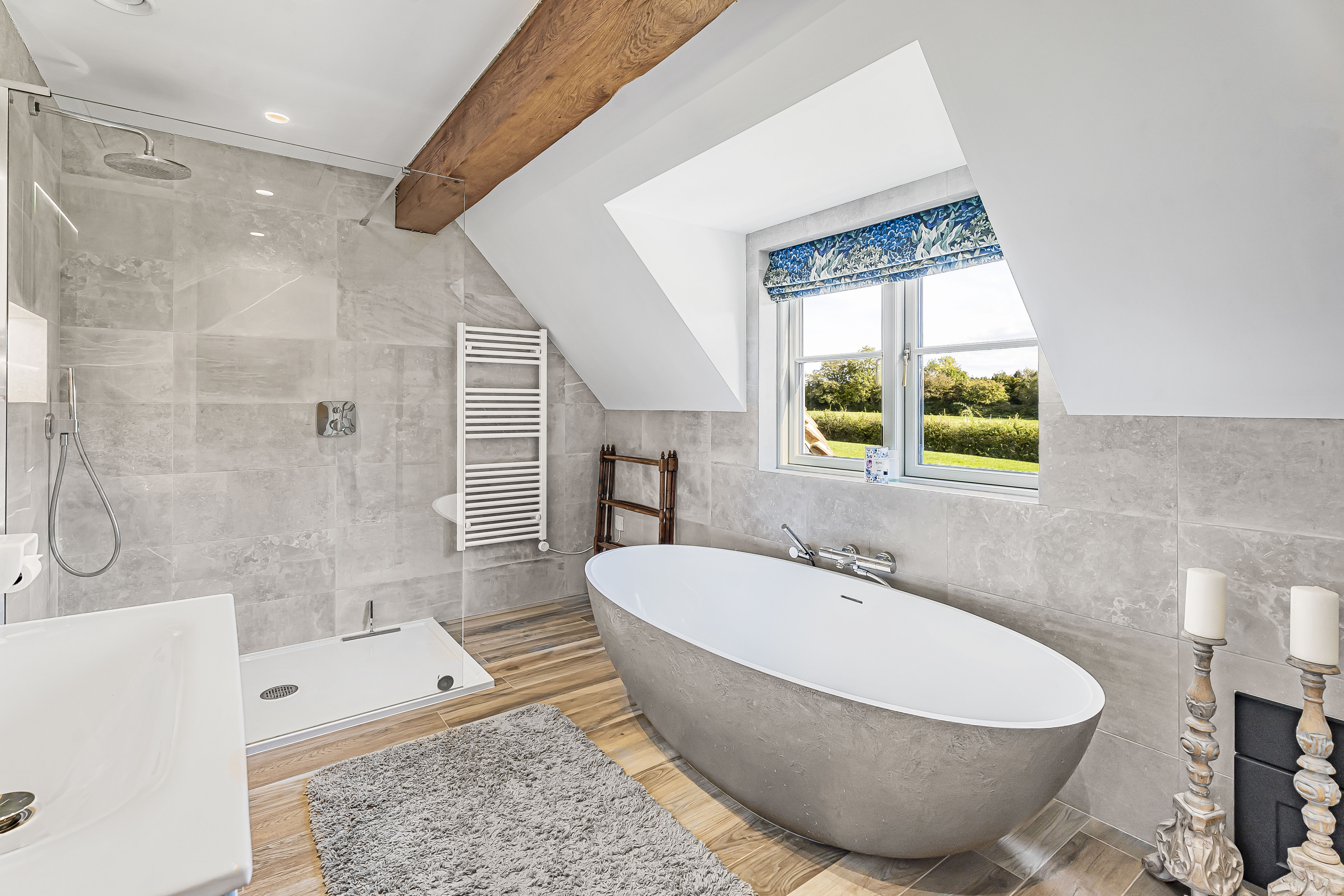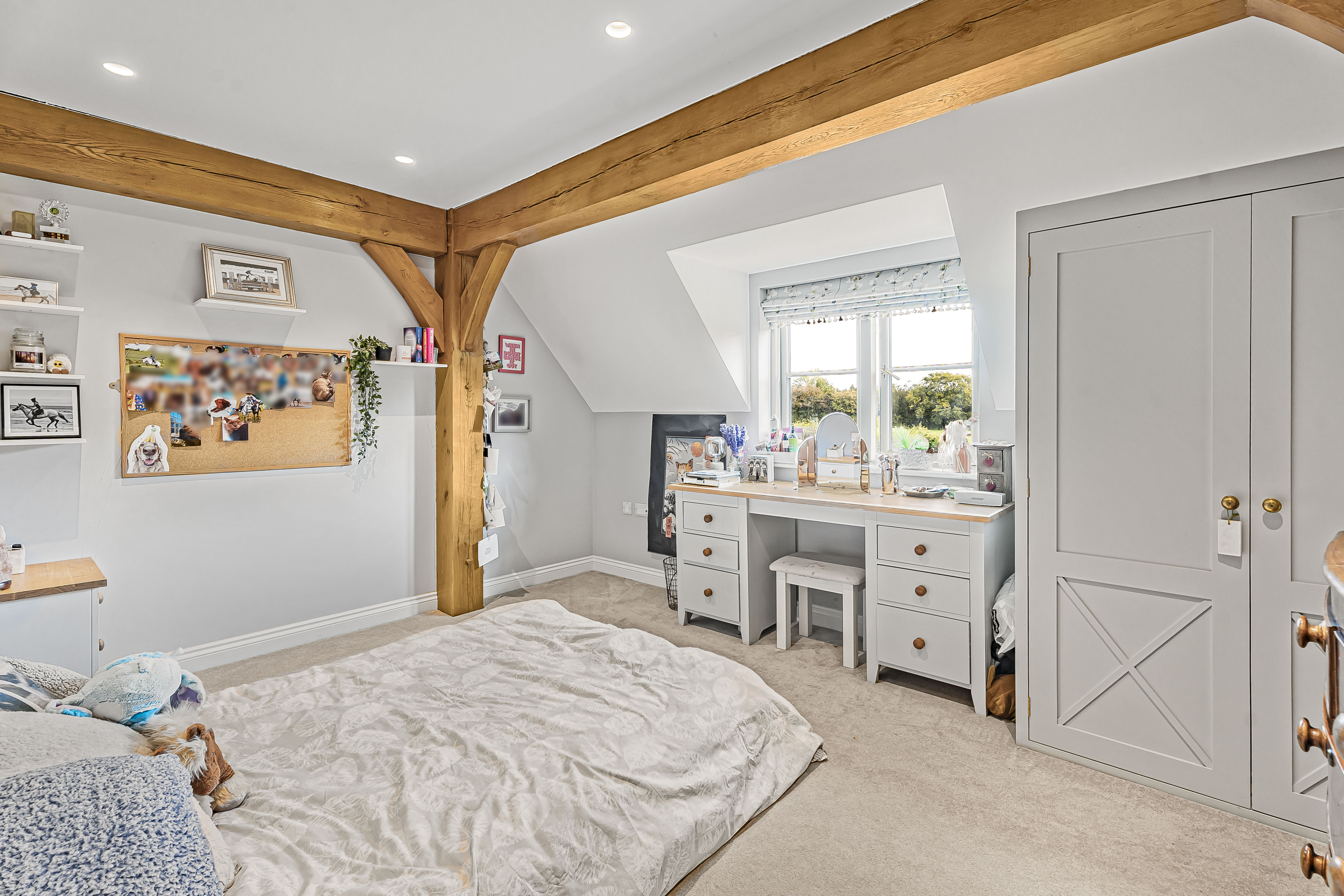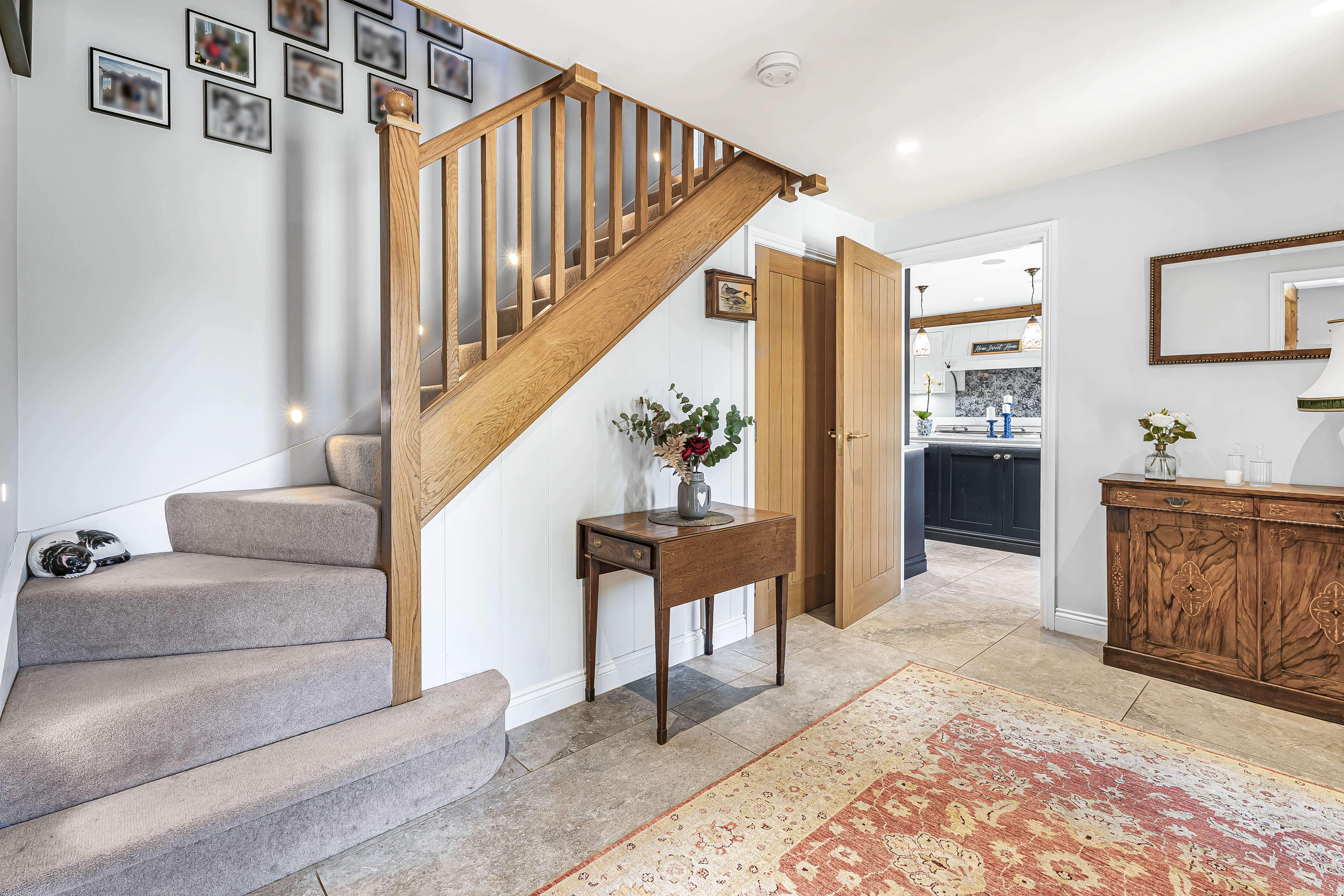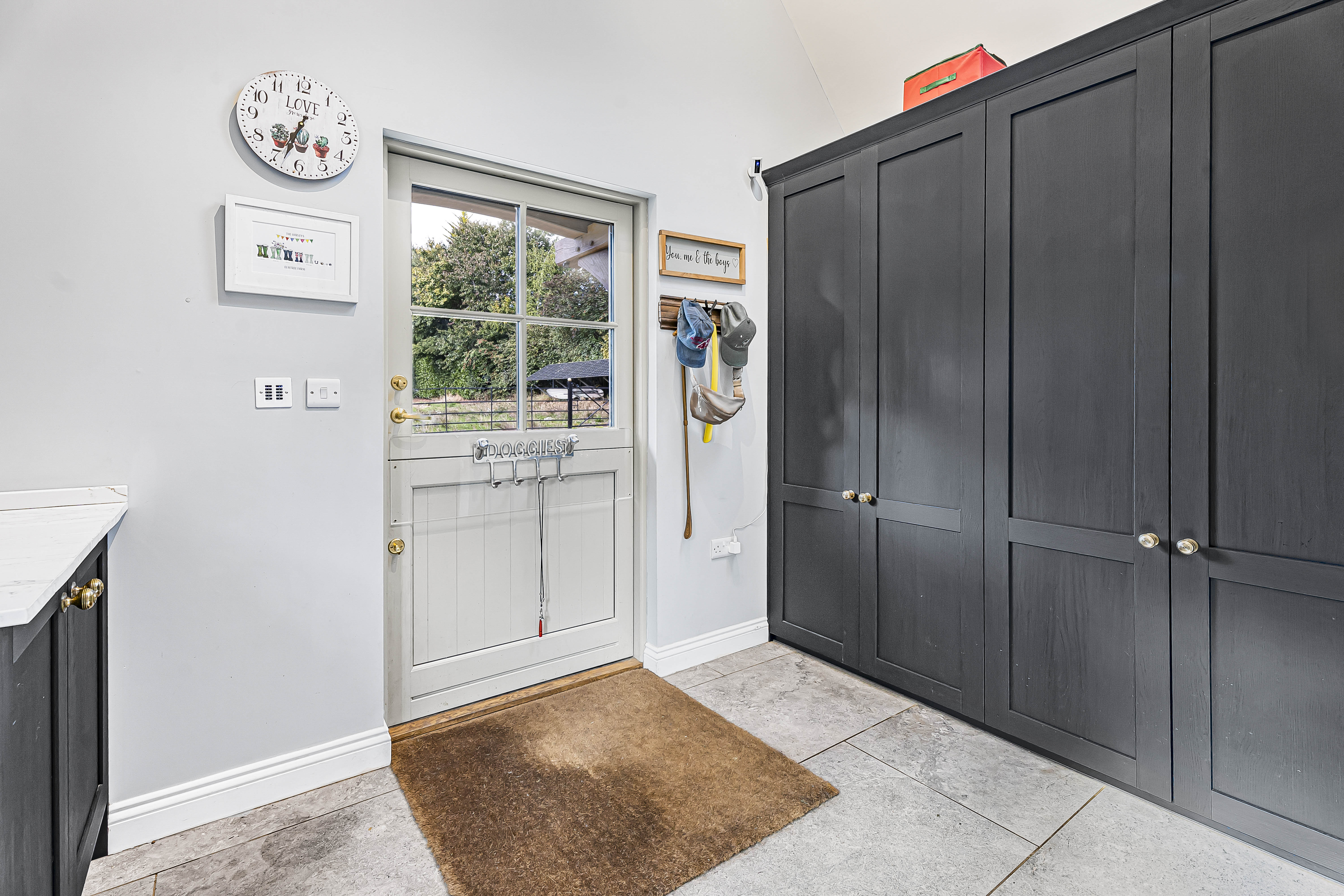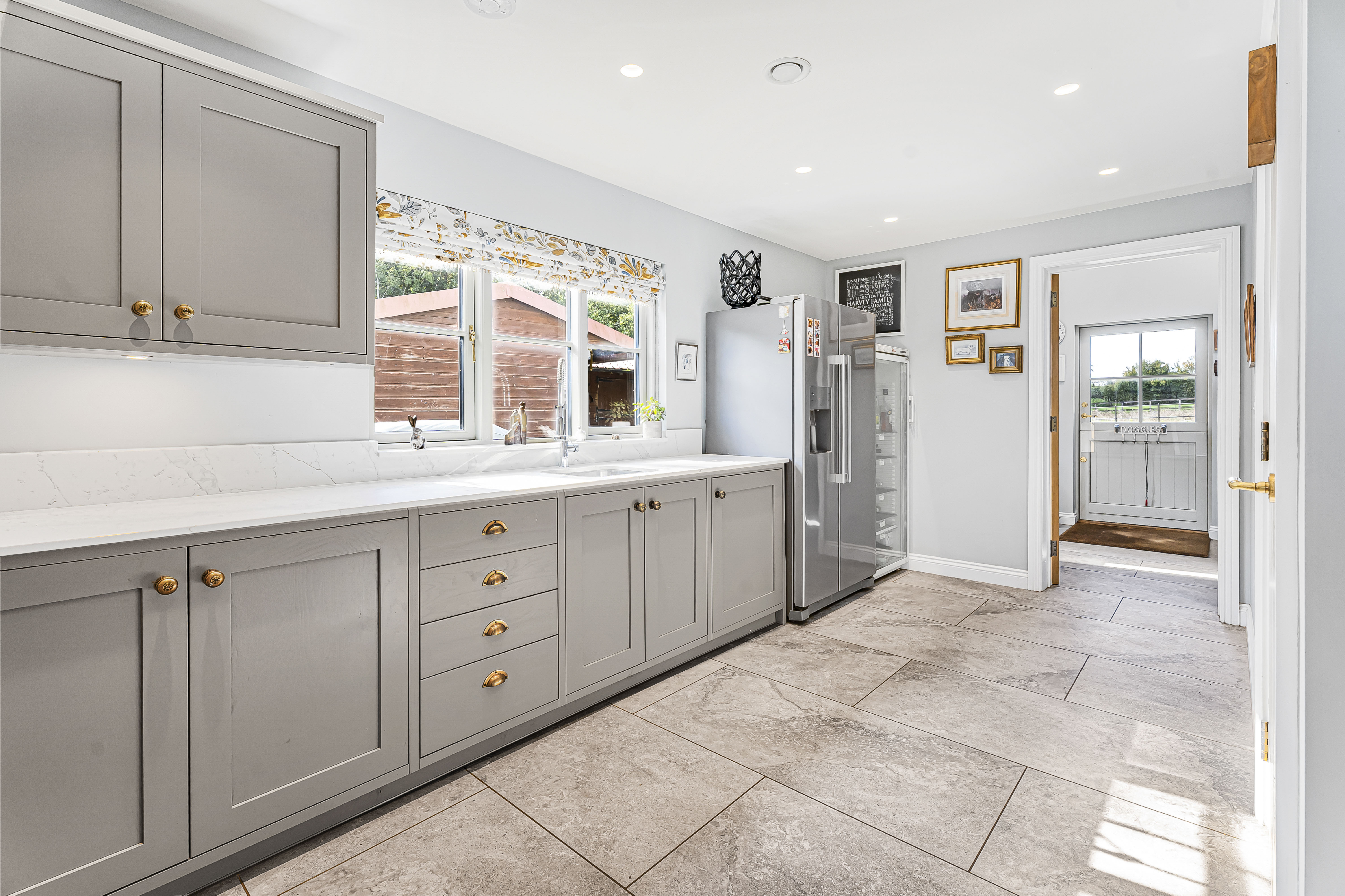 The accommodation is generous over two storeys with Oak framed entrance porch leading to a spacious entrance hall with natural wood doors leading to the stunning double aspect through kitchen/family room with fully fitted hand built units, Everhot range and central breakfast island, open plan to the delightful family/dining area with triple aspect outlook over the rear gardens and paddocks with French doors to the Natural limestone patio. There is a large utility room similarly thoughtfully fitted as well as adjoining boot room with vaulted ceiling. The living room, is double aspect and has a modern Inglenook fireplace with multi-fuel burner and doorway to a large study overlooking the rear garden. On the first floor the landing leads to the principal bedroom with feature vaulted ceiling and doors to Juliette balcony suite which incorporates a fitted dressing room and ensuite shower room. There are three further bedrooms and a luxury family bathroom.