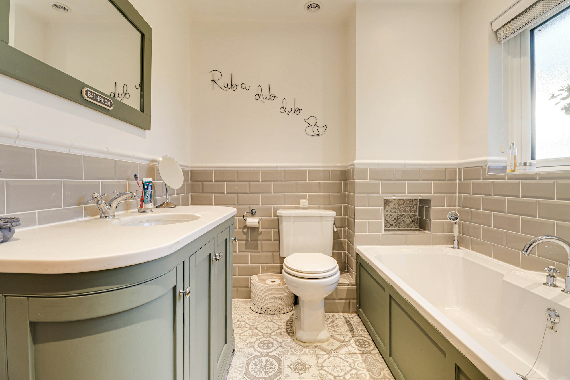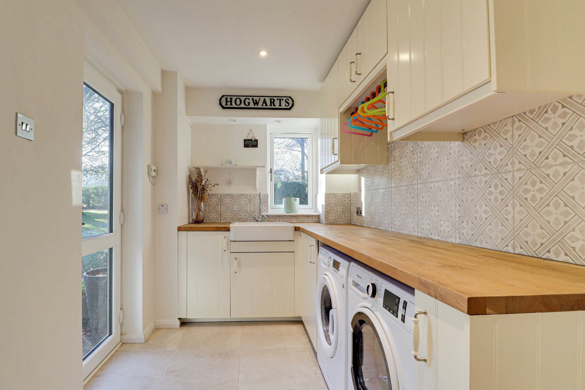 A new Oak porch, fitted in 2024, leads into an attractive hallway. To one side of the property there is a large dual aspect living room which extends from front to back with log burner. The refurbished kitchen/dining area is a wonderful space for entertaining family and friends with bi-fold doors opening out to the garden. The kitchen has been refitted with a stylish range of contemporary units with breakfast bar and high quality integrated appliances, including four multi-functional ovens, an induction hob, boiling tap, fridge-freezer and dishwasher and also benefits from a large larder cupboard and underfloor heating to both the kitchen and the separate utility room. There is also a study and guest cloakroom on this level.