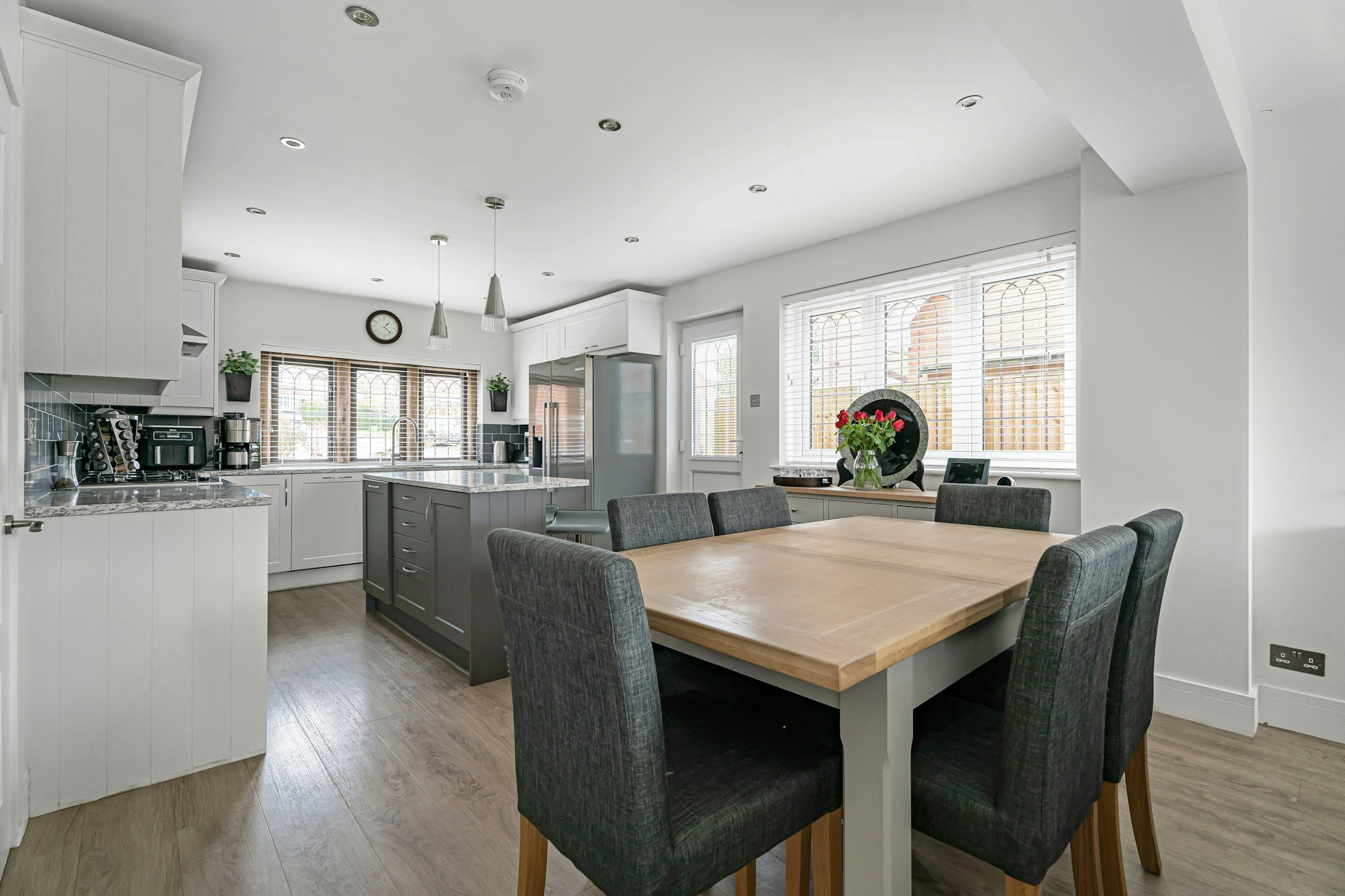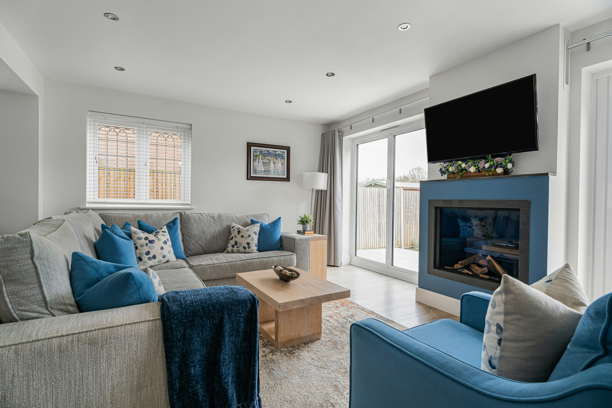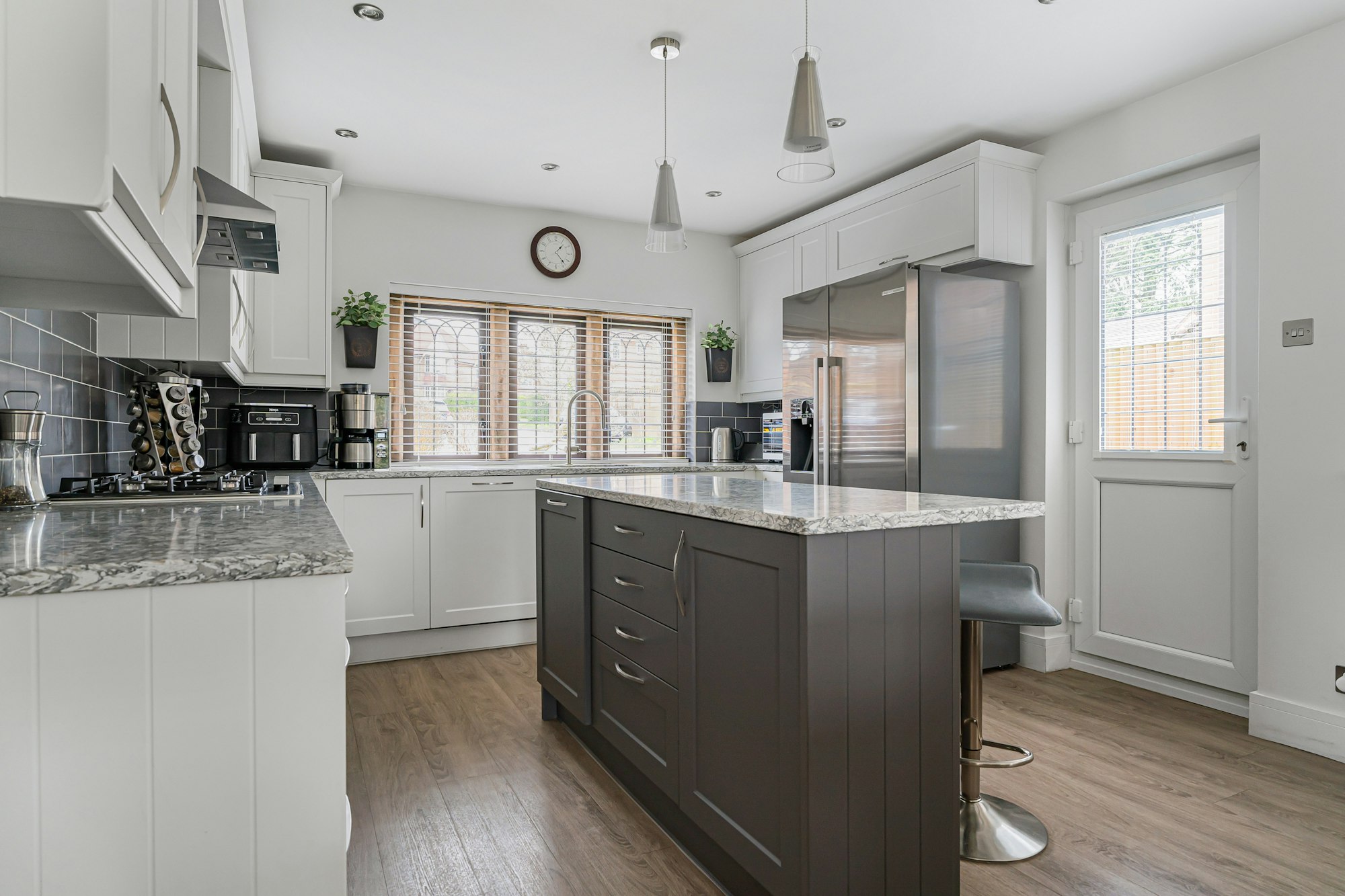An attractive entrance hall leads into a superb open plan living/dining room and kitchen. This is a fabulous space for both relaxing and entertaining. The kitchen is fully fitted with bespoke units and central island and integrated appliances, including a dishwasher, two ovens and space for an American style fridge/freezer. The dual aspect living space overlooks the garden and benefits from a feature fireplace and two sets of bi-fold doors. There is also a separate utility room accessed from the living room and a cloakroom with WC and hand basin off the hallway.