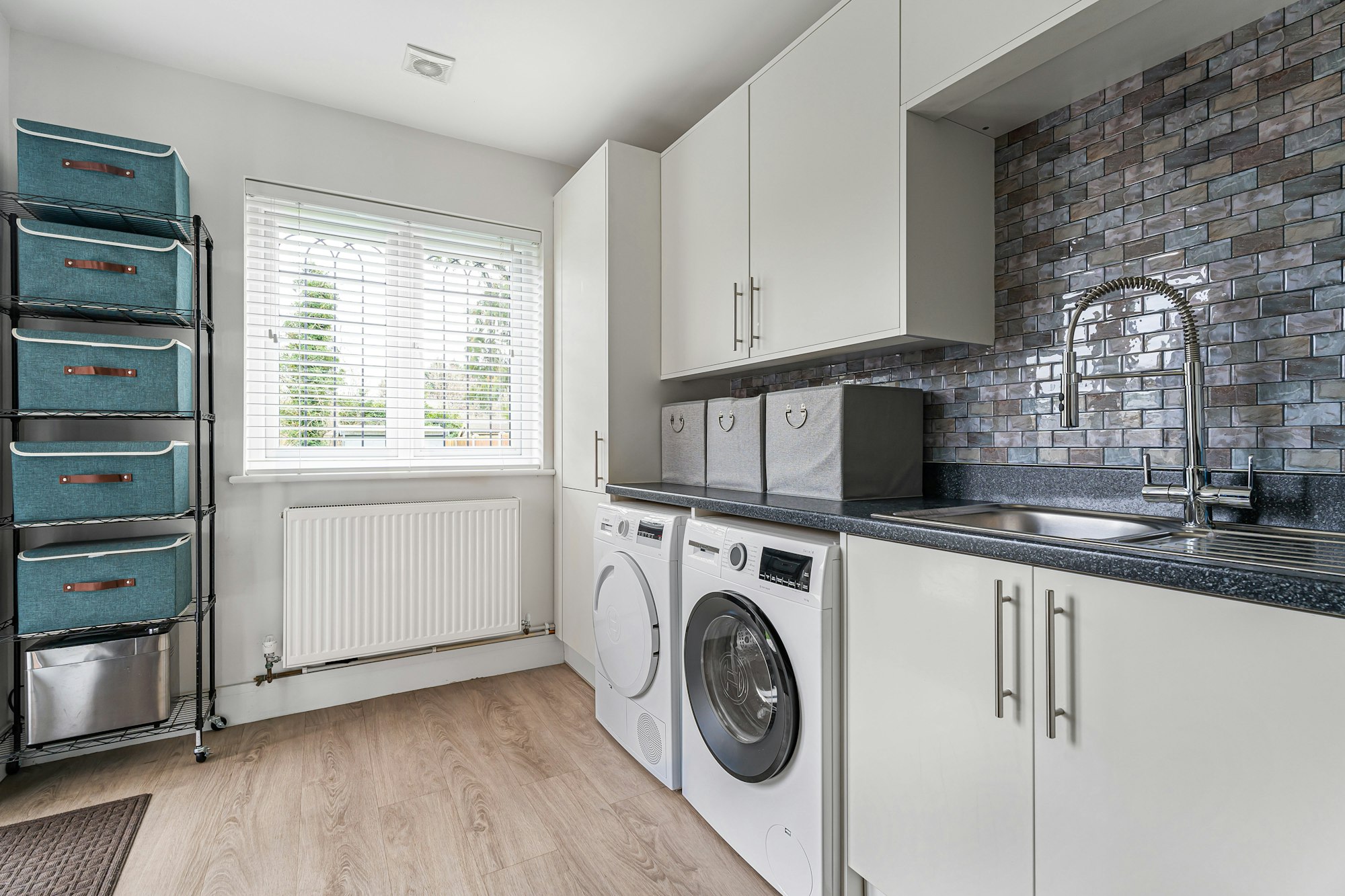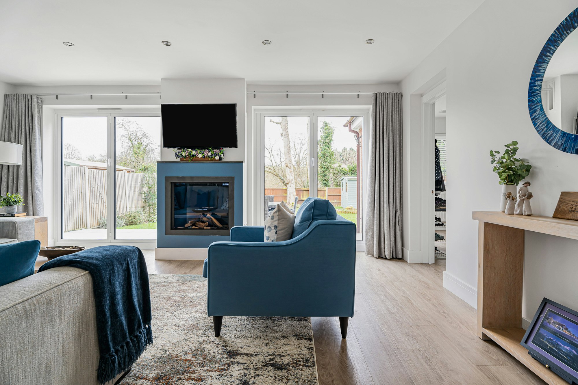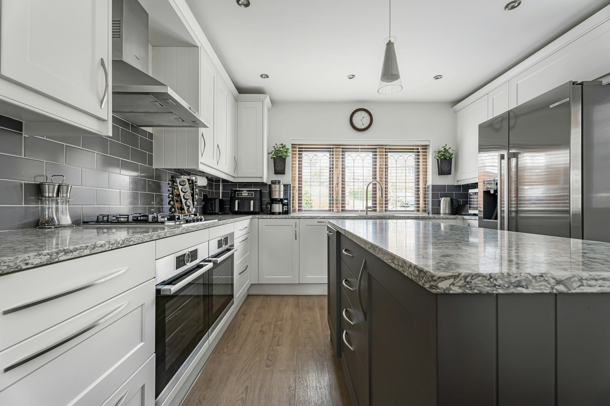 An attractive entrance hall leads into a superb open plan living/dining room and kitchen. This is a fabulous space for both relaxing and entertaining. The kitchen is fully fitted with bespoke units and central island and integrated appliances, including a dishwasher, two ovens and space for an American style fridge/freezer. The dual aspect living space overlooks the garden and benefits from a feature fireplace and two sets of bi-fold doors. There is also a separate utility room accessed from the living room and a cloakroom with WC and hand basin off the hallway.