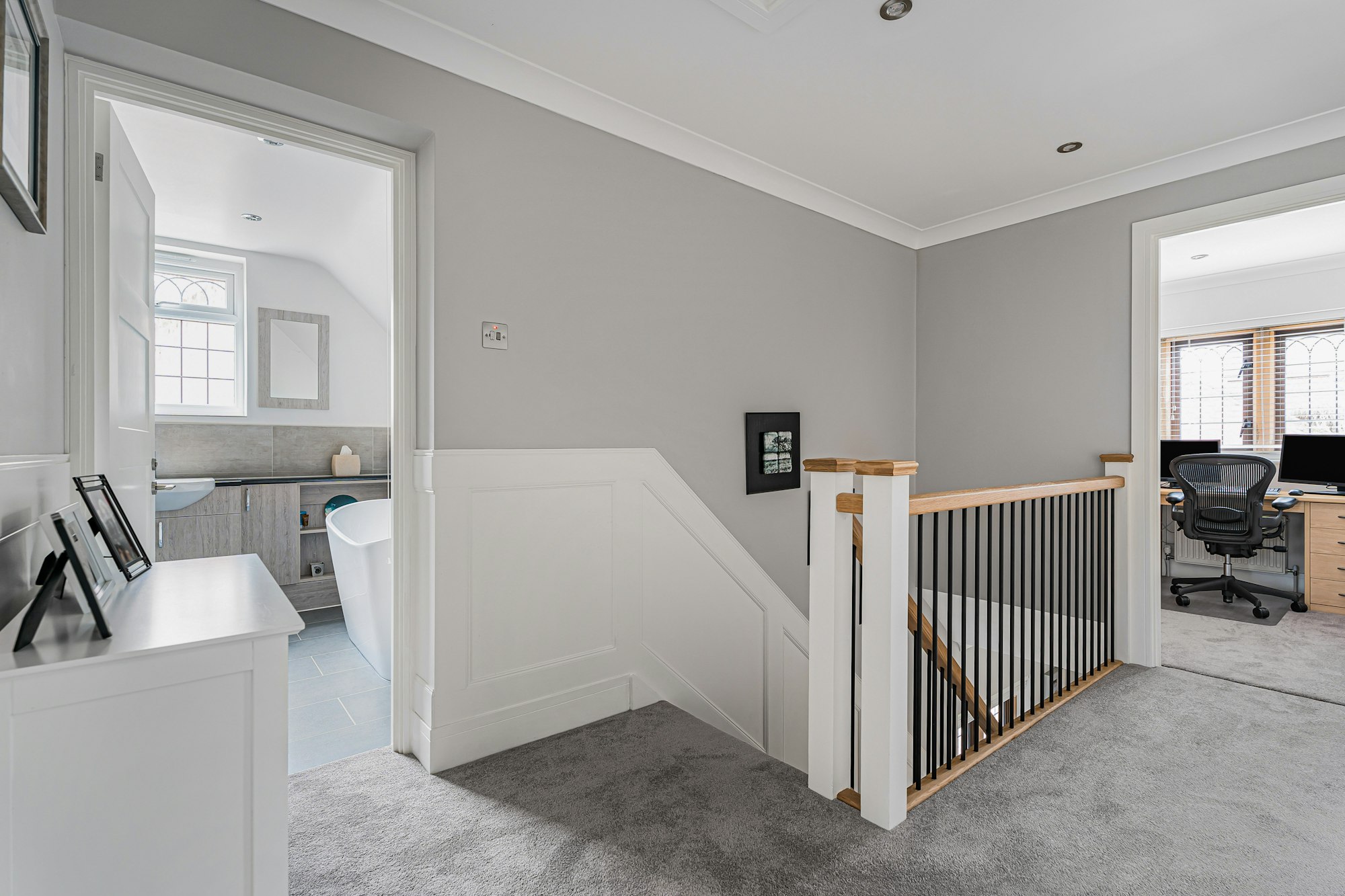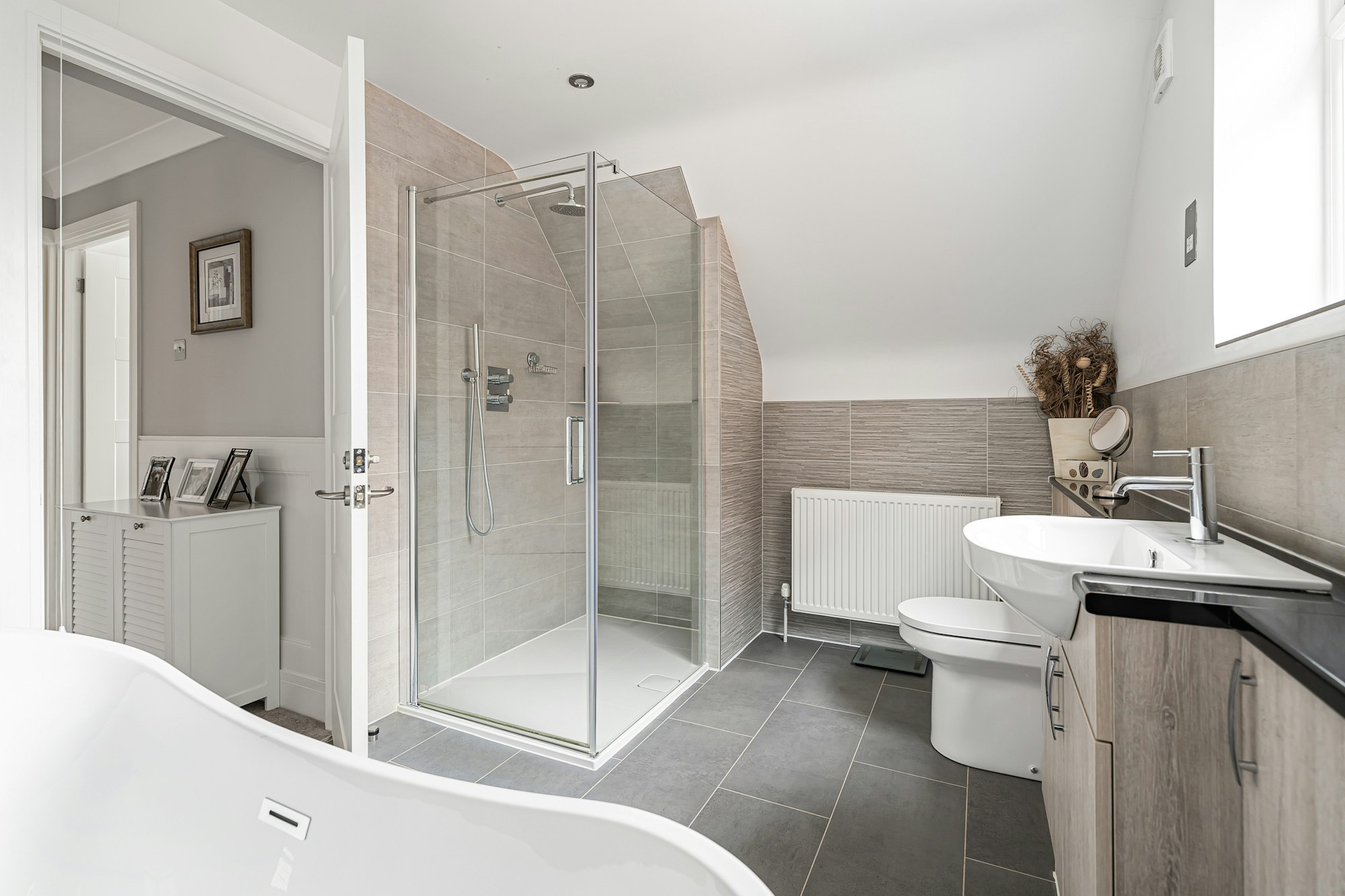 Upstairs there are four bedrooms. The principal bedroom is served by a modern en-suite shower room and the remaining bedrooms enjoy a luxurious family bathroom with freestanding bath and separate shower cubicle.