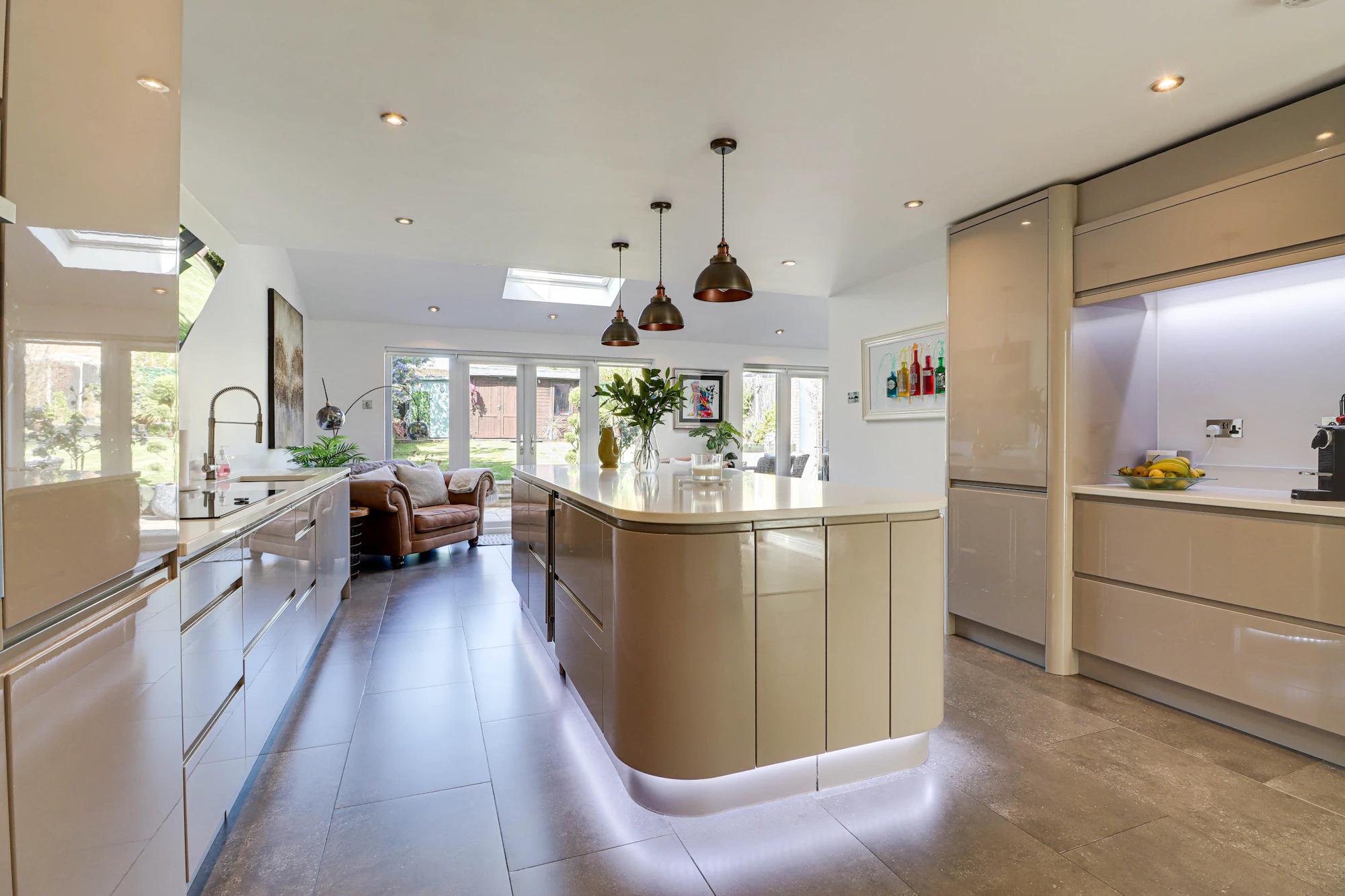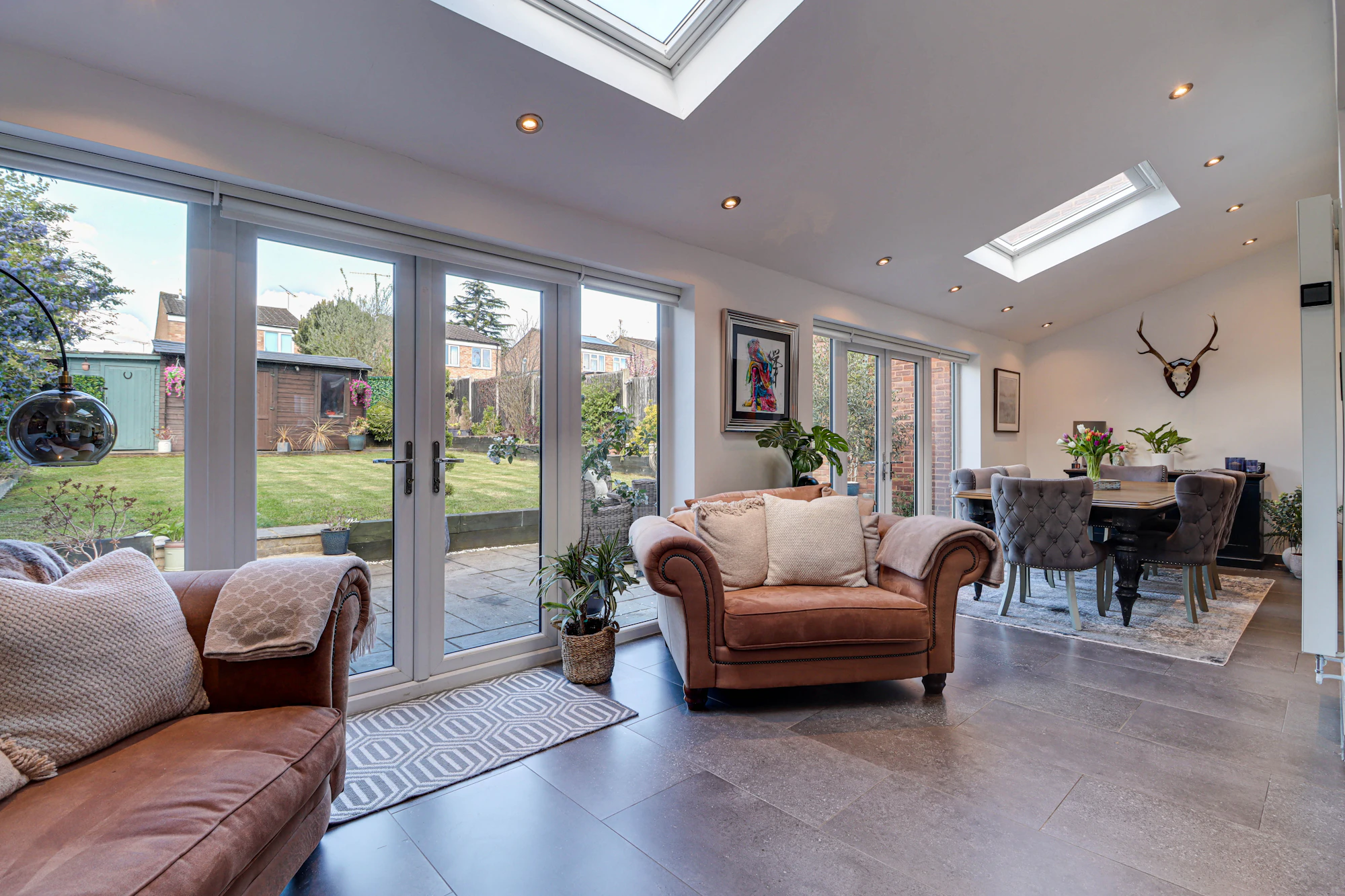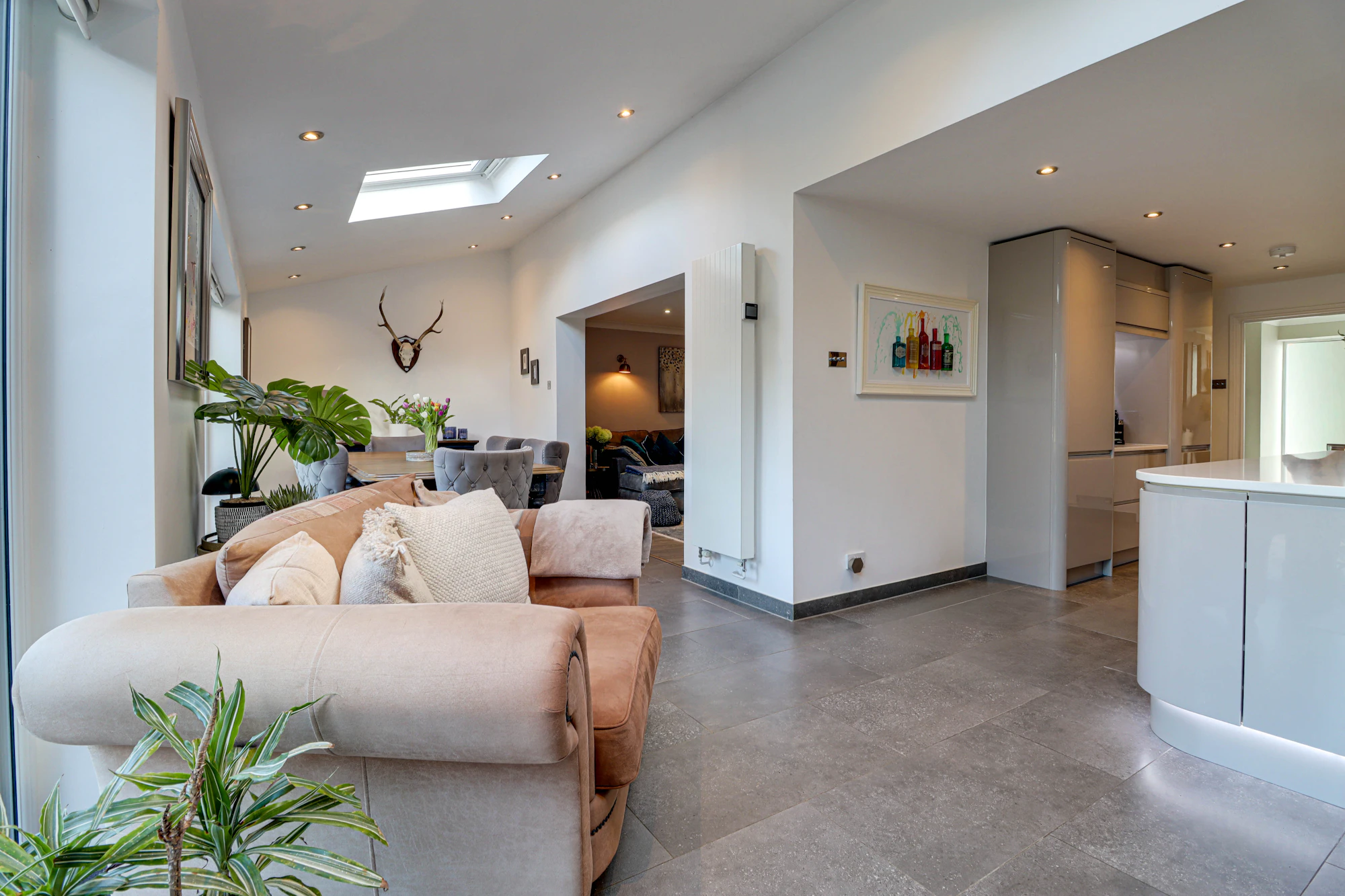A welcoming hallway opens into a study/family room at the front of the property and a stunning open plan kitchen at the rear. The kitchen is fully fitted with a stylish range or contemporary units with integrated appliances and central island, this opens into a dining area with Velux windows and two sets of French doors opening out to the rear garden. The dining area opens into an inviting living room, a wonderful space to entertain and relax with family and friends. A cloakroom with WC and hand basin is located off the hallway and completes this level.
