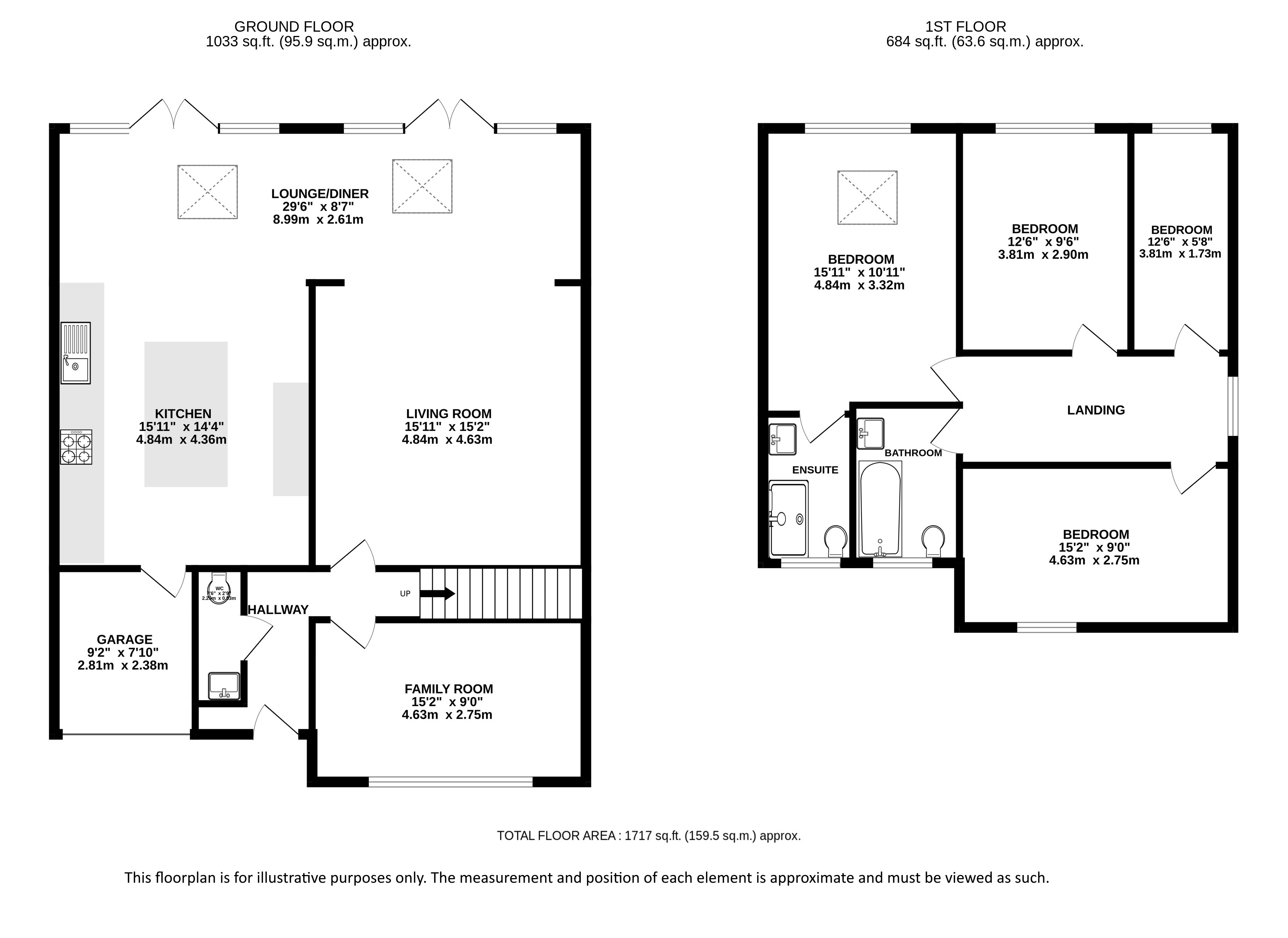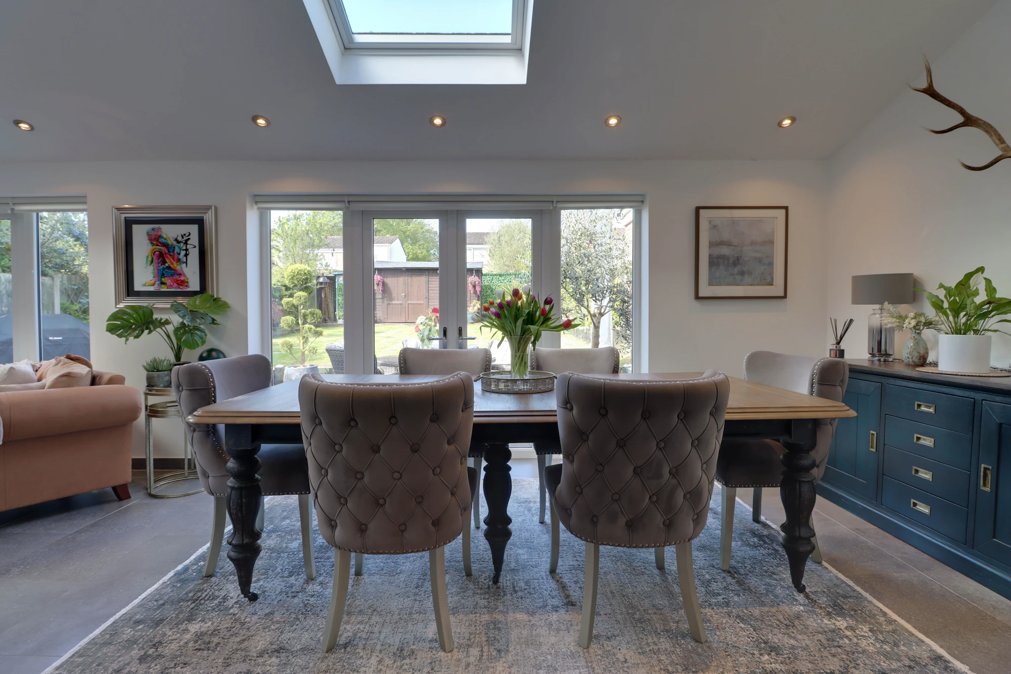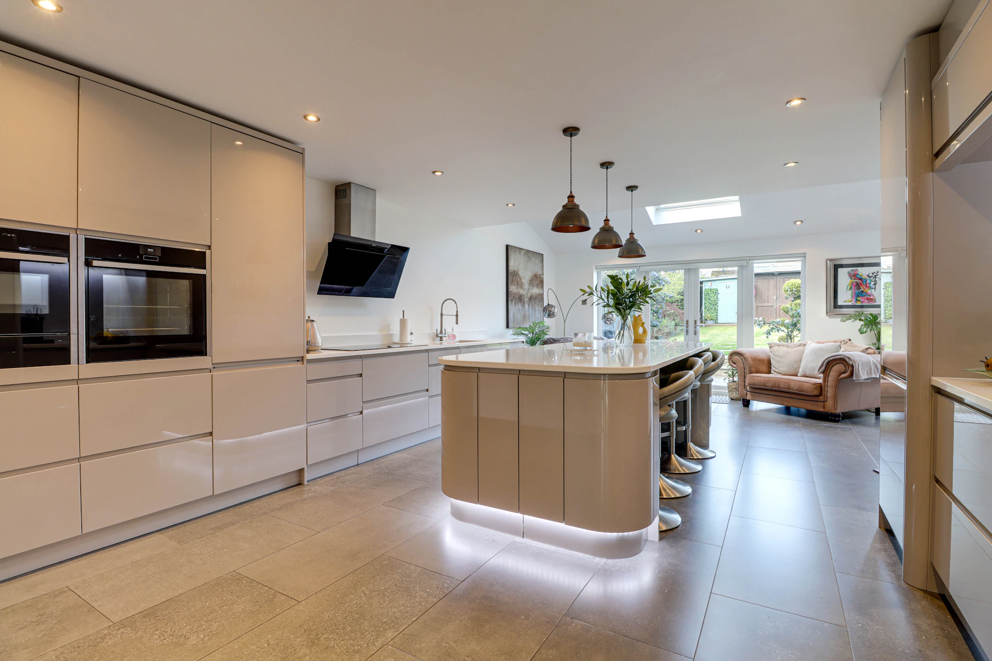 A welcoming hallway opens into a study/family room at the front of the property and a stunning open plan kitchen at the rear. The kitchen is fully fitted with a stylish range or contemporary units with integrated appliances and central island, this opens into a dining area with Velux windows and two sets of French doors opening out to the rear garden. The dining area opens into an inviting living room, a wonderful space to entertain and relax with family and friends. A cloakroom with WC and hand basin is located off the hallway and completes this level.