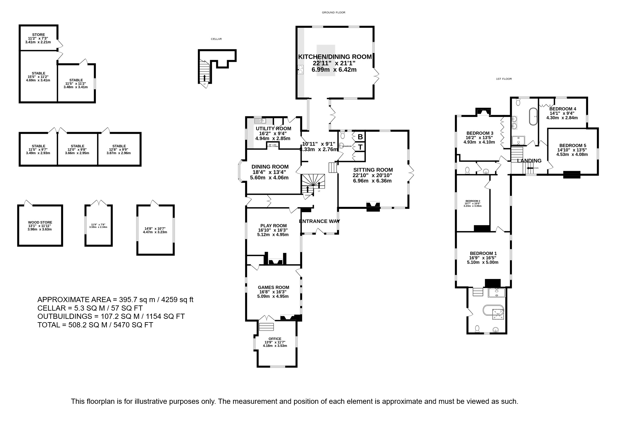Upstairs there are five bright double bedrooms. The principal bedroom has an attractive ensuite bathroom with freestanding bath and shower. The remaining bedrooms are served by a large stylish family bathroom with twin basins, freestanding bath and separate shower cubicle. There is an additional WC on this level.