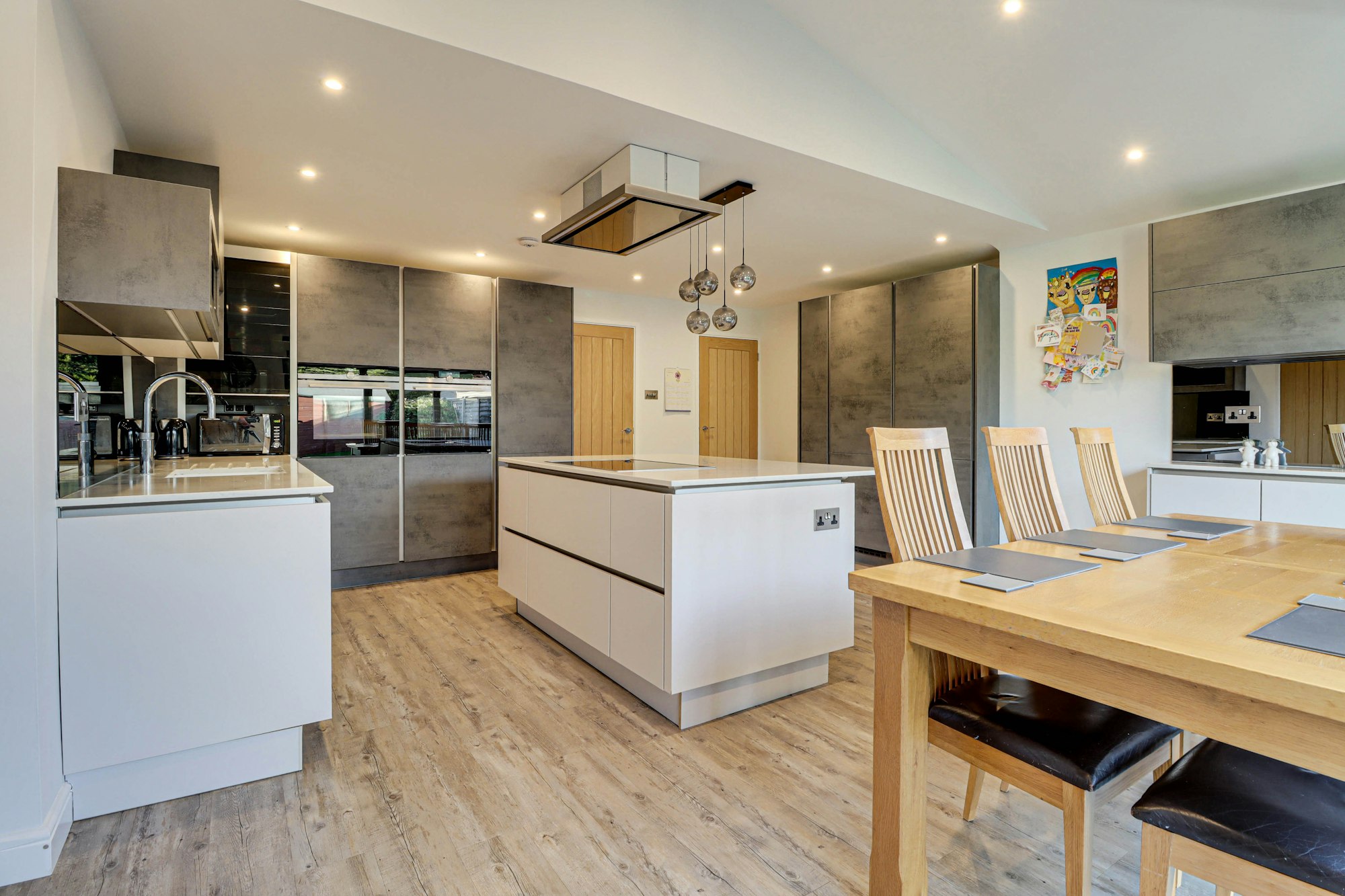 An entrance hall leads into a large living room with bay window and fireplace with log burner. A stunning open plan kitchen/dining room sits to the rear of the property. The kitchen has been fitted with a stylish range of contemporary units, with central island and integrated appliances, and space for a dining table with bi-fold doors opening out to the rear garden. A further reception room is located just off the kitchen area, currently used as a playroom/family room. A downstairs cloakroom completes this level. The garage has been converted to provide a utility room at the rear and storage area at the front.
