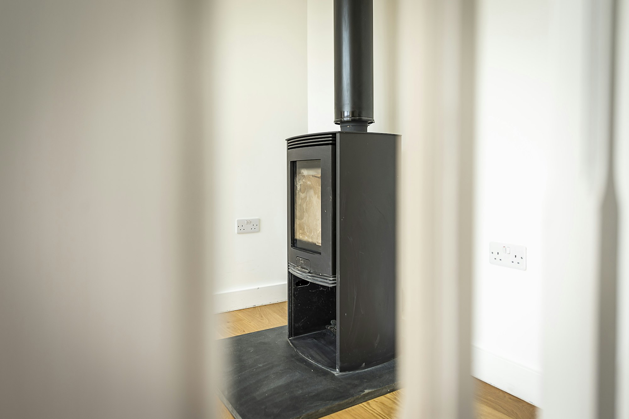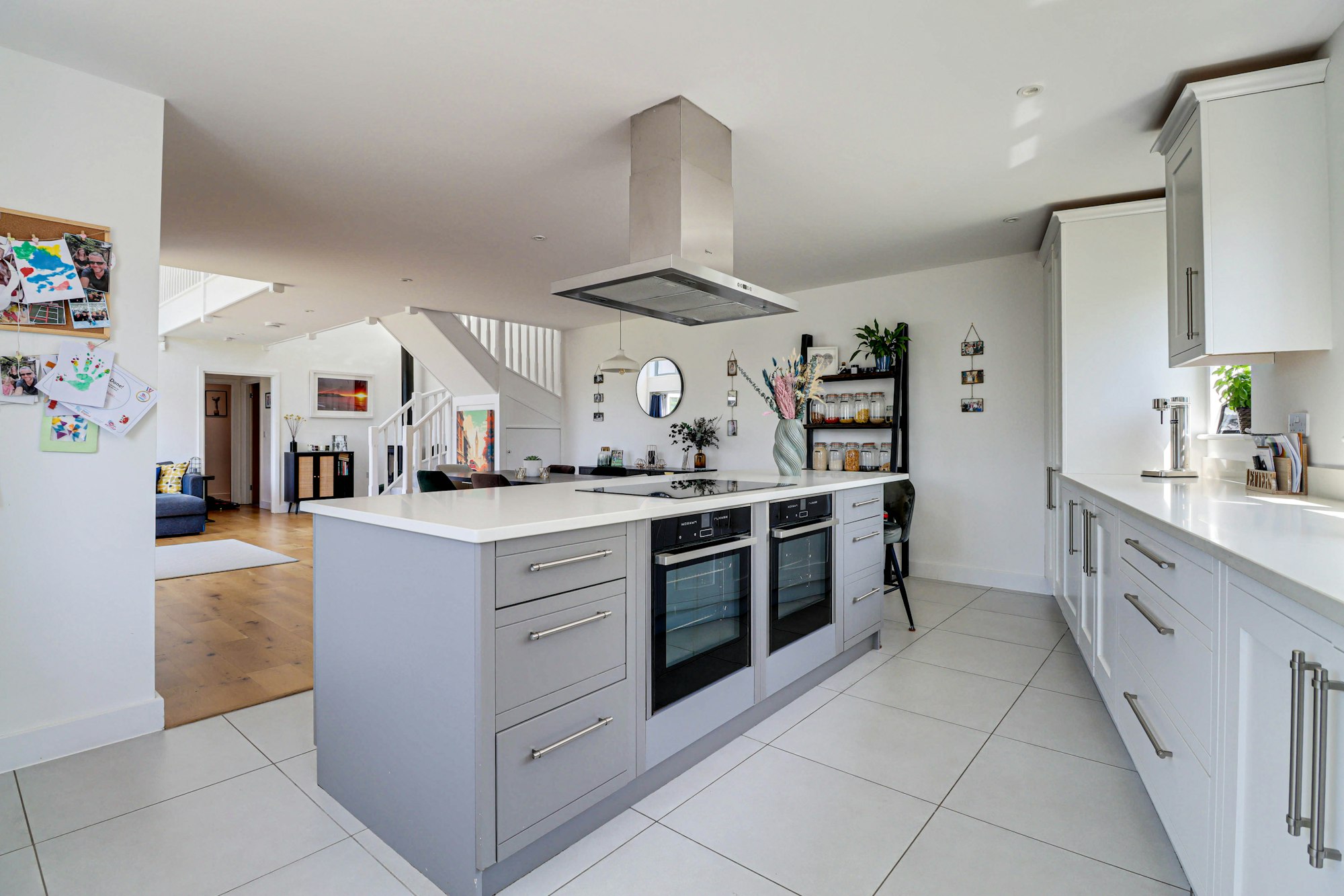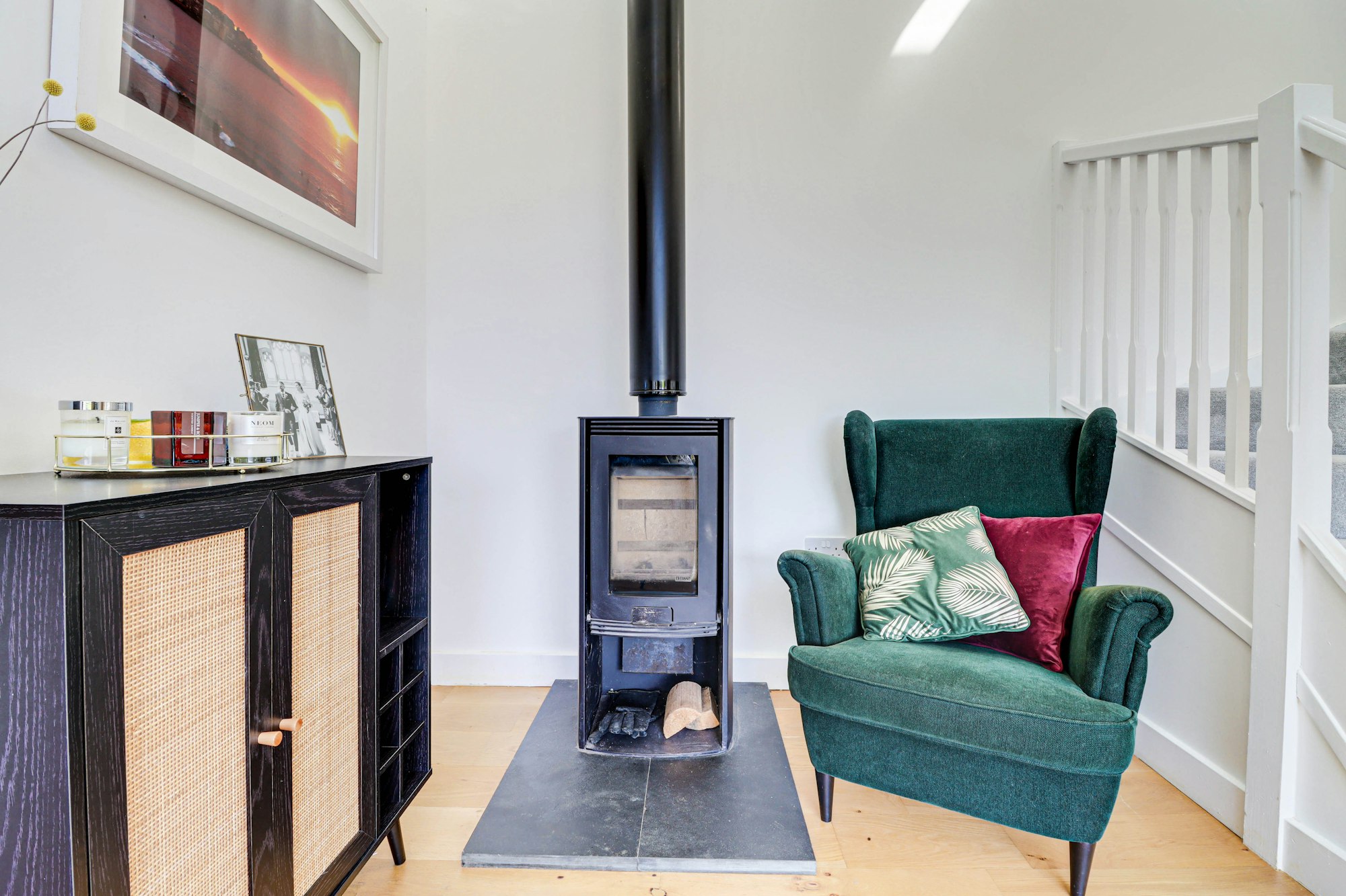 A spectacular open-plan kitchen, dining, and living space forms the centerpiece. For food lovers and entertainers, the kitchen is exceptional, designed for the serious home chef: two NEFF ovens, NEFF five-zone induction hob, three fridges including wine cooler, Quooker boiling water tap, Water2 filtration system, and expansive quartz worktops with central island. Sleek shaker-style cabinetry provides abundant storage. Di Lusso log burner ensures cosy charm in cooler months.