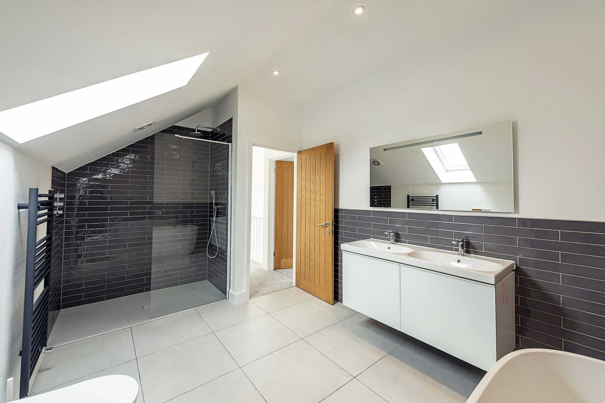 First floor: Galleried landing with vaulted ceiling creates light and space. Principal bedroom with walk-in wardrobe and stylish en-suite shower room. Two further bedrooms. Contemporary family bathroom with bath, walk-in shower, twin basins.