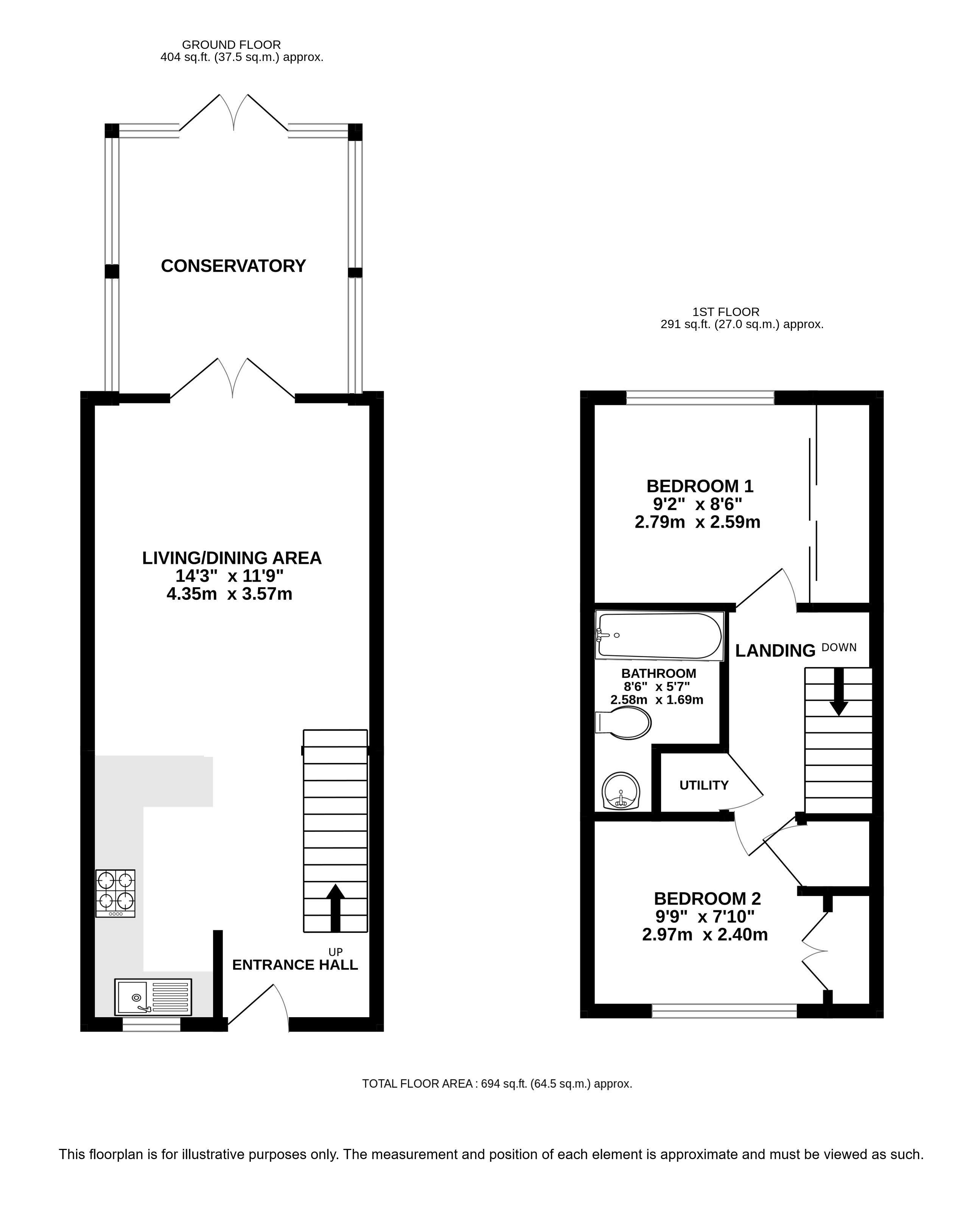 Upstairs there are two good sized bedrooms, both with fitted wardrobes, which are served by a modern tiled bathroom with three-piece suite and shower with glass screen over the bath. A useful utility cupboard on the landing is plumbed for a washer/dryer with extra drying space above).