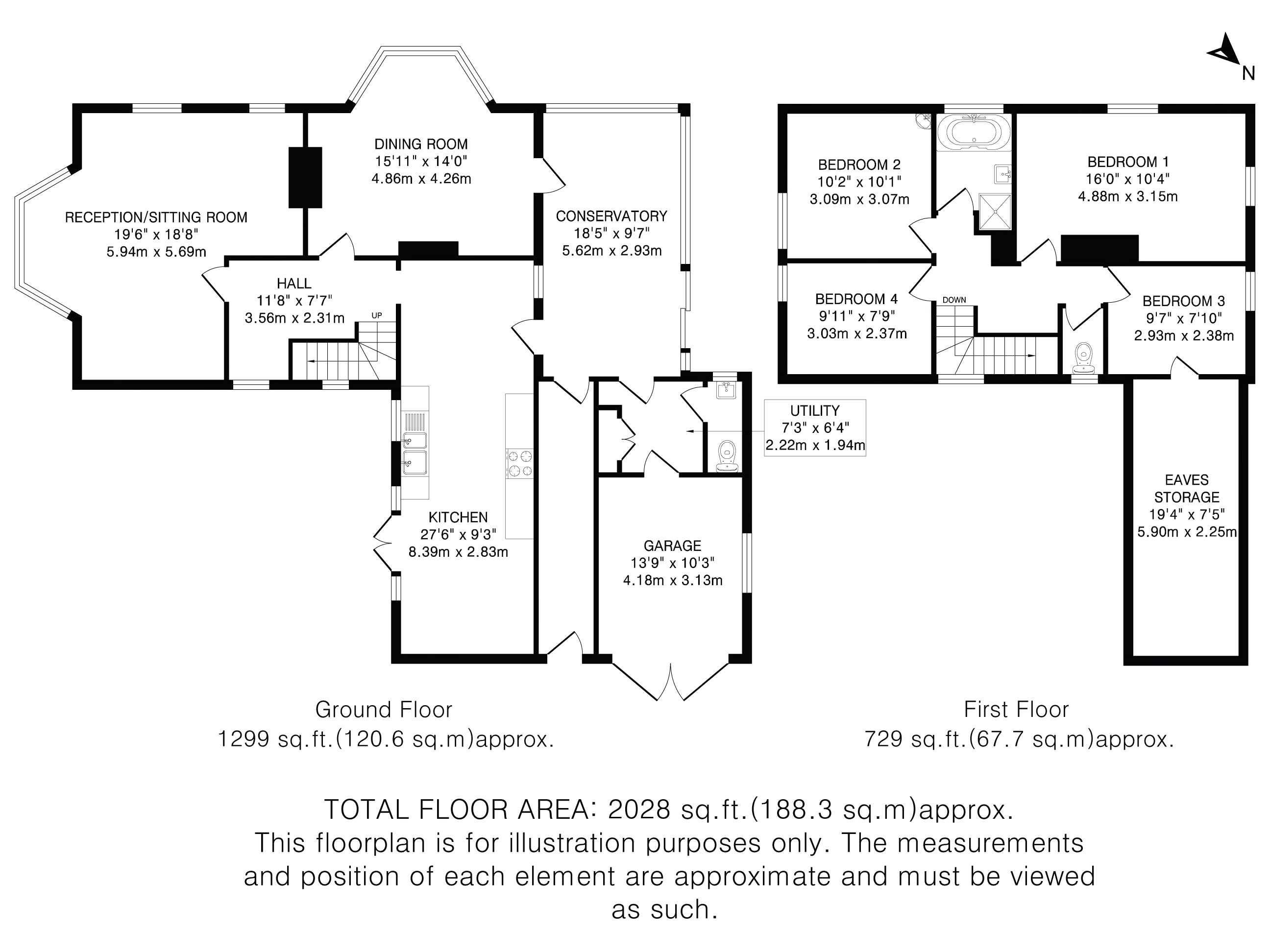Upstairs, four bright bedrooms are served by a four-piece family bathroom and a large eaves storage area is accessed from the third bedroom.
