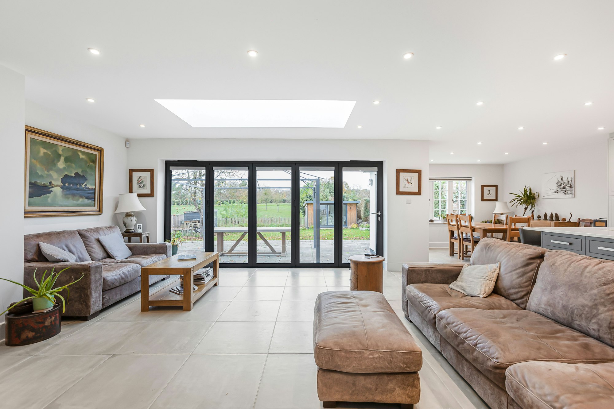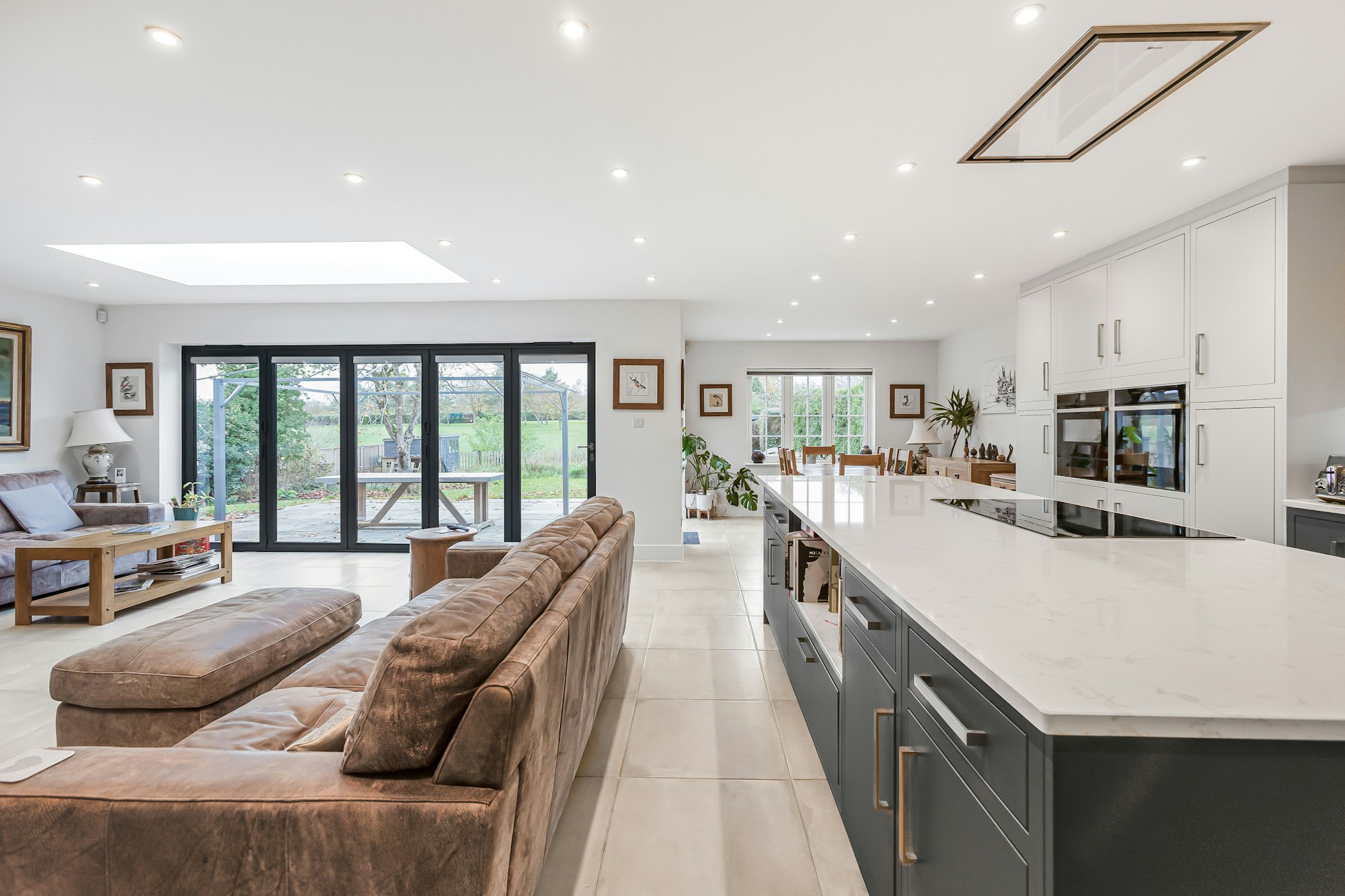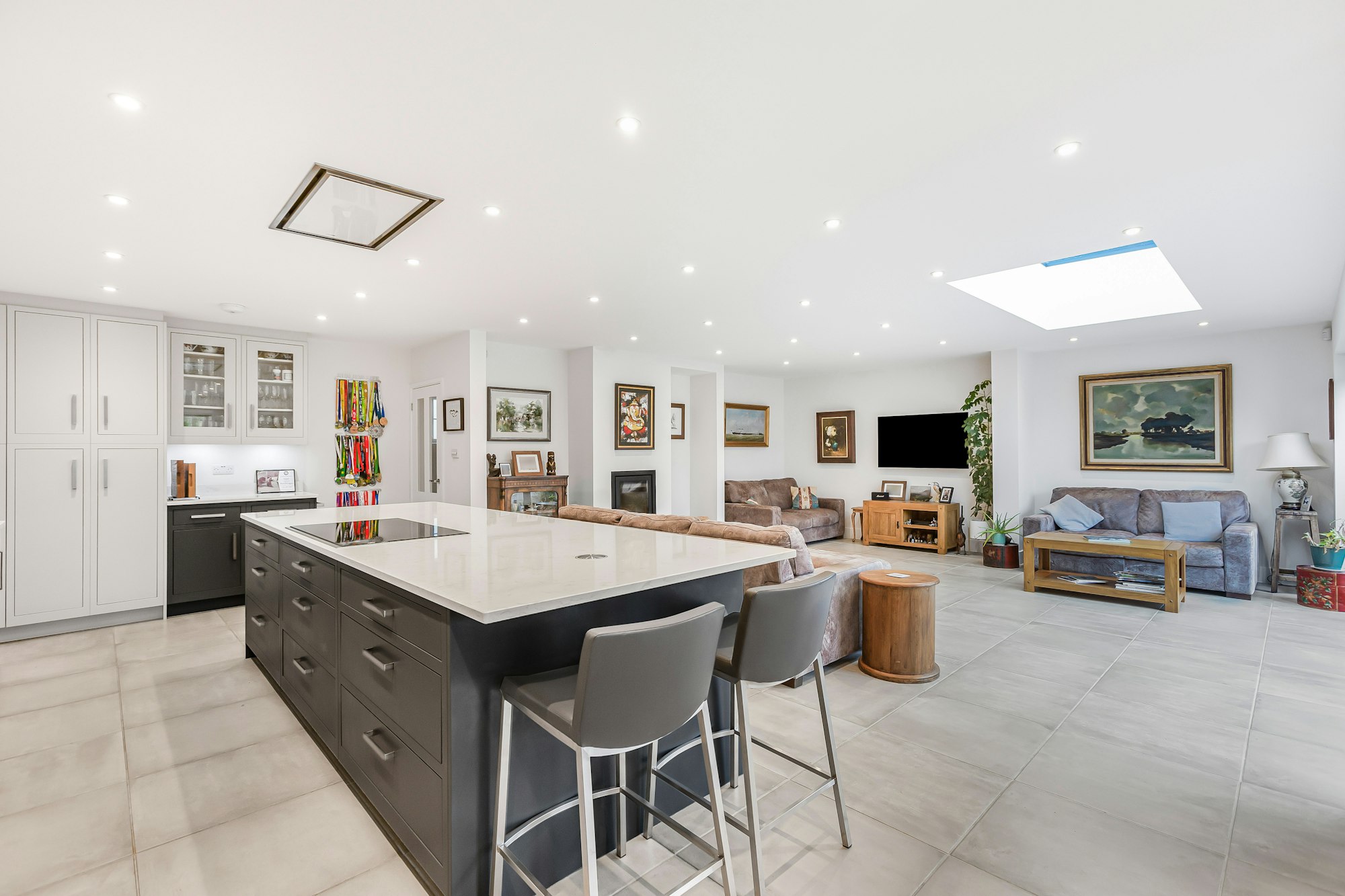 The expansive, open-plan kitchen/living/dining room is the heart of this superb family home. The wonderfully stylish, bright living space grants access to the beautiful rear garden via two sets of modern bi-folding doors and boasts a substantial kitchen island and a sleek wood-burning stove. A generous utility room is located adjacent to the kitchen.