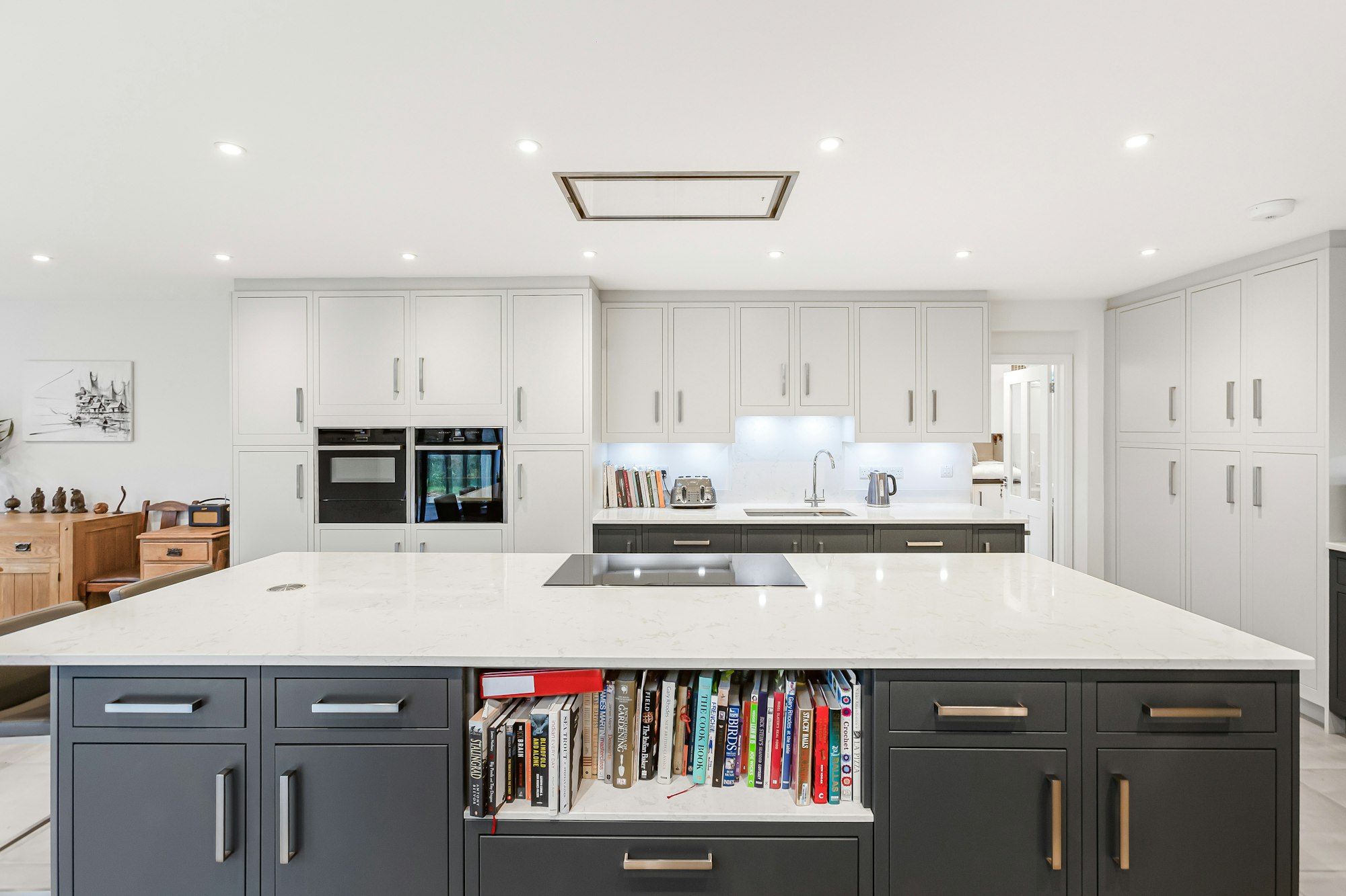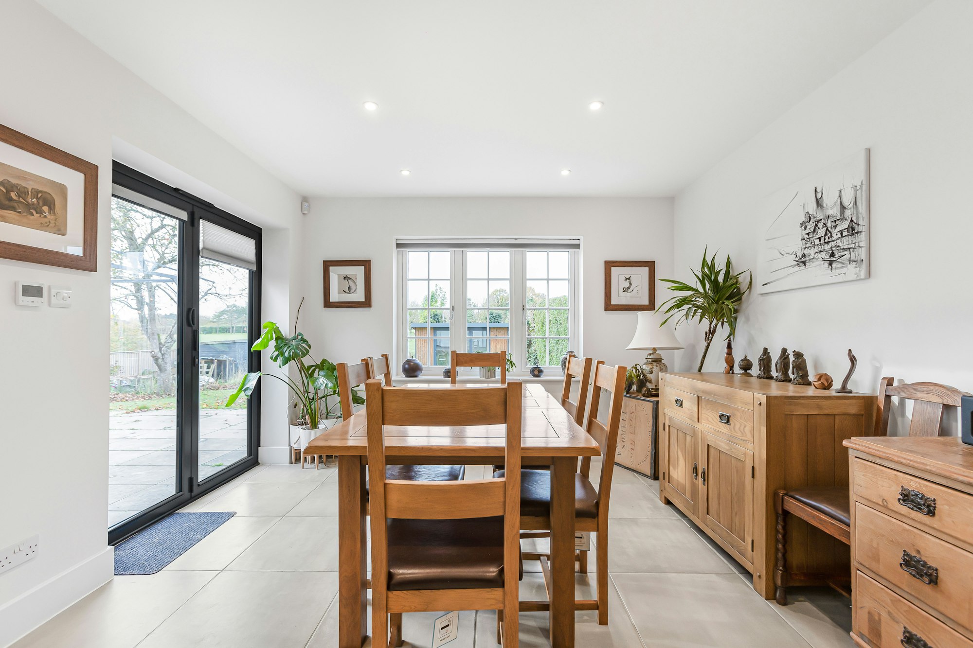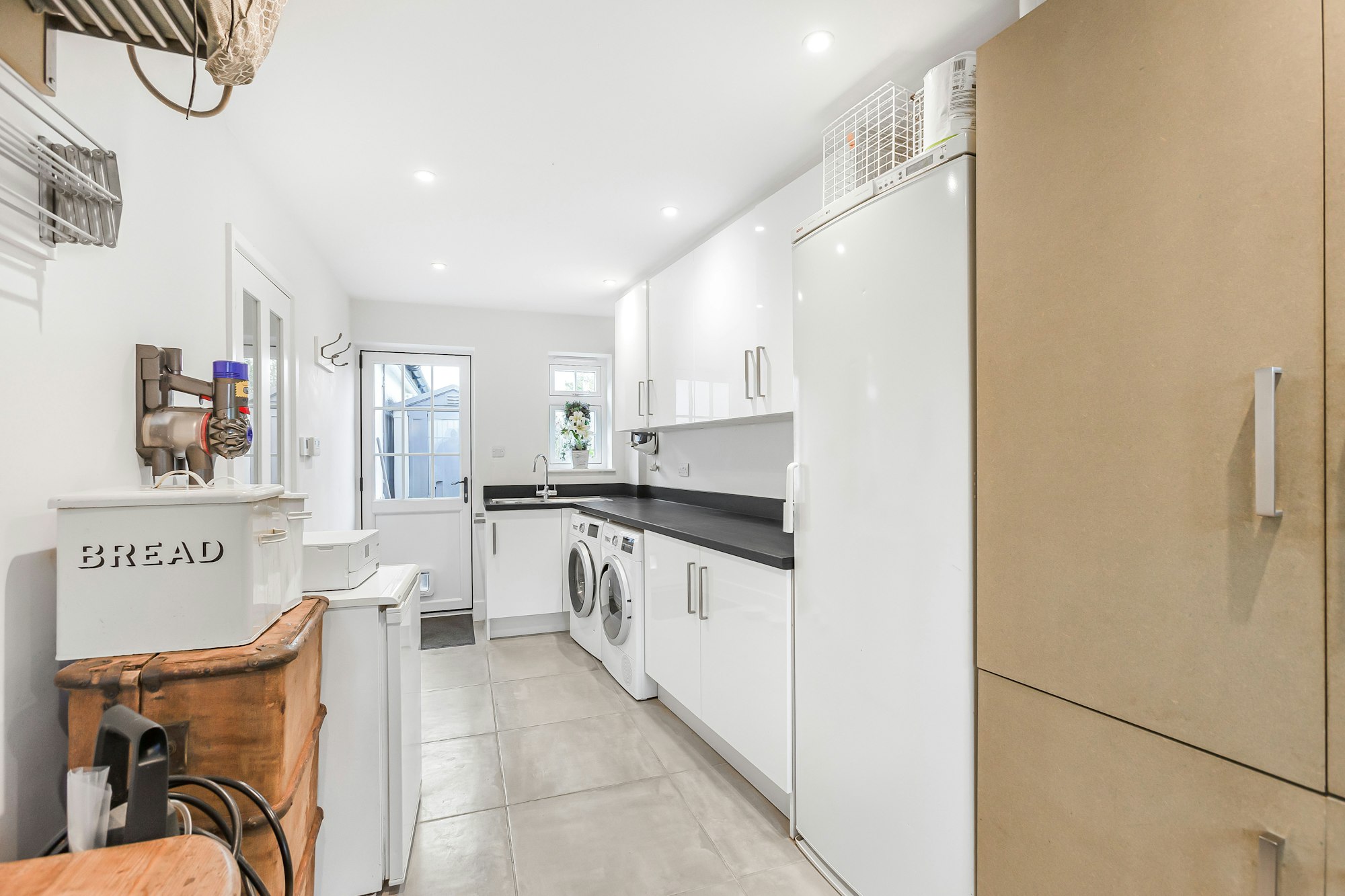 The expansive, open-plan kitchen/living/dining room is the heart of this superb family home. The wonderfully stylish, bright living space grants access to the beautiful rear garden via two sets of modern bi-folding doors and boasts a substantial kitchen island and a sleek wood-burning stove. A generous utility room is located adjacent to the kitchen.