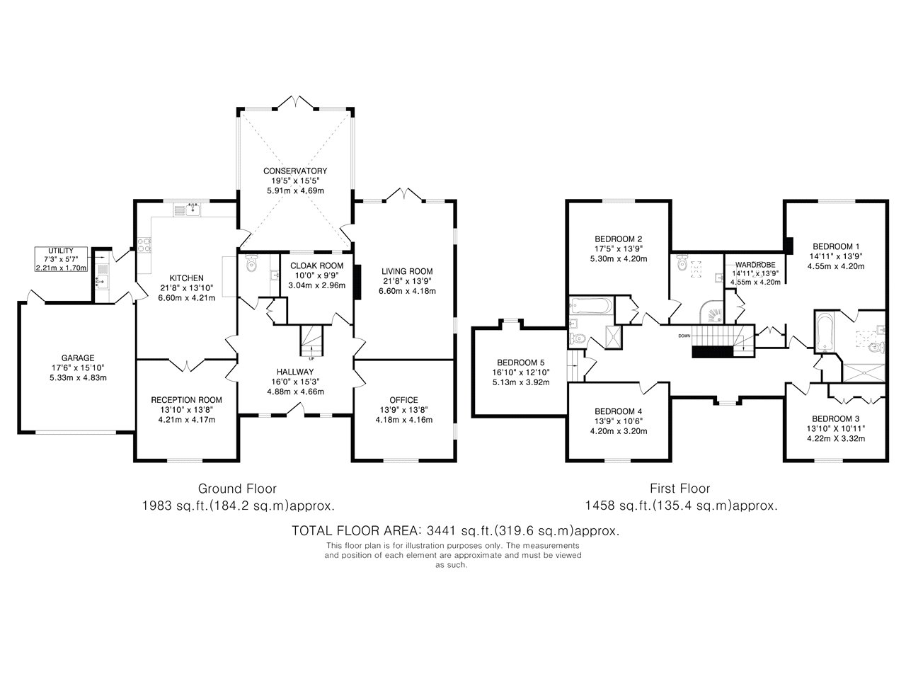 On the first floor, a galleried landing offers access to the principal bedroom suite which overlooks the rear garden and boasts a spacious en-suite bathroom and dressing room. The guest bedroom also enjoys garden views and has fitted wardrobes and an en-suite shower room. The remaining three double bedrooms all benefit from fitted wardrobes and are served by a well-appointed family bathroom.