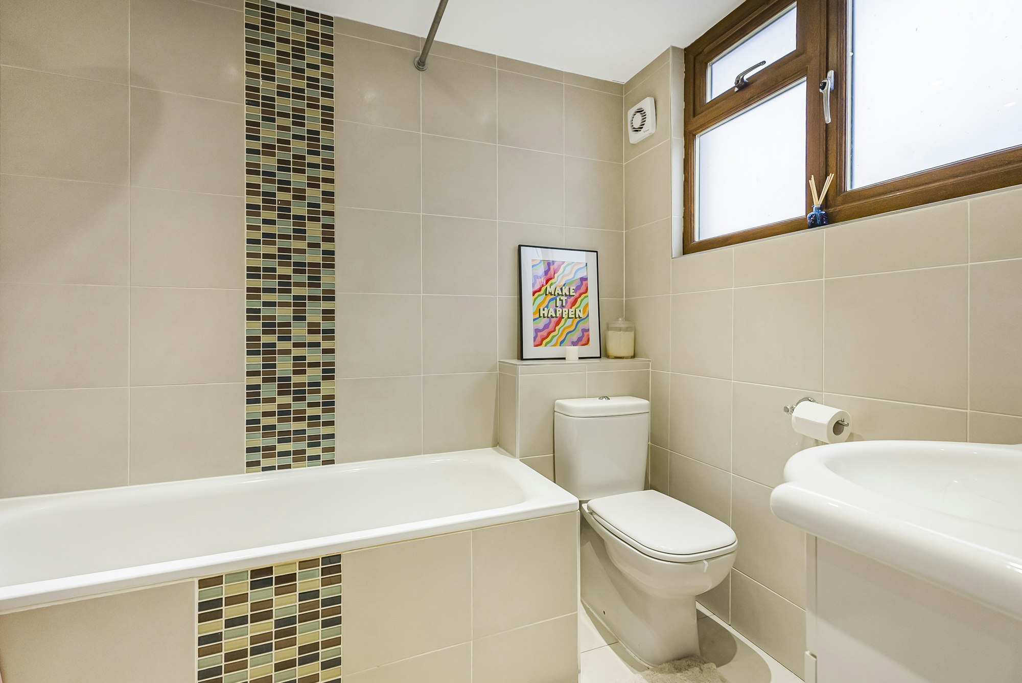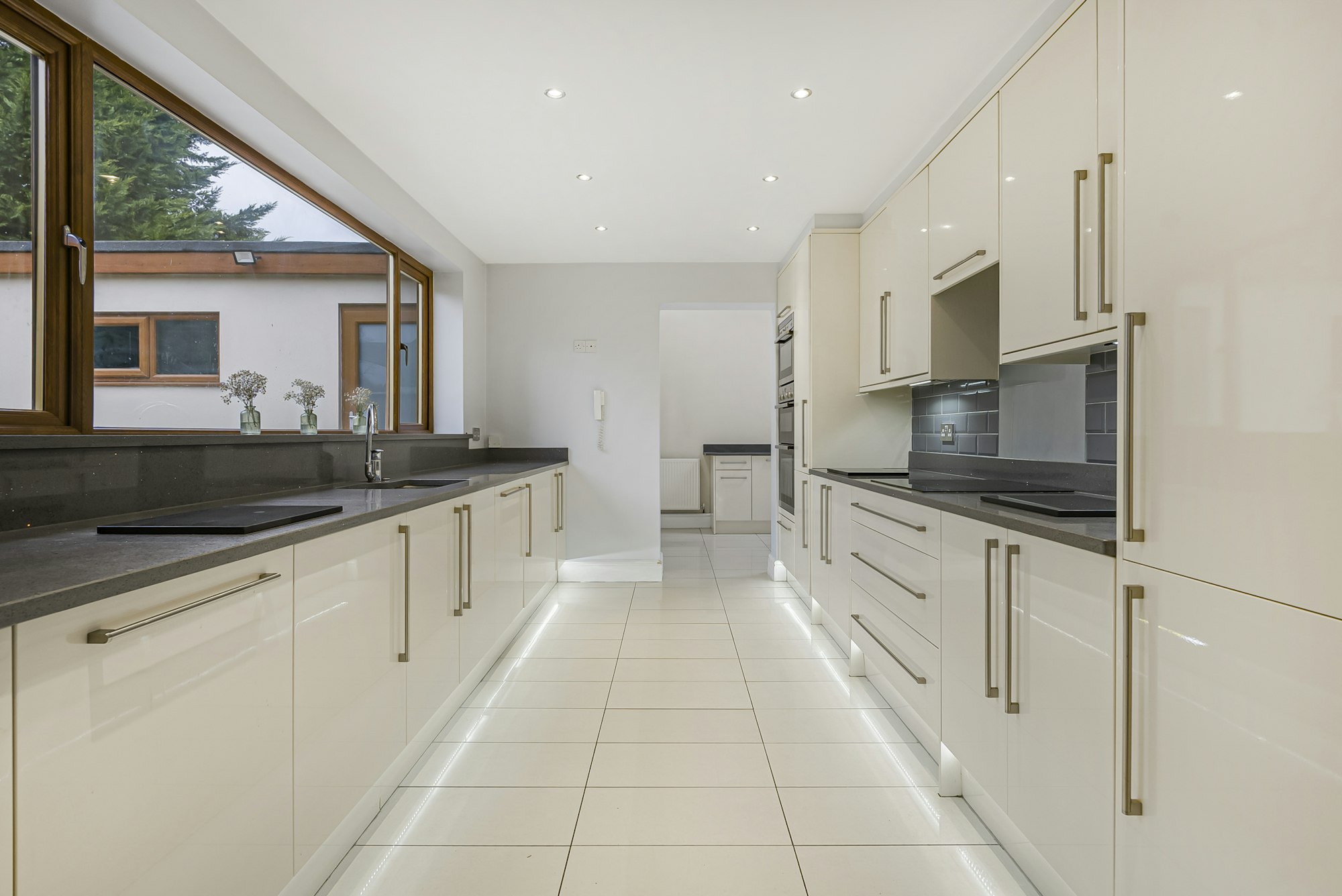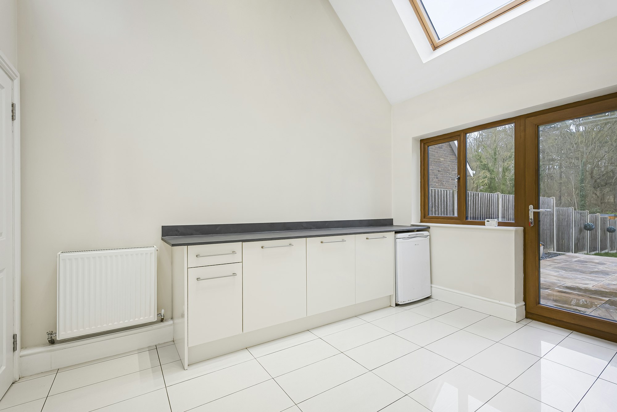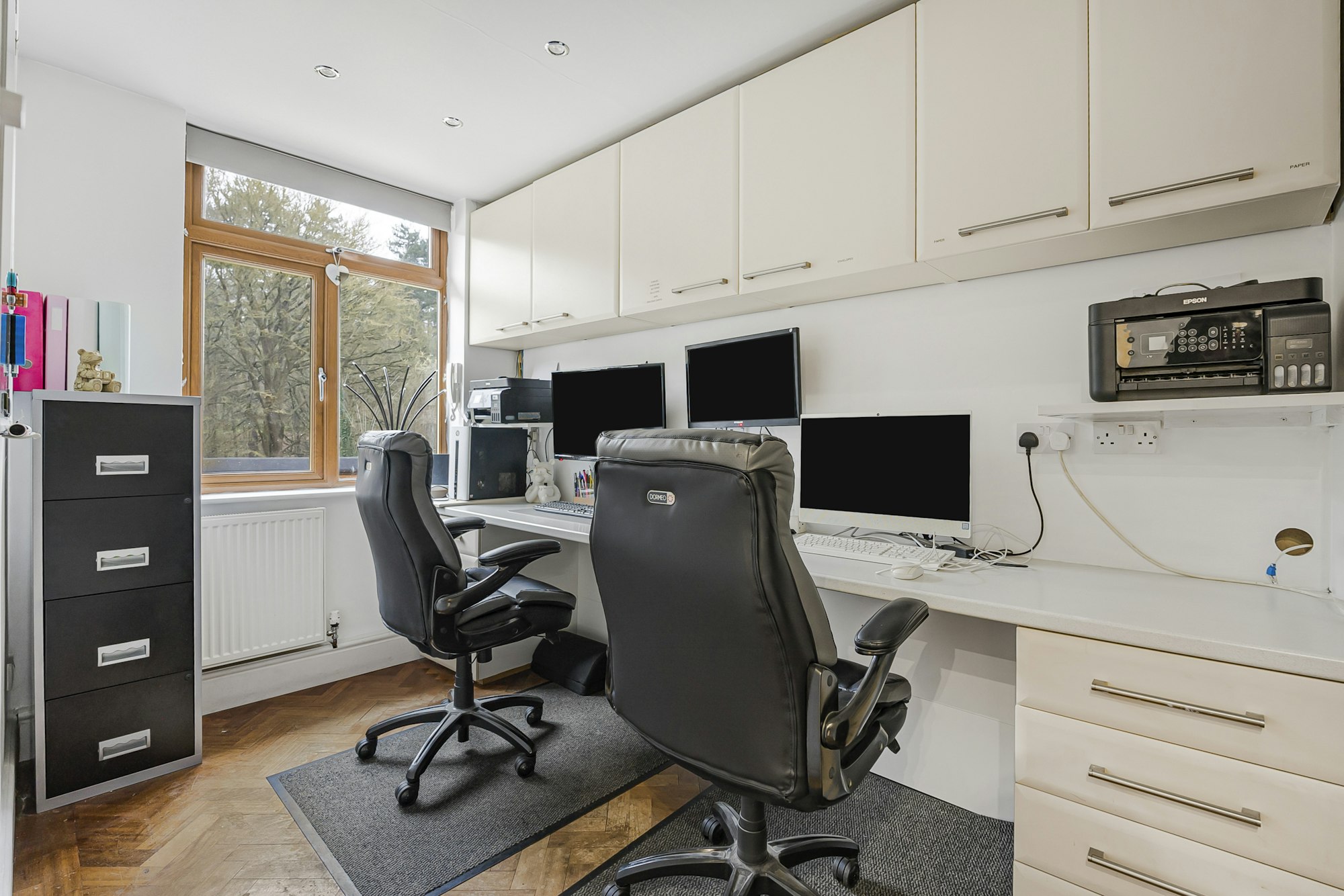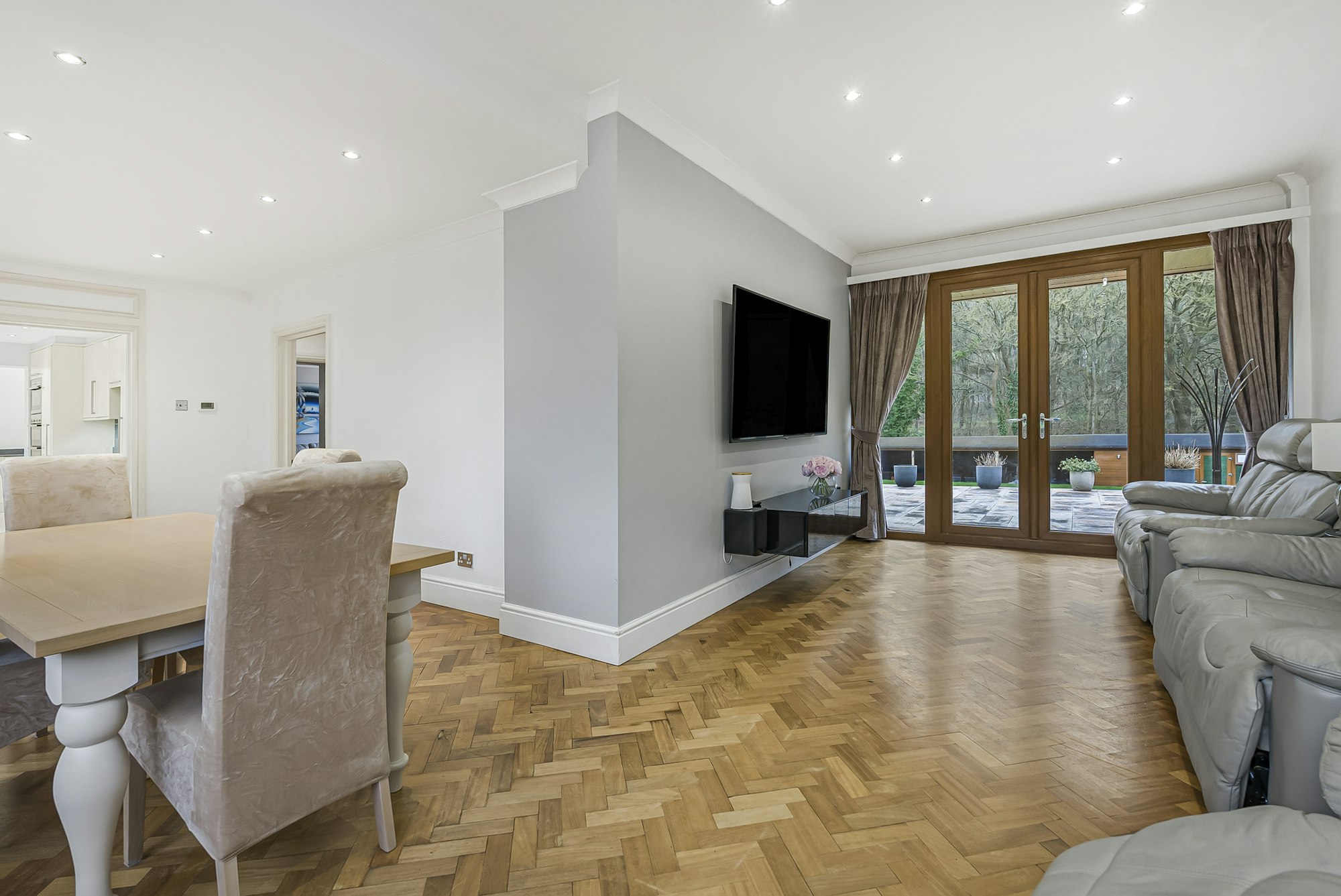 A bright, sizeable vestibule leads into a generous reception/dining room, with beautiful, original parquet flooring. Stylish French doors, flanked by tall windows at the rear of the room, offer a fabulous view of the woodland beyond the rear garden, which has established pathways leading to the historic Hatfield House and gardens. Natural light floods the dining area and the kitchen, thanks to especially large windows along with high ceilings, contribute to a marvellous feeling of space on the ground floor. The bright, modern fitted kitchen leads through into a substantial utility room with two tall, deep cupboards and an external door opening out onto the rear garden's vast patio. A cosy living room at the rear of the property, benefits from French doors leading out onto the patio. A home office and a downstairs W/C are located at the foot of the stairs.