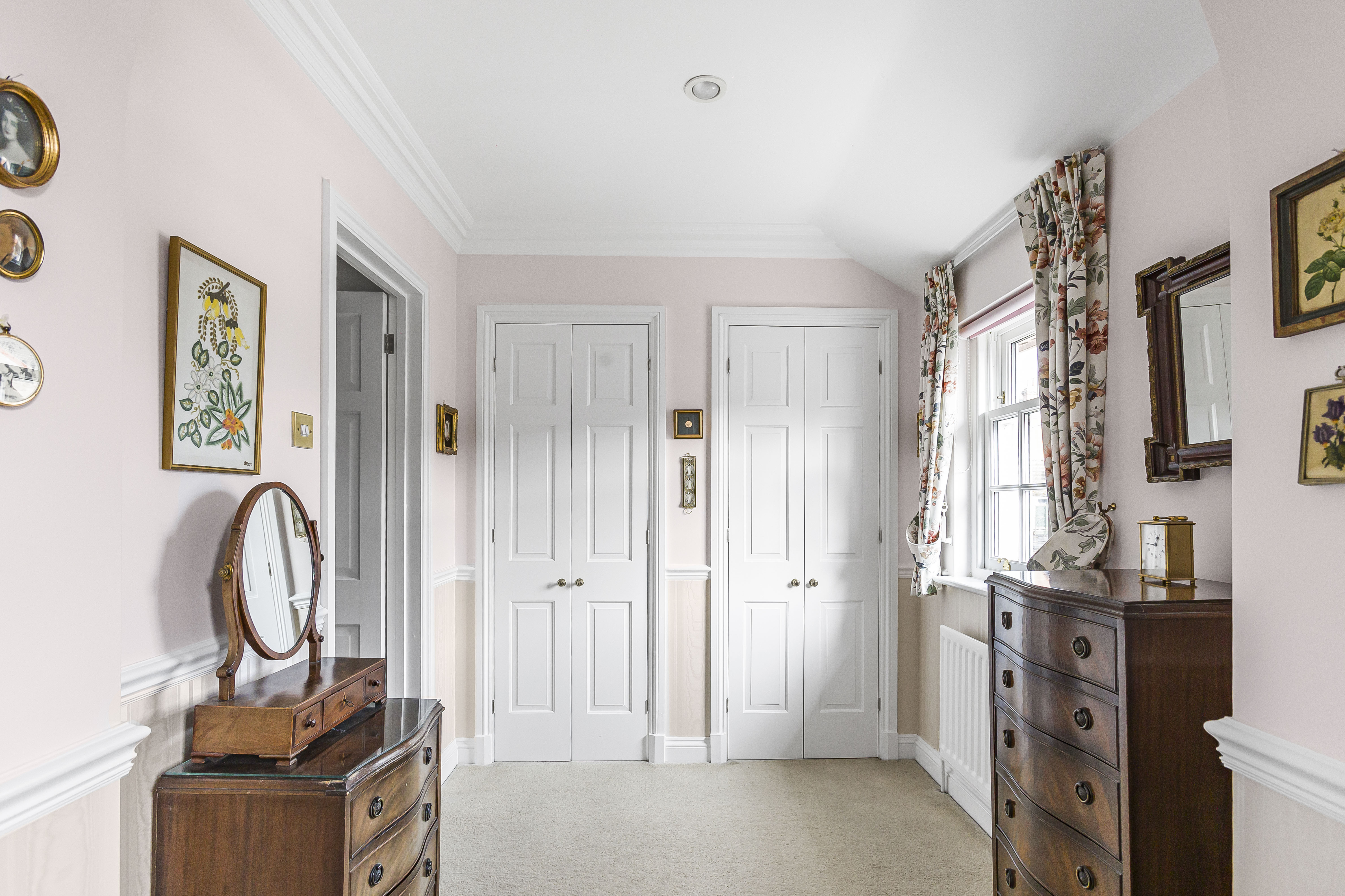 Upstairs, the huge main bedroom at the rear of the property is exceptionally bright. It boasts a large en-suite bath and shower room with a heated towel rail and a broad vanity unit. In addition, this truly beautiful bedroom benefits from fitted wardrobes and cupboards. Off the broad landing, a family bathroom serves two further generous bedrooms at the front of the property, both of which have fitted wardrobes and cupboards.