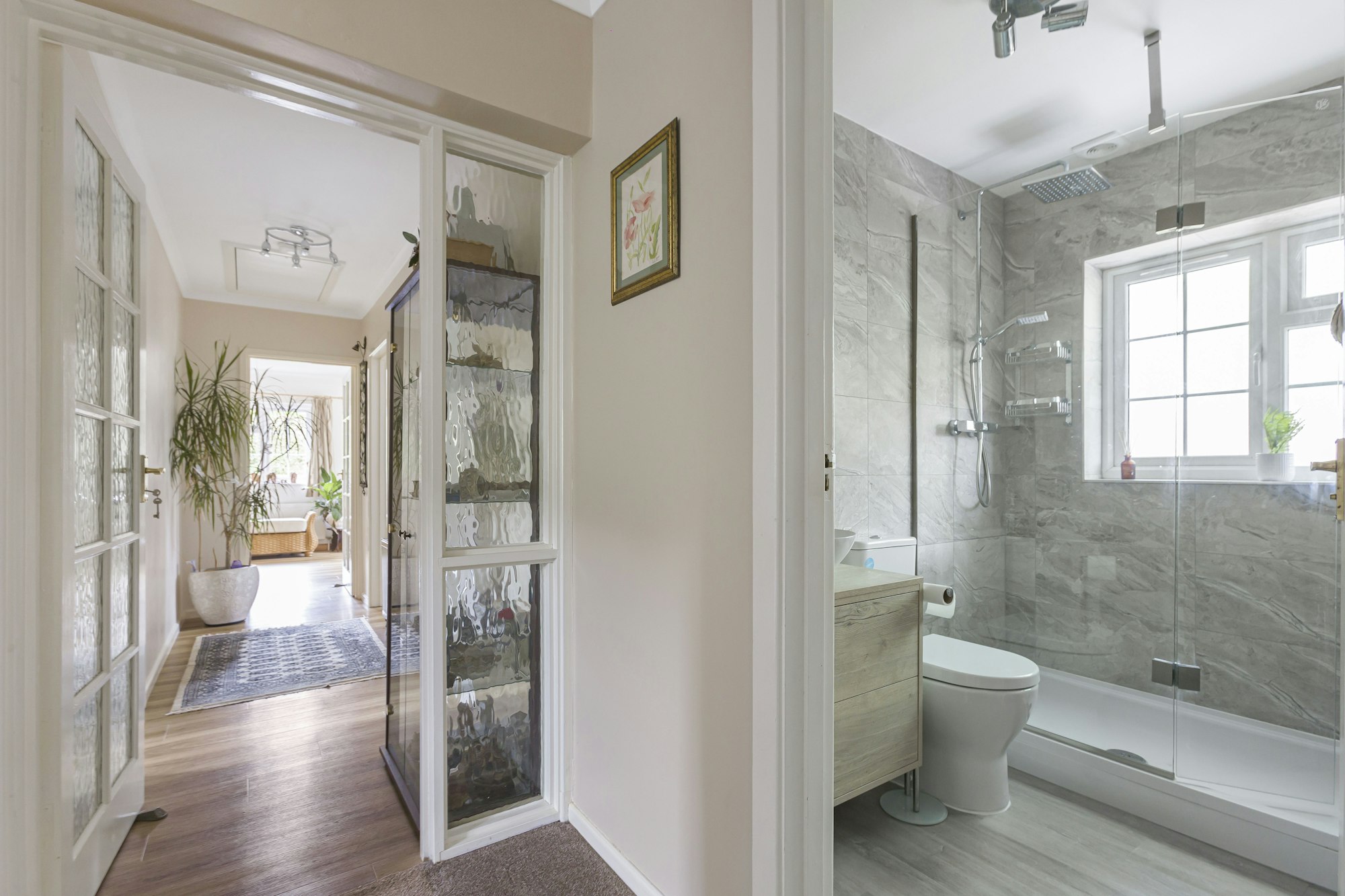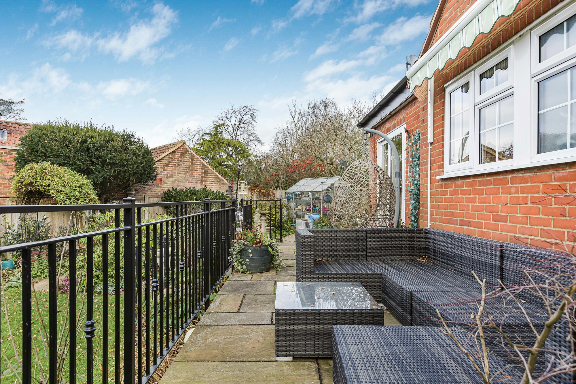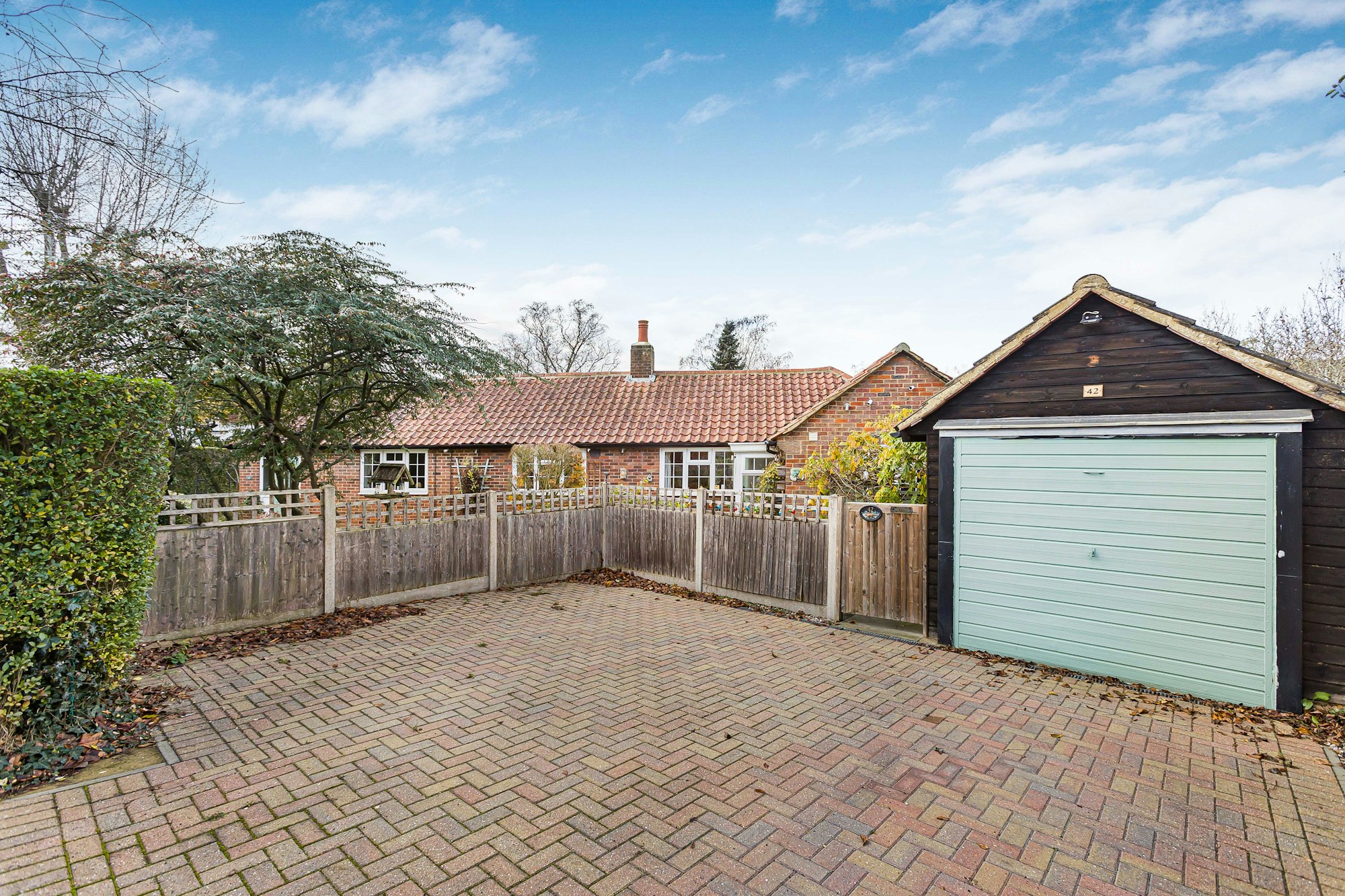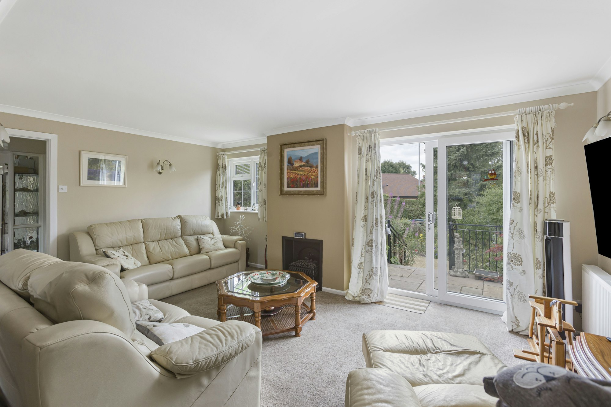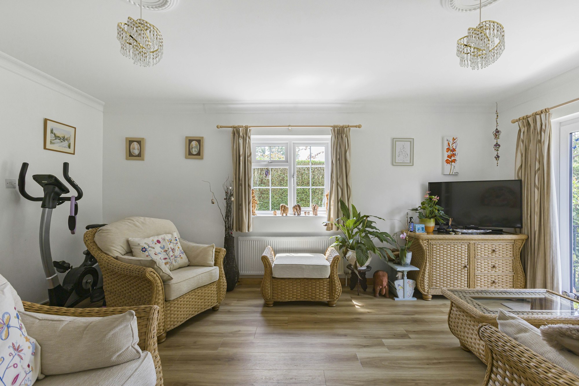 The main entrance to the bungalow is via a porch which leads directly into a spacious, dual-aspect reception room with patio doors leading out onto a pretty patio and garden beyond. The hallway is accessed from this bright room, presenting doors to the left to a kitchen, family bathroom and separate shower room, with two bedrooms opposite, the largest of which benefits from two deep fitted double wardrobes.
