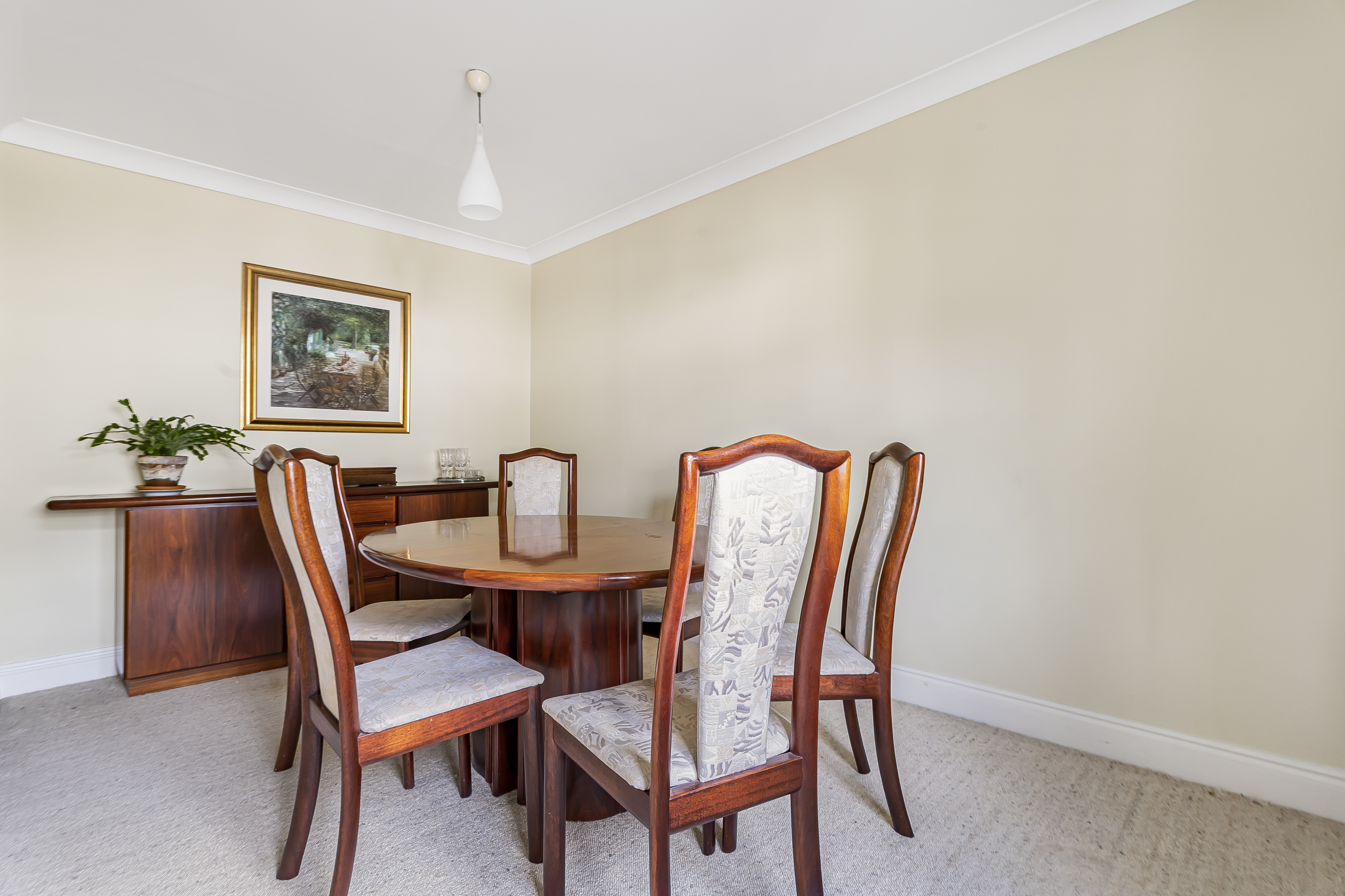The formal dining room is perfectly proportioned - an ideal space for entertaining, comfortably accommodating a large dining table with ample room for additional furniture. A front-facing window fills the room with natural light, creating a warm and inviting atmosphere.