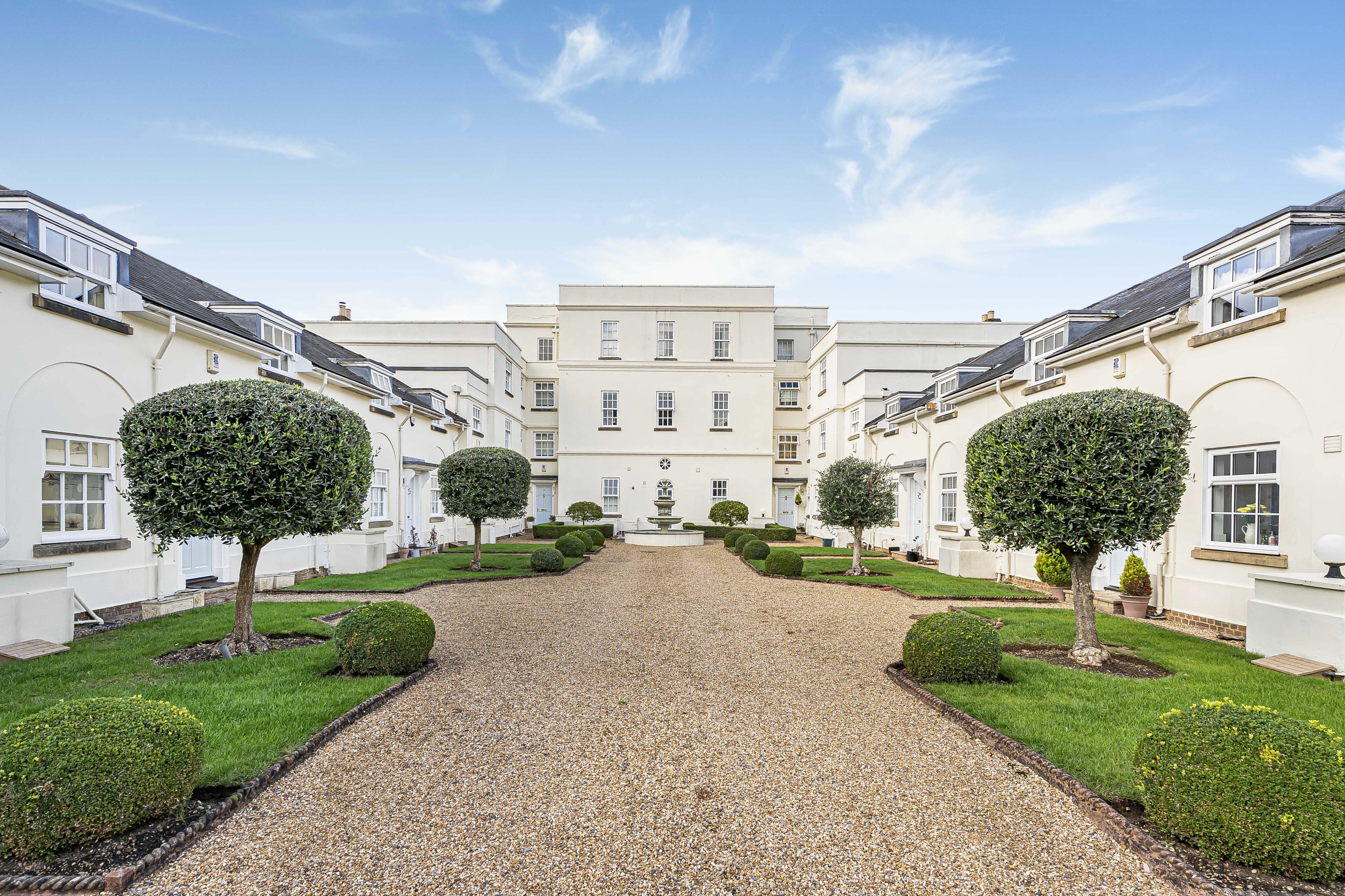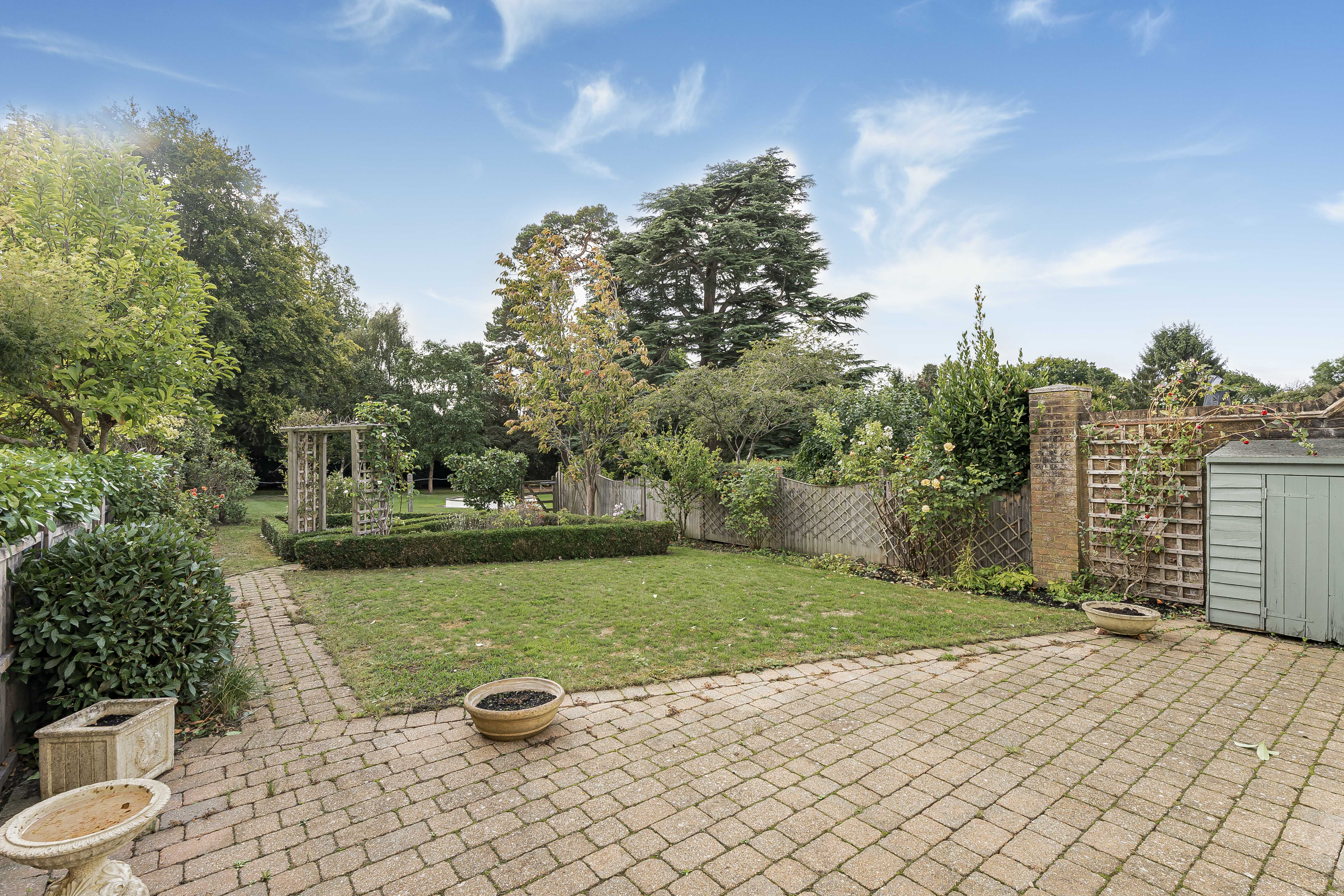 To the rear, a generously sized garden has been thoughtfully landscaped with geometric hedging, large flower beds, and interwoven lawn and block-paved pathways. A private gate provides direct access to the stunning 9-acre grounds of Danesbury Park - featuring mature trees, two elegant fountains, and a magnificent Cedar of Lebanon.