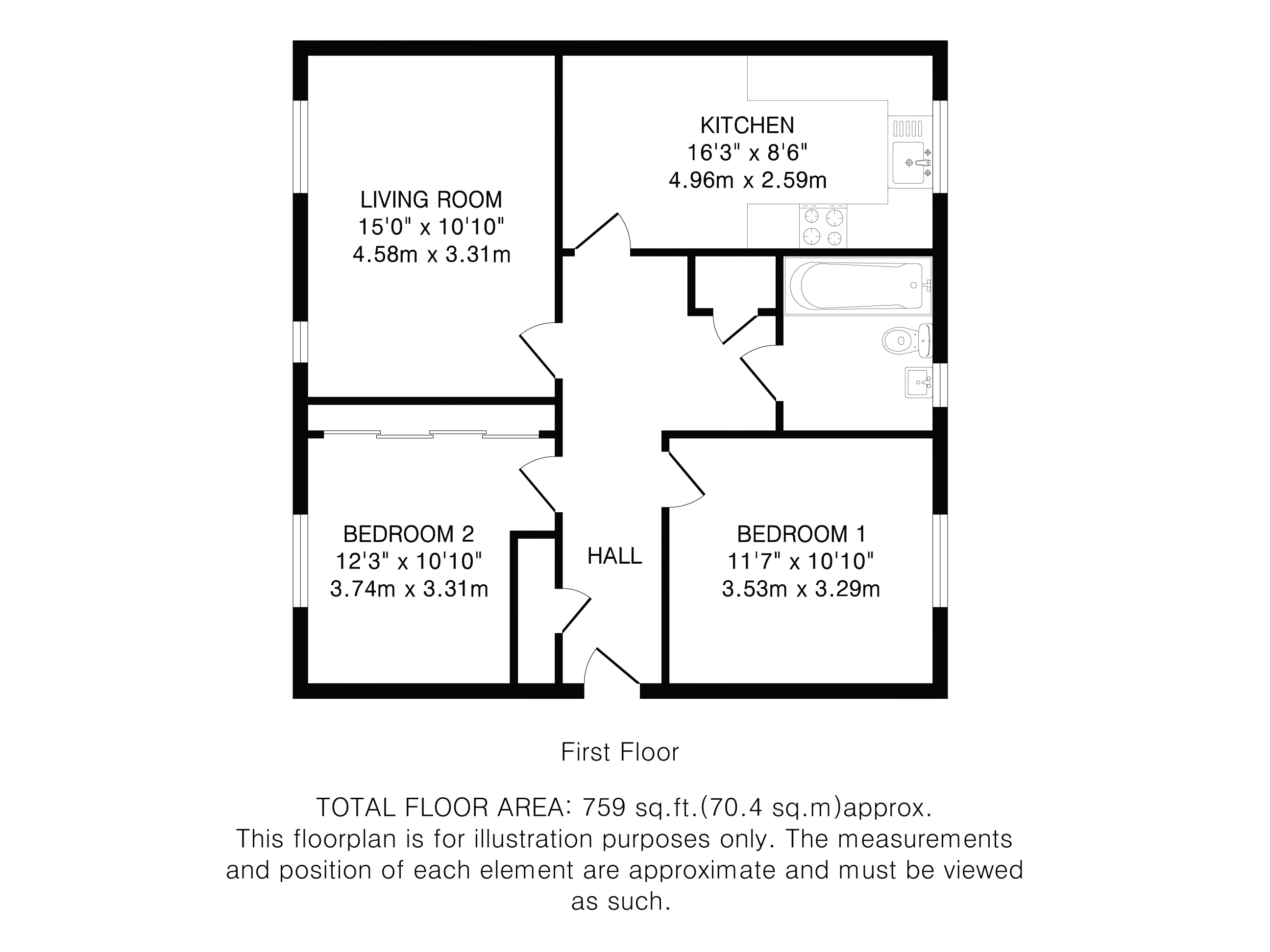 A welcoming hall benefits from two tall, useful cupboards. Two double bedrooms - one with generous fitted wardrobes - are served by a stylish, fully-tiled bathroom. A large, bright living room and a good-size fitted kitchen are located side-by-side beyond the bedrooms.