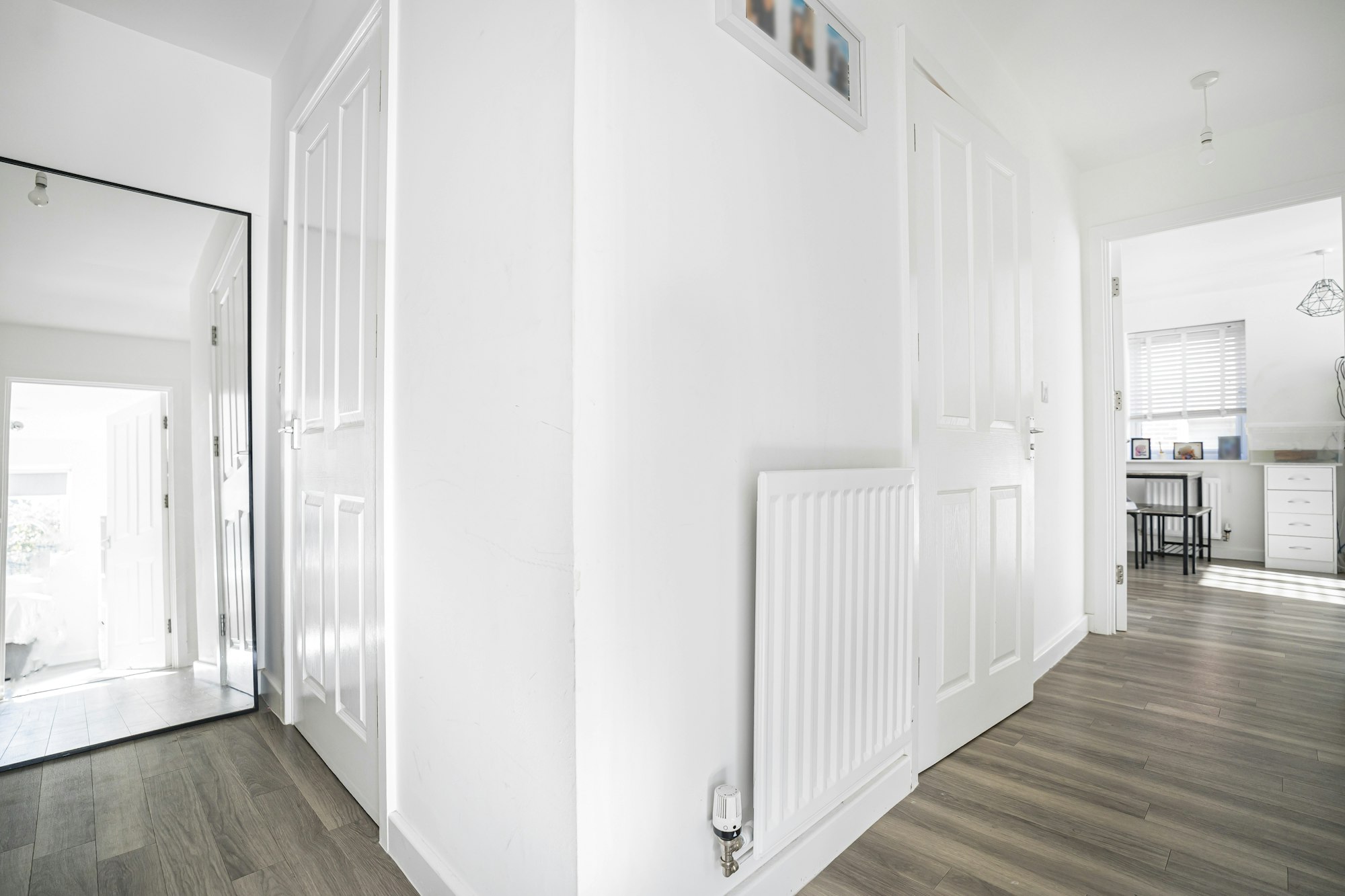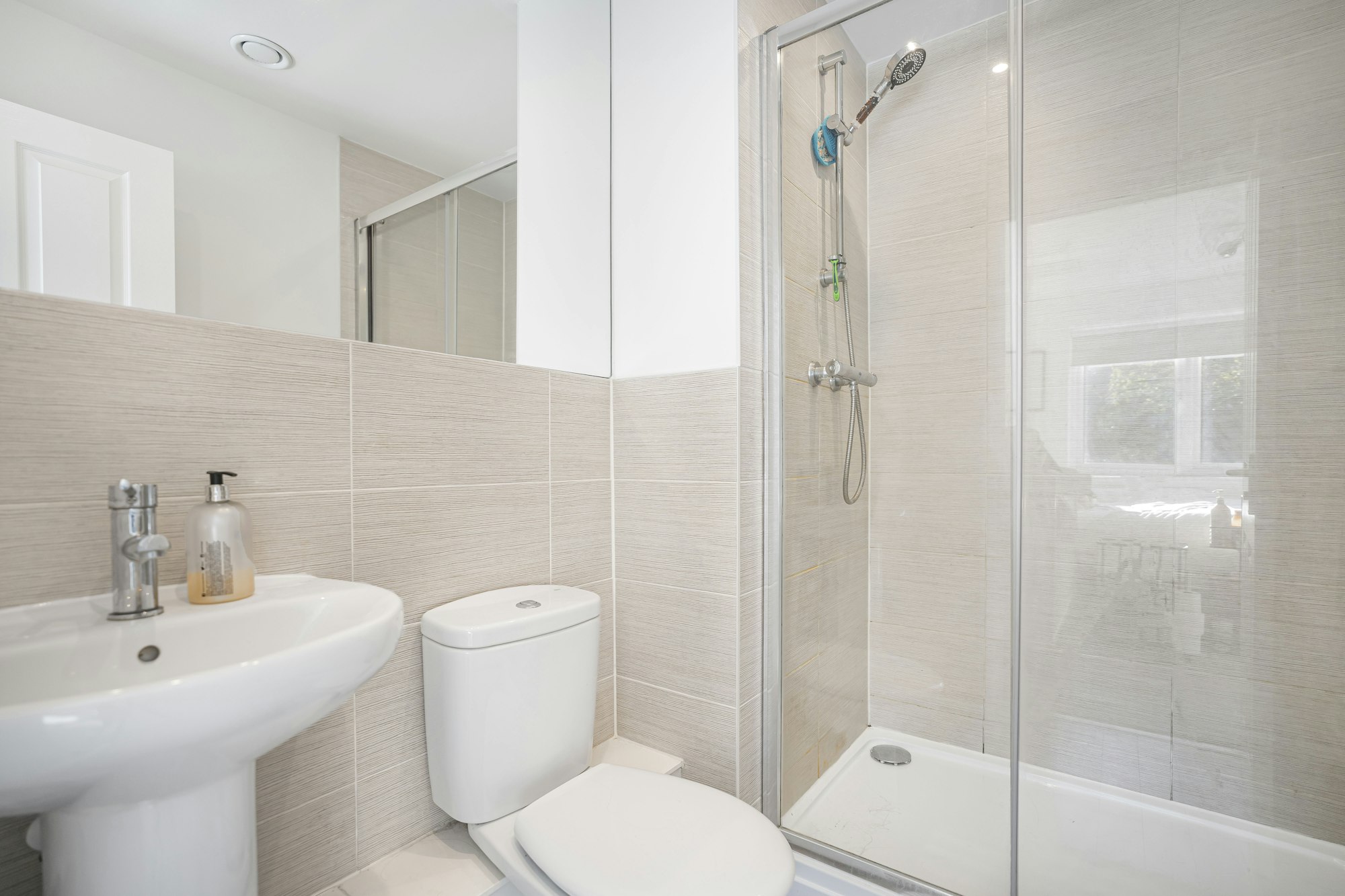The principal bedroom features built-in wardrobes and a sleek en-suite shower room, while the second generously sized double bedroom is served by a pristine family bathroom with a modern white three-piece suite.